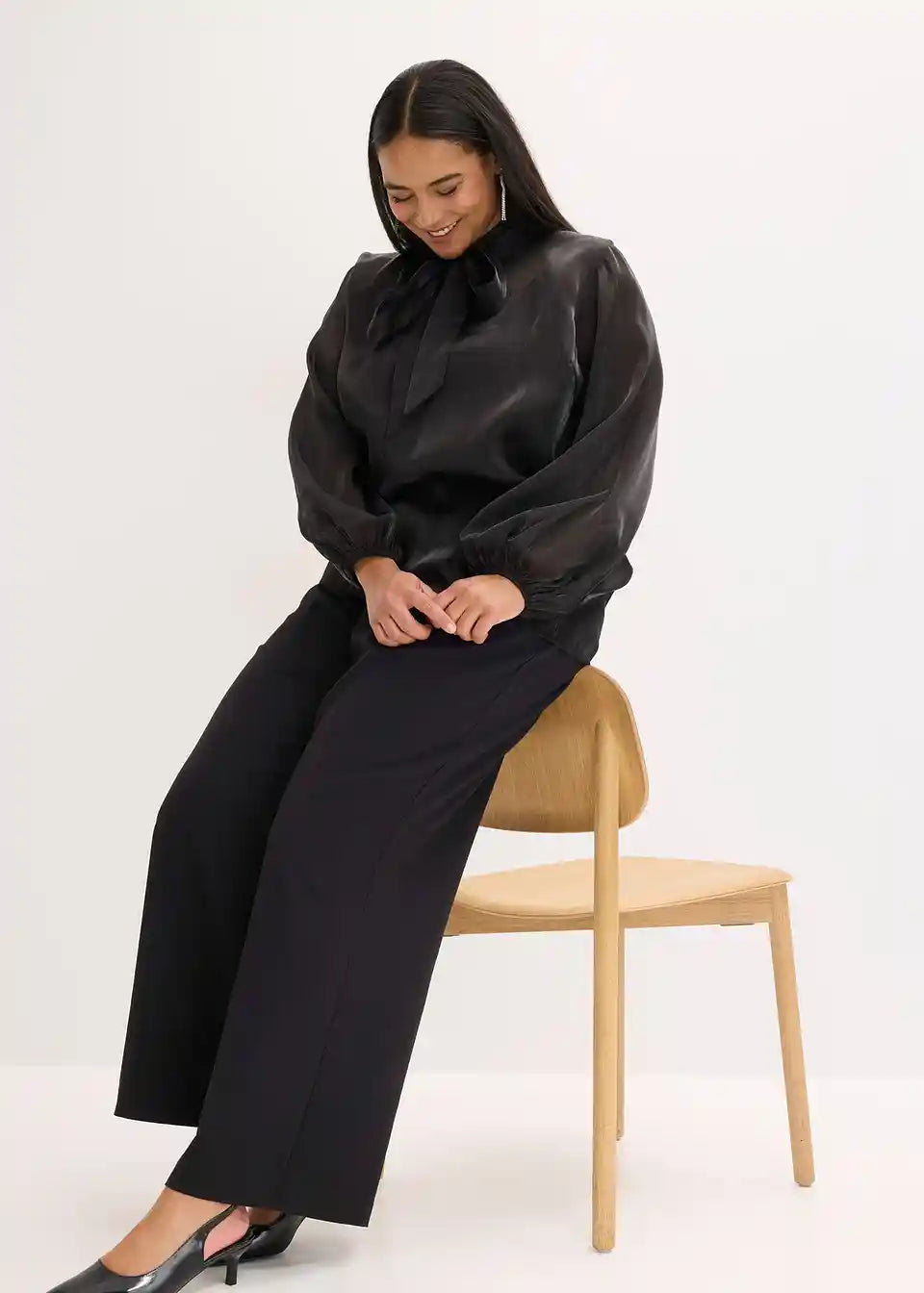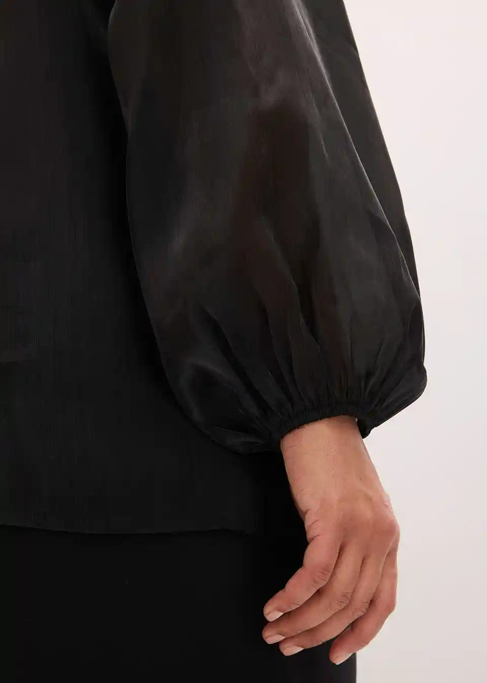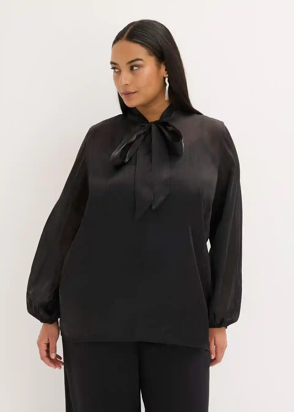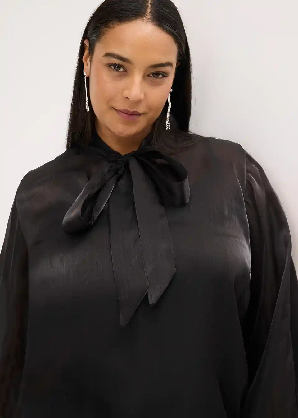 Sodobna in ženstvena bluza brez zapenjanja iz sijočega tila z vrvico na ovratniku