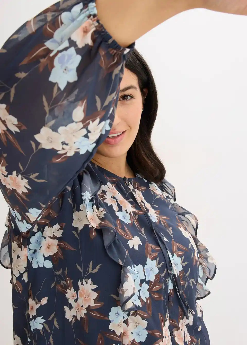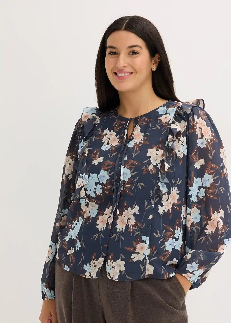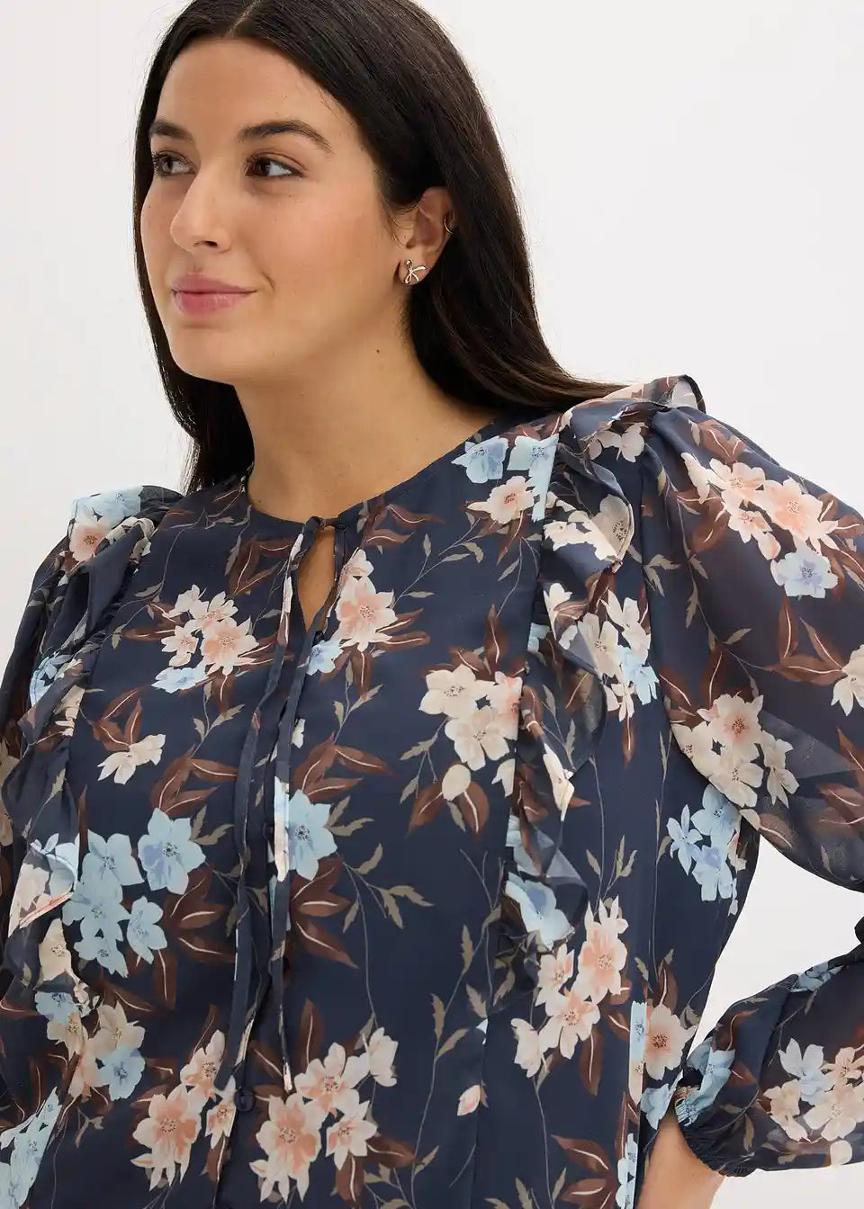 Udobna bluza iz šifona s trakom za zavezovanje, gumbi in volani