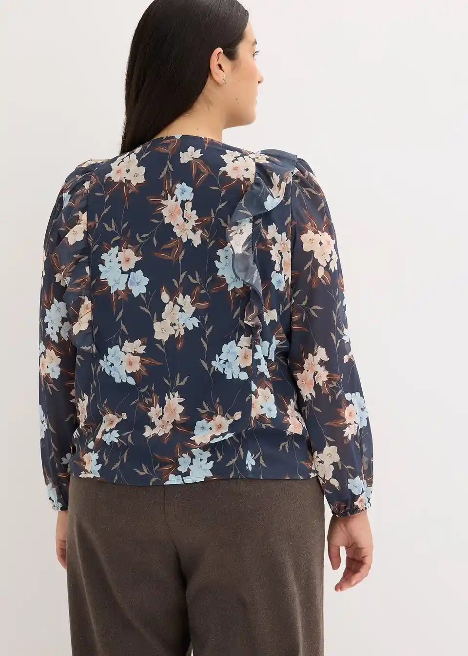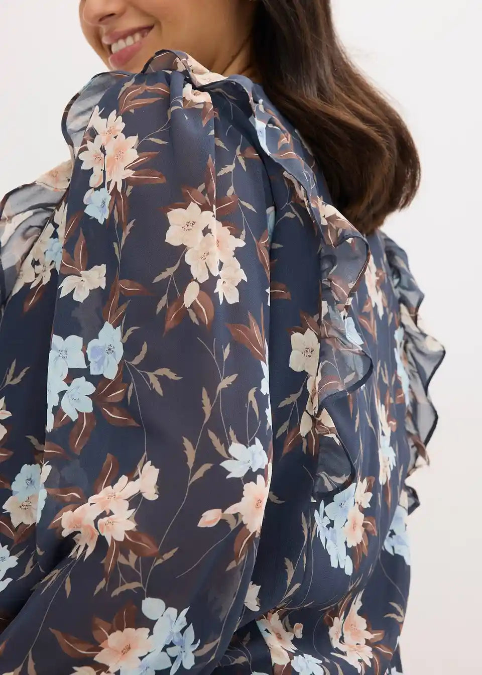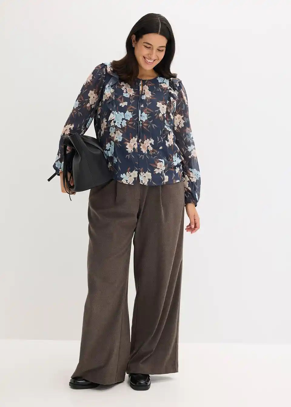 Udobna bluza iz šifona s trakom za zavezovanje, gumbi in volani