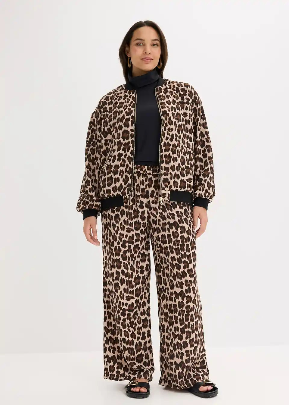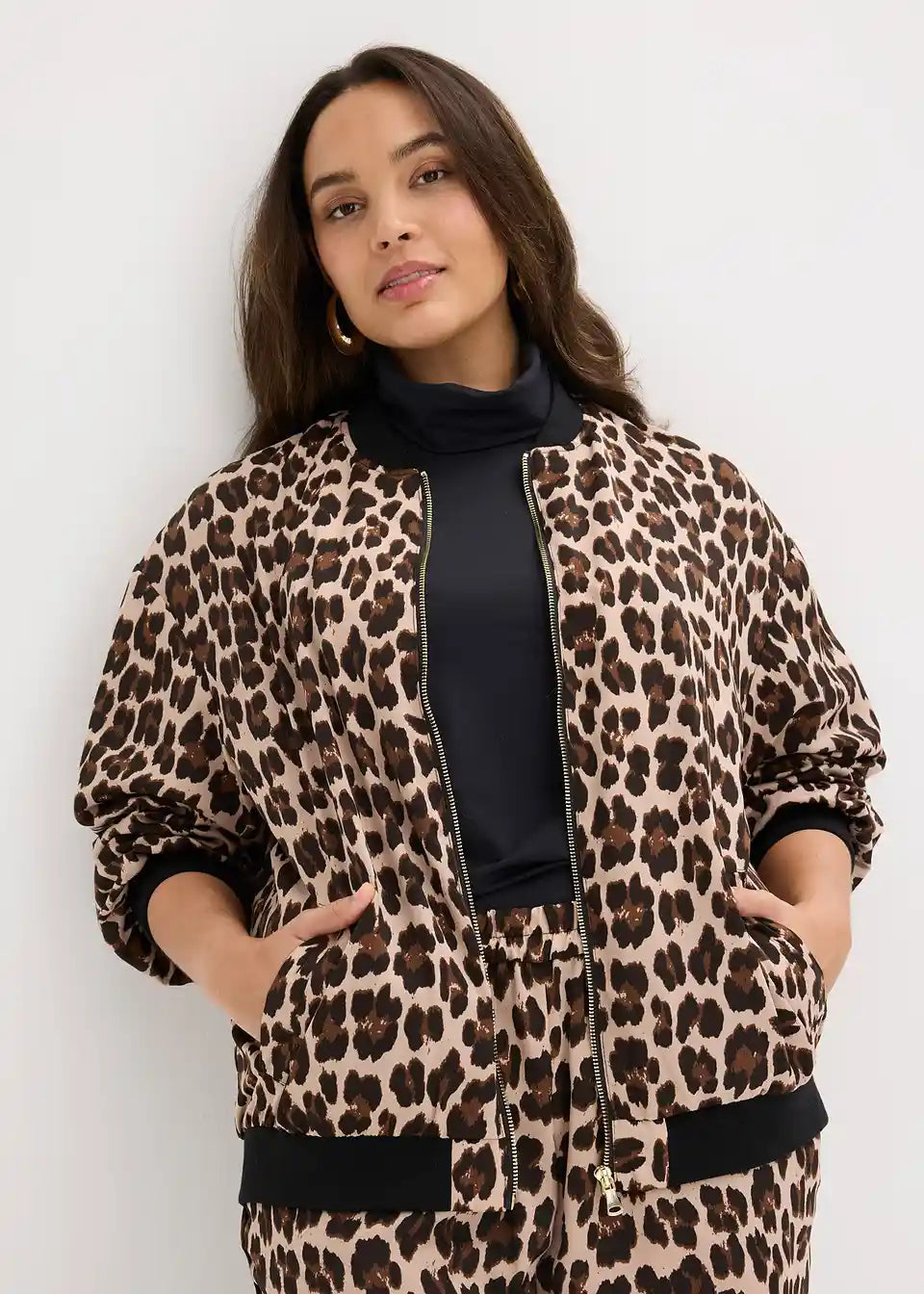 Moden potiskan bluzon iz padajočega satena z zadrgo spredaj