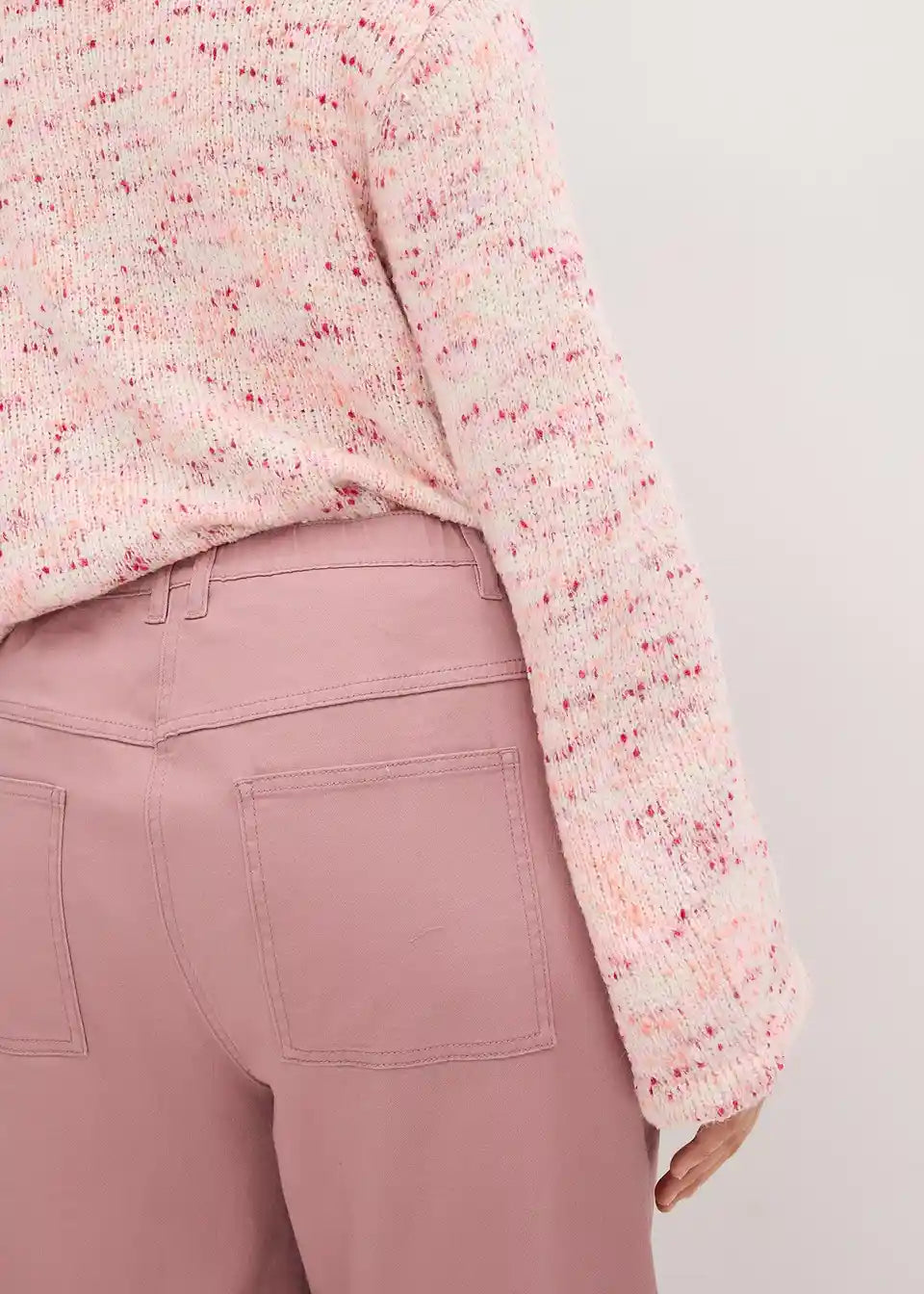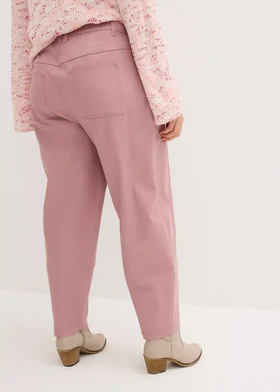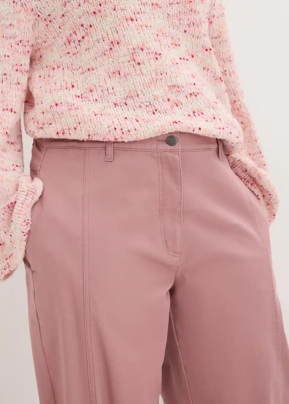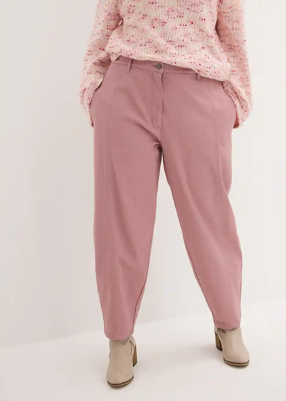 Moderne twill hlače z visokim pasom in zamaknjenimi stranskimi šivi za učinek vitkejše postave