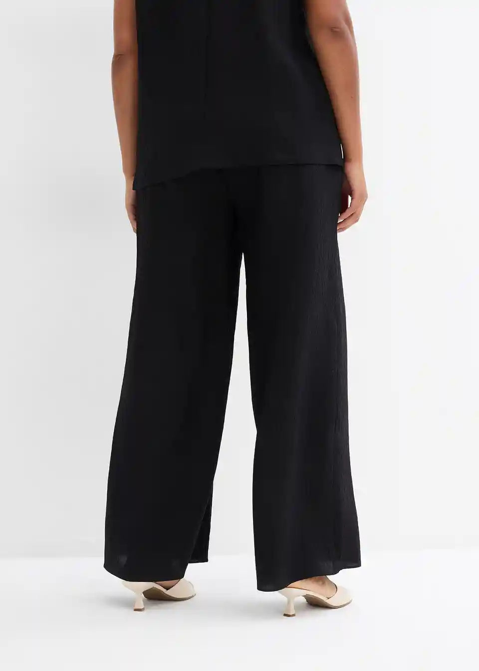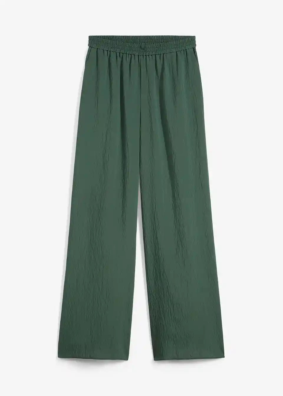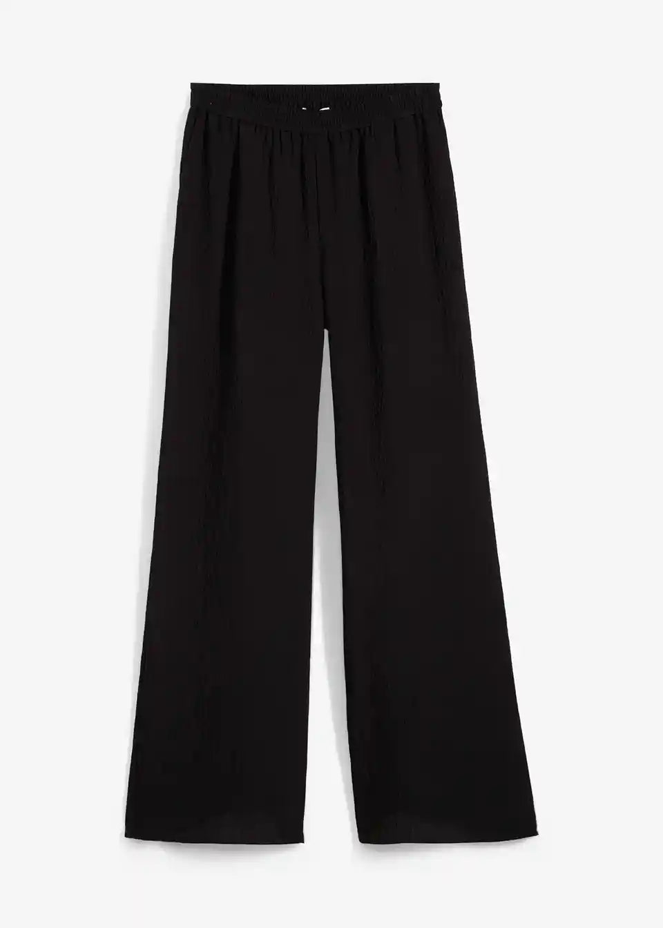 Hlače z visokim elastičnim pasom, s stranskimi žepi in širokimi hlačnicami iz mečkanke