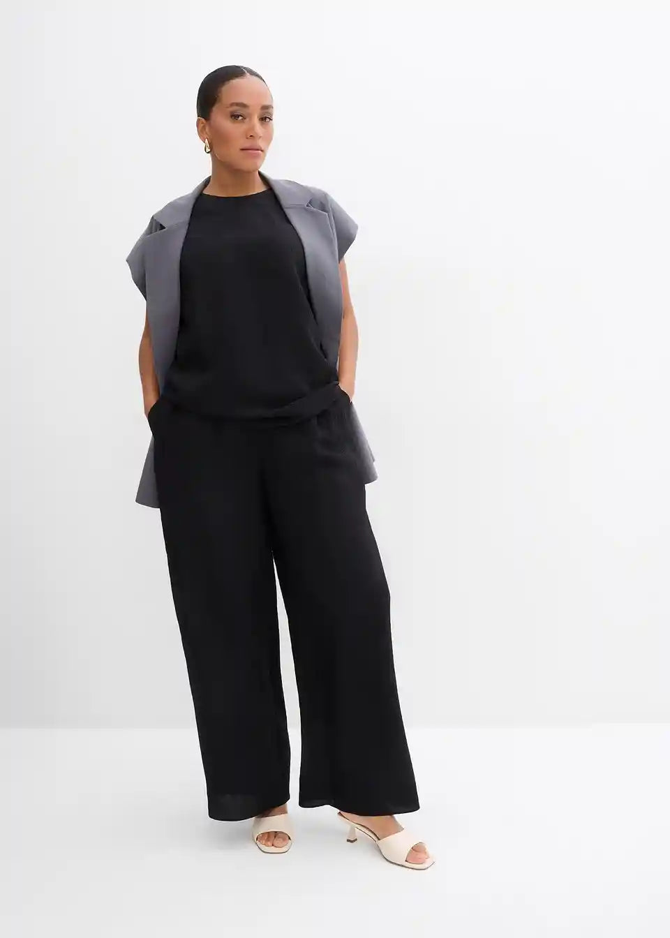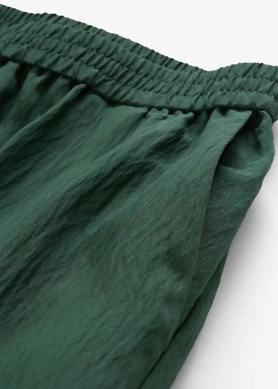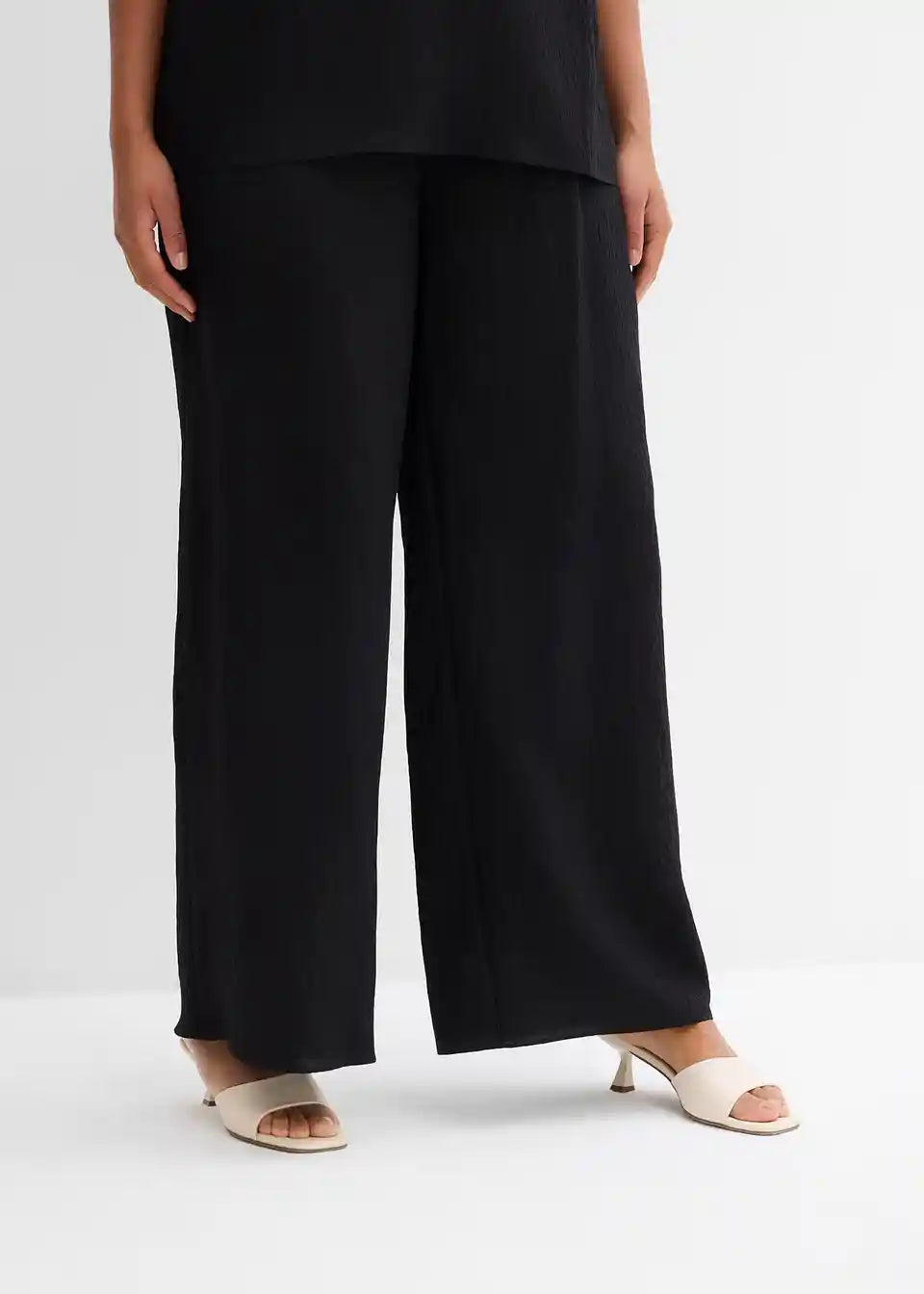 Hlače z visokim elastičnim pasom, s stranskimi žepi in širokimi hlačnicami iz mečkanke