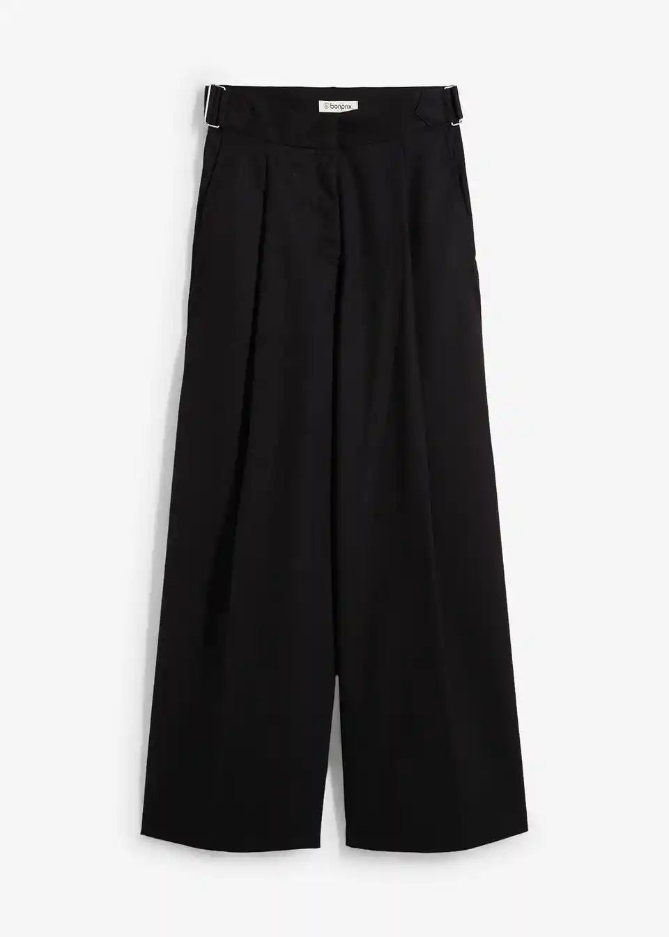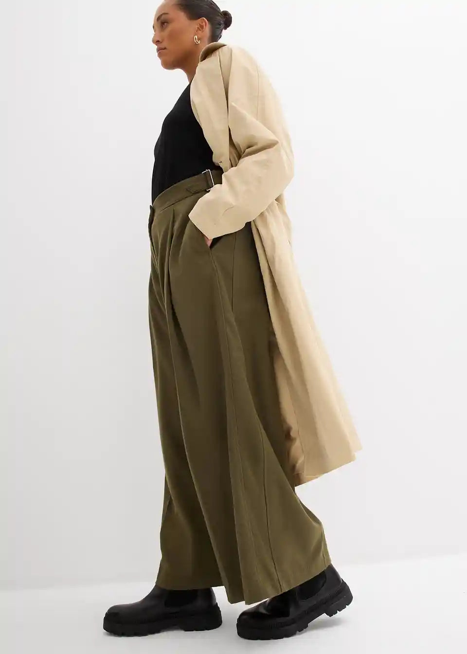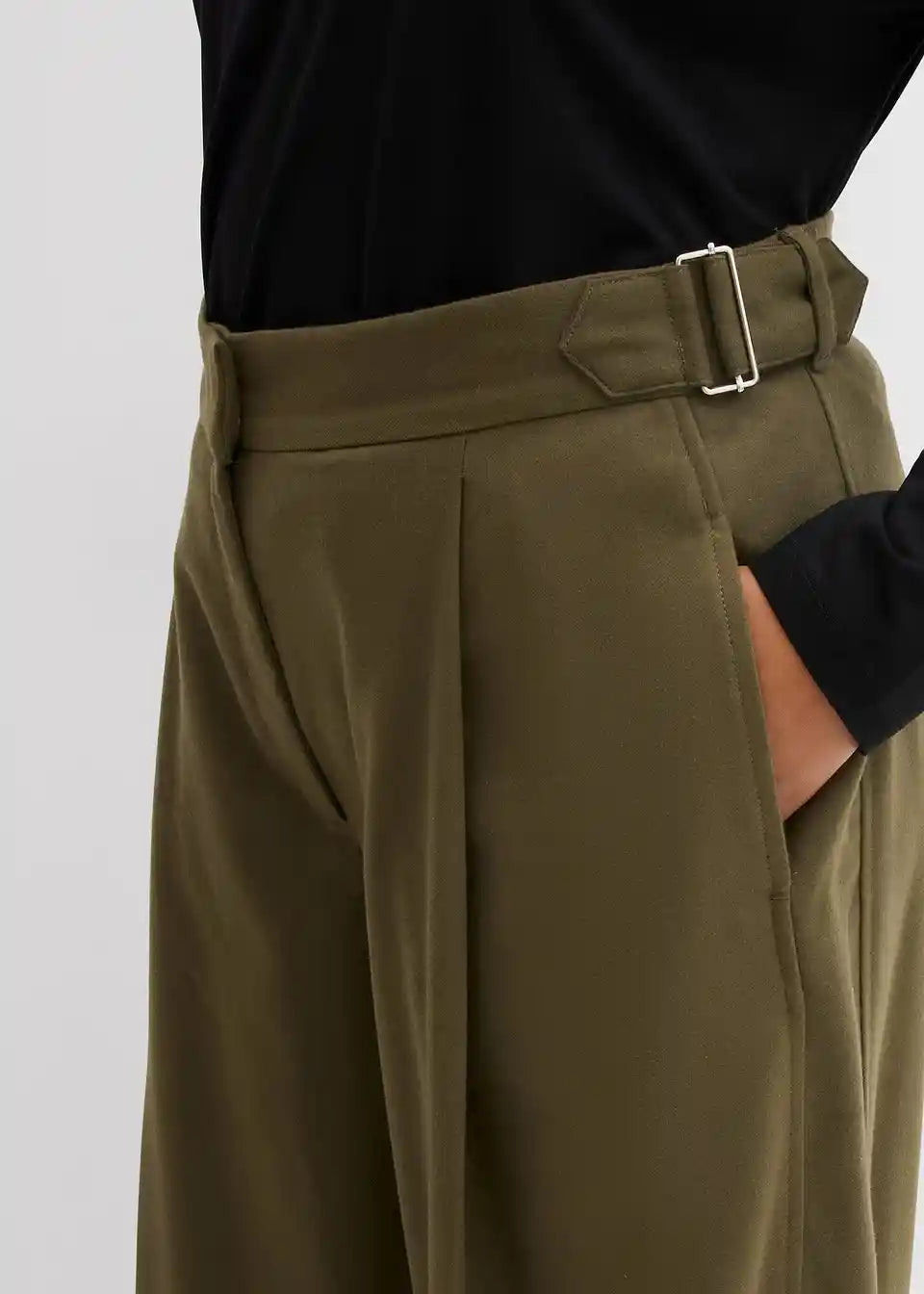 Ohlapno krojene hlače z gubami v pasu in zalikano črto spredaj in zadaj. Z diskretnimi stranskimi žepi in nastavljivo prepono s kovinsko zaponko na obeh straneh pasu.