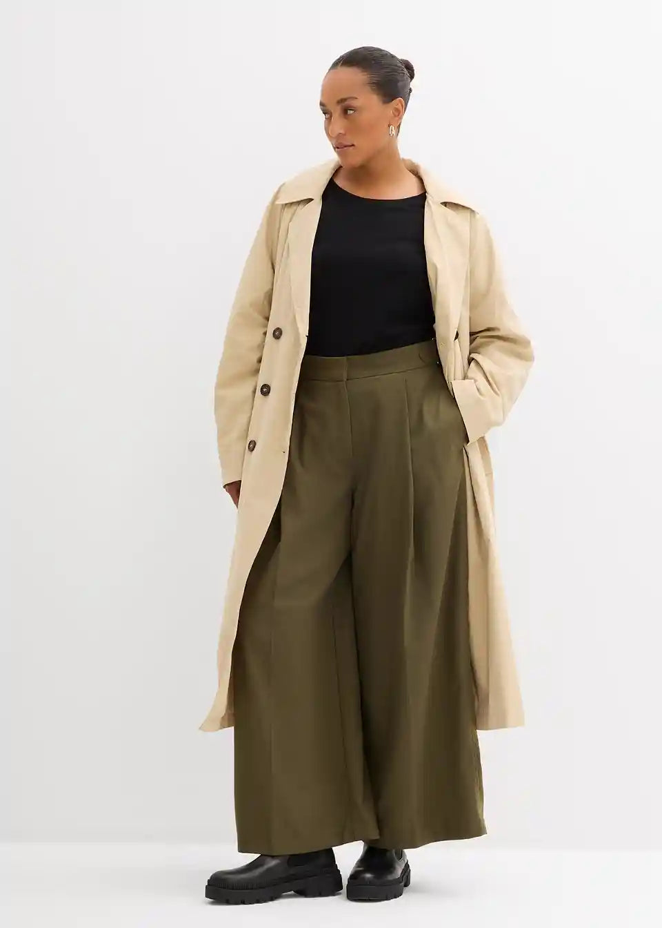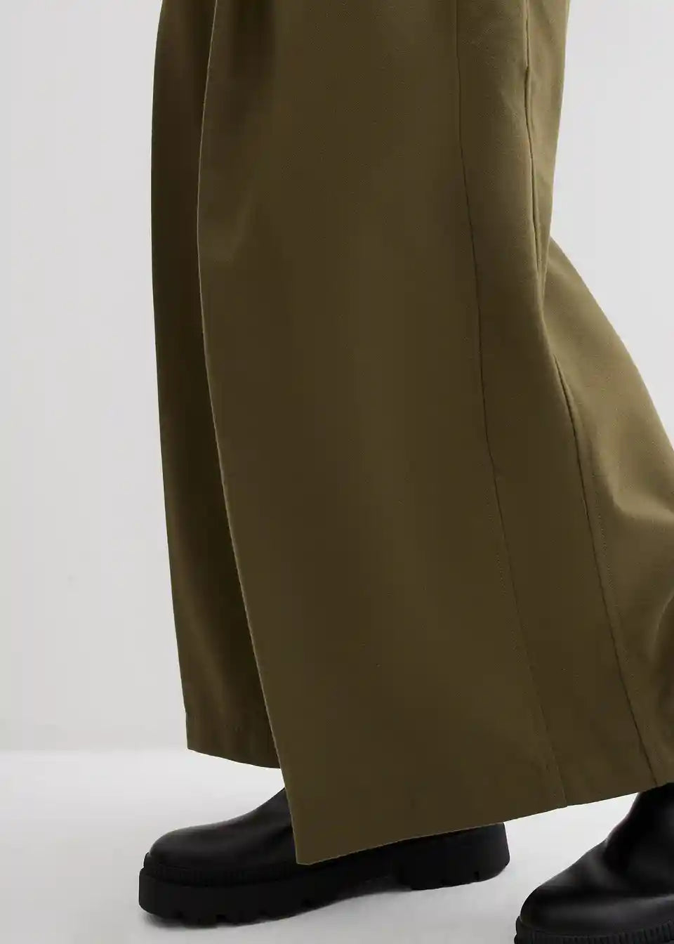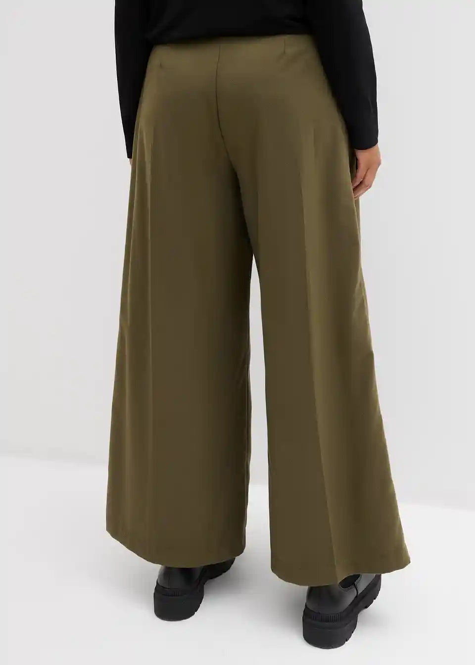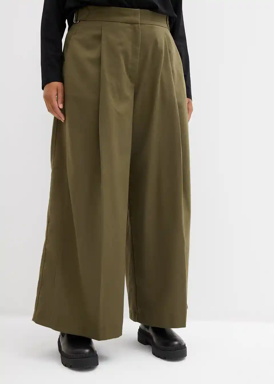 Ohlapno krojene hlače z gubami v pasu in zalikano črto spredaj in zadaj. Z diskretnimi stranskimi žepi in nastavljivo prepono s kovinsko zaponko na obeh straneh pasu.