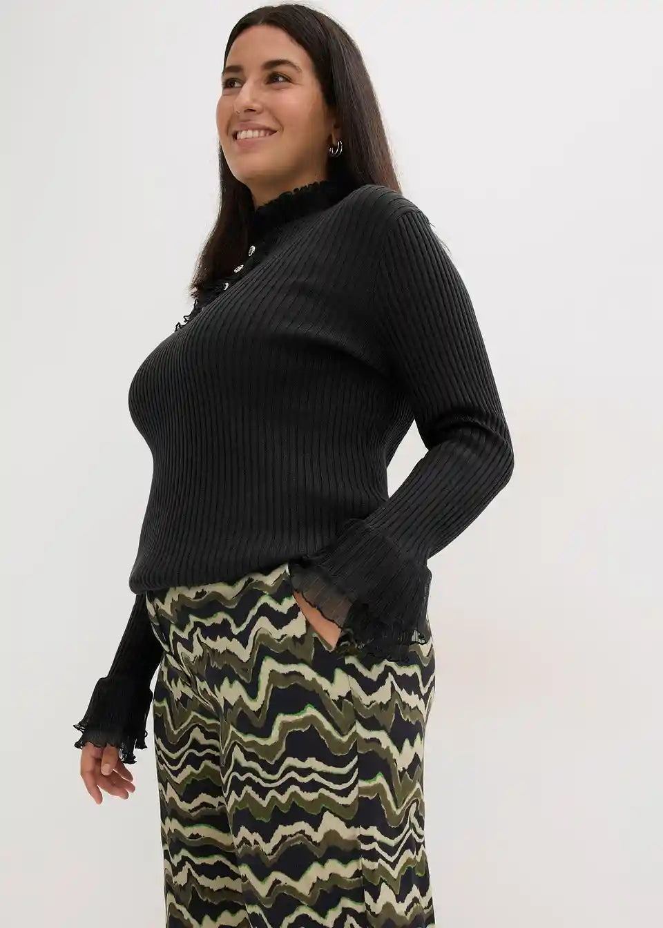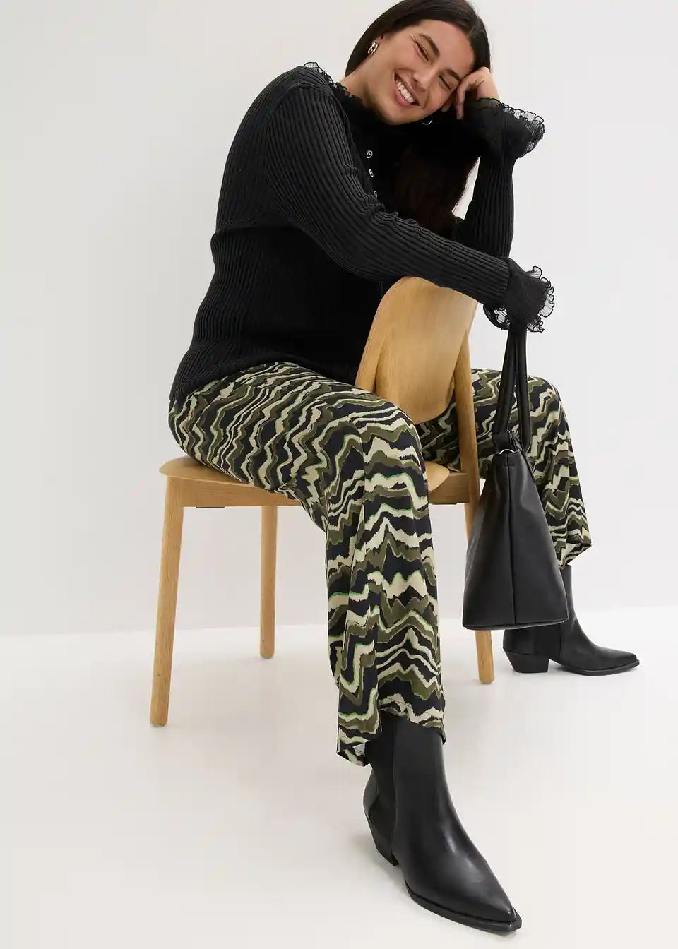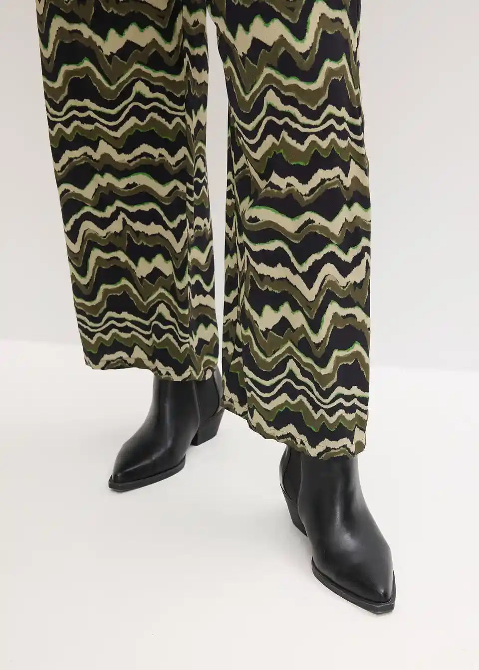 Modno potiskane palazzo hlače iz lahkega viskoznega krepa s kljukicami in obročki za zapenjanje spredaj