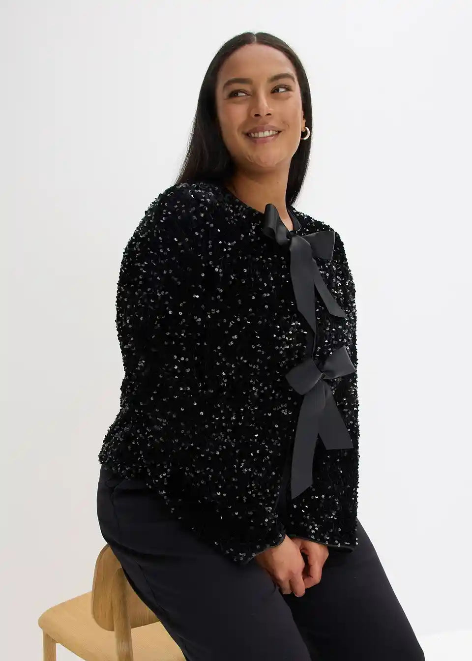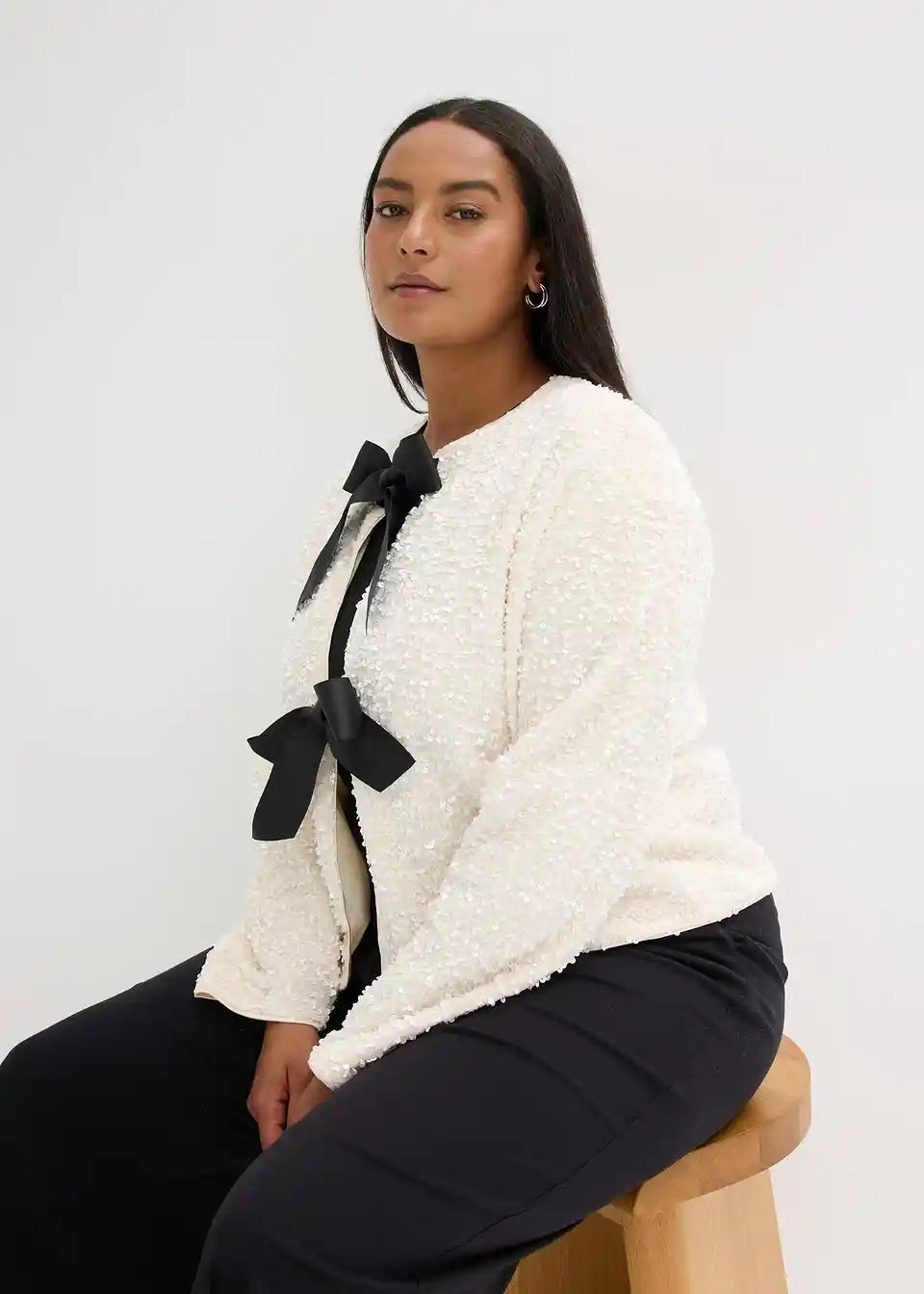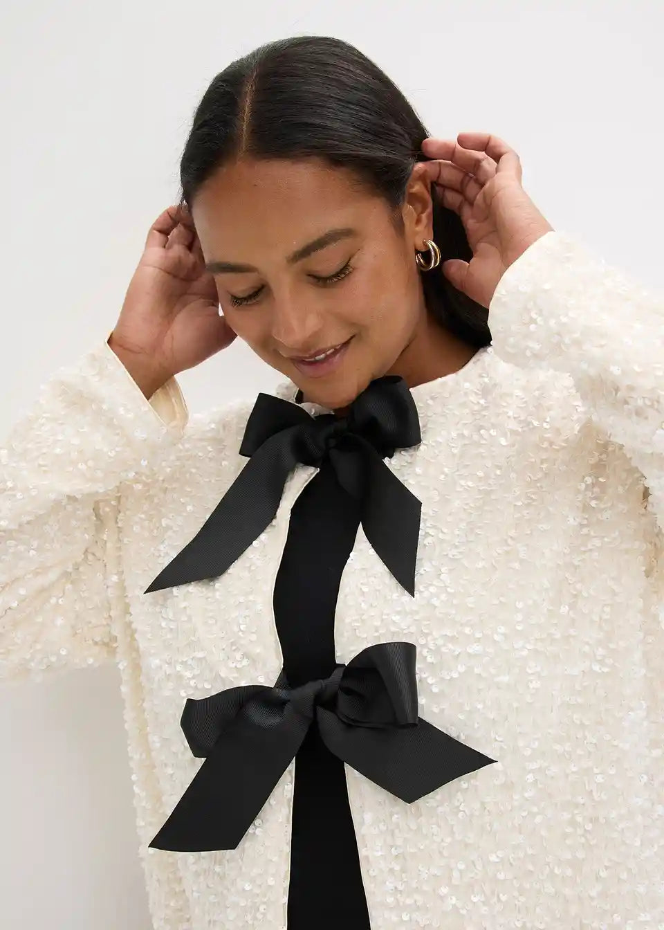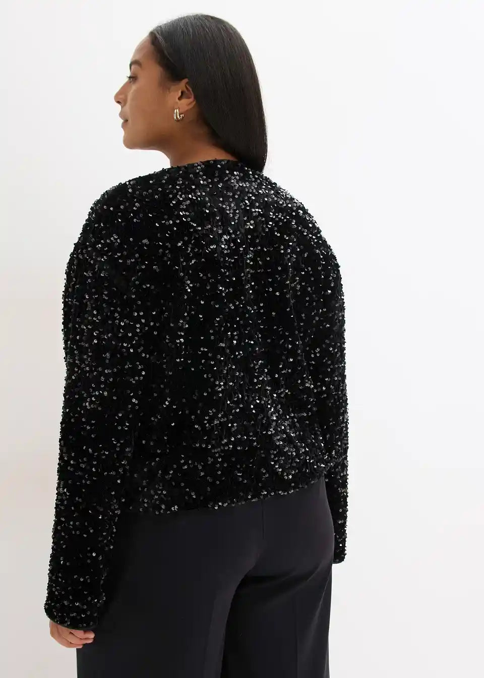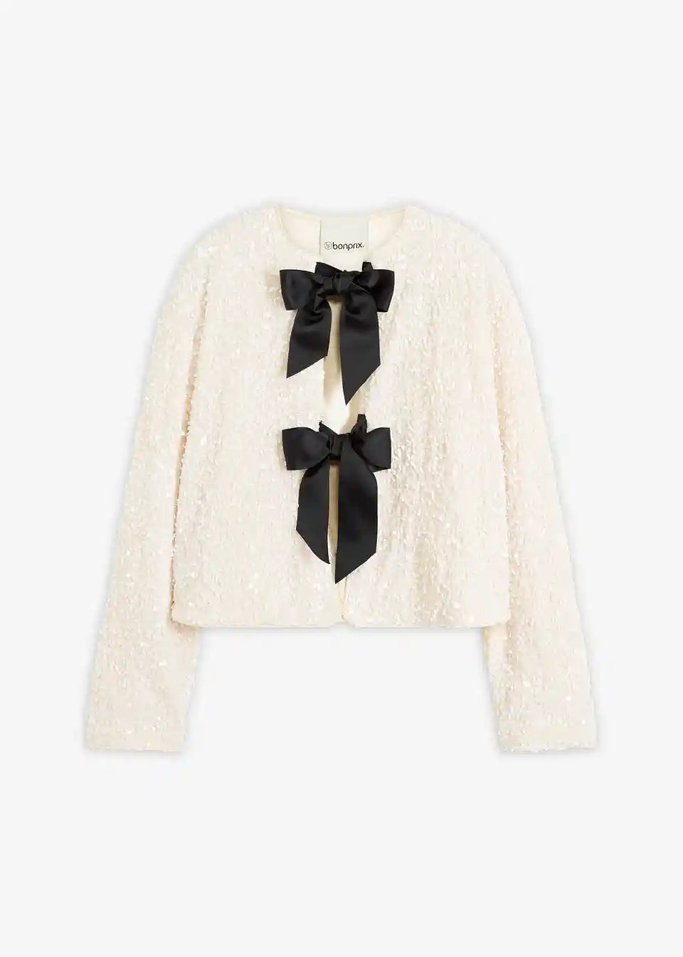 Modna kratka jakna z bleščicami in pentljami za zapenjanje spredaj s podlogo.