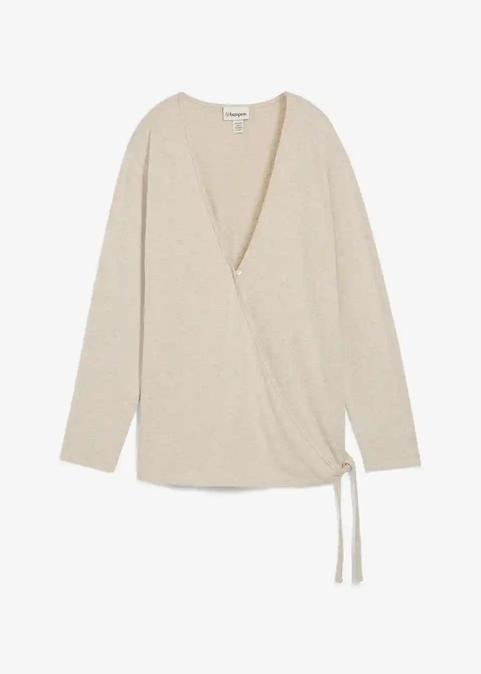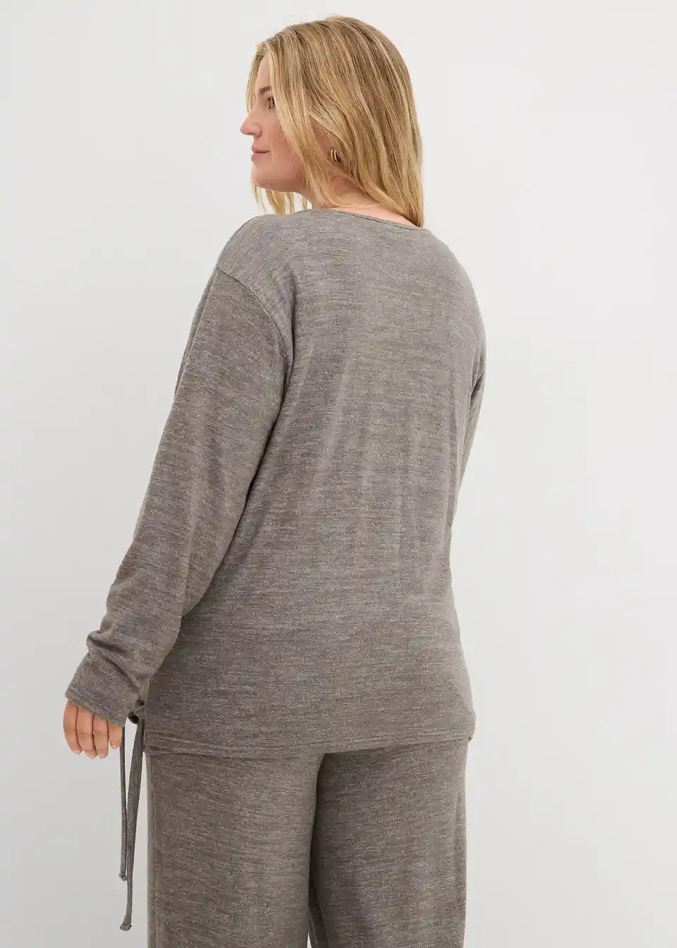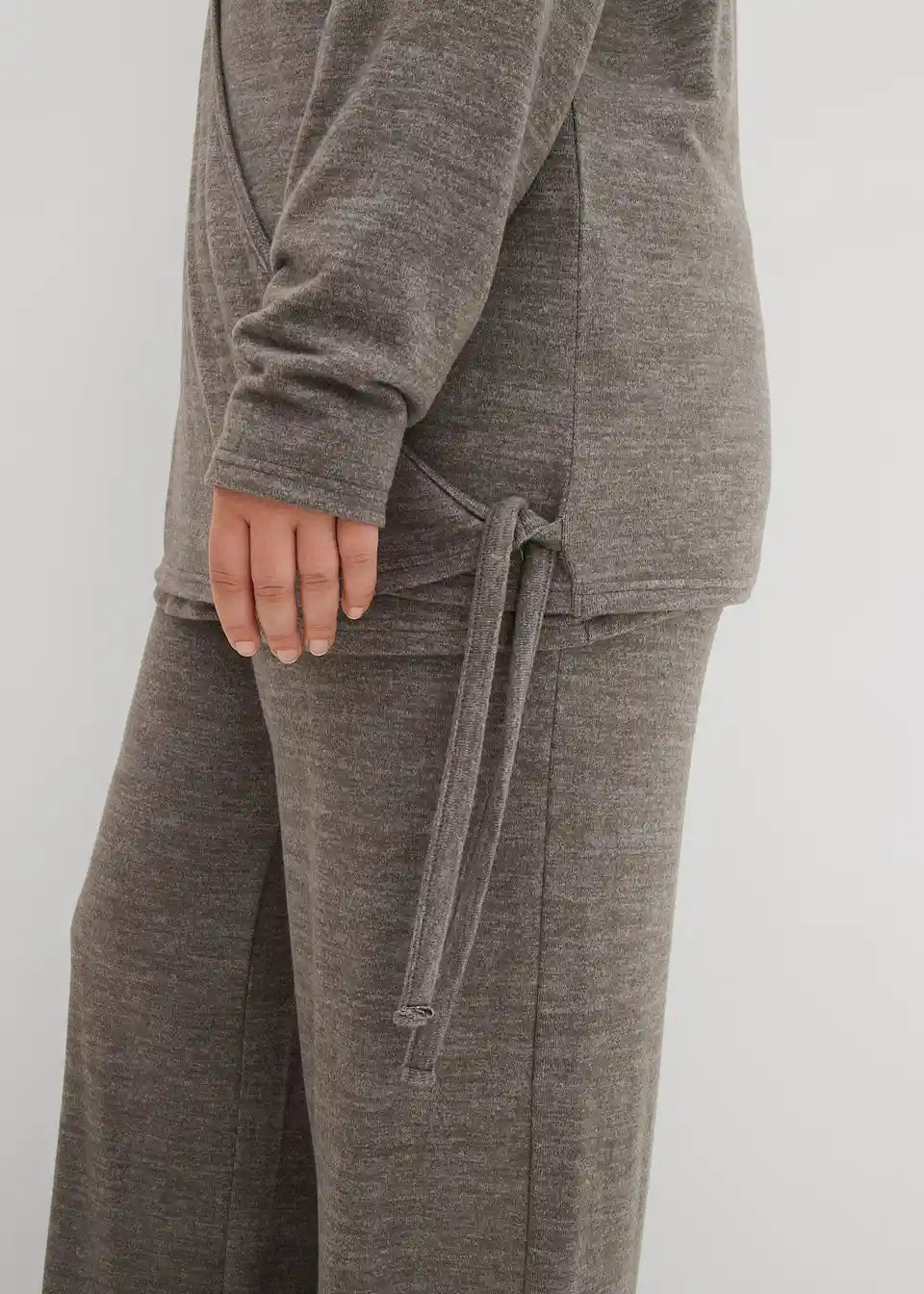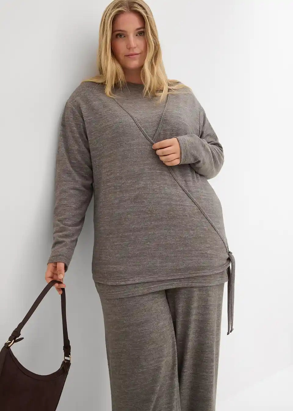 Ovita pletena jopa z dolgimi rokavi, vrvico na spodnjem robu in dodatnim detajlom gumba.
