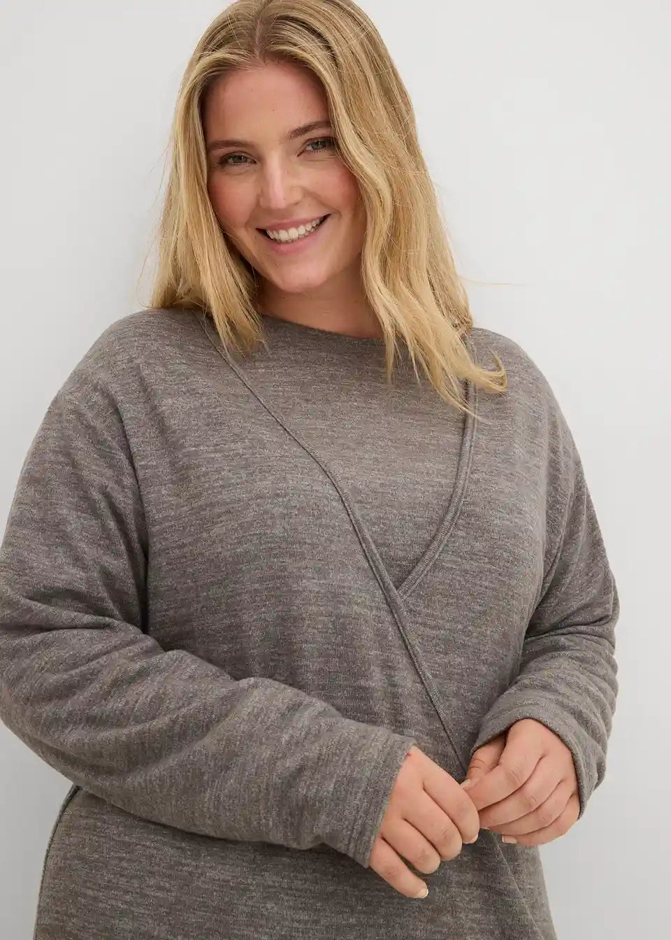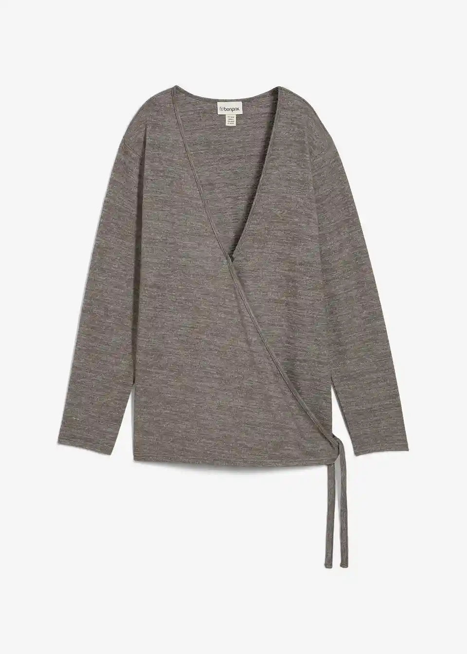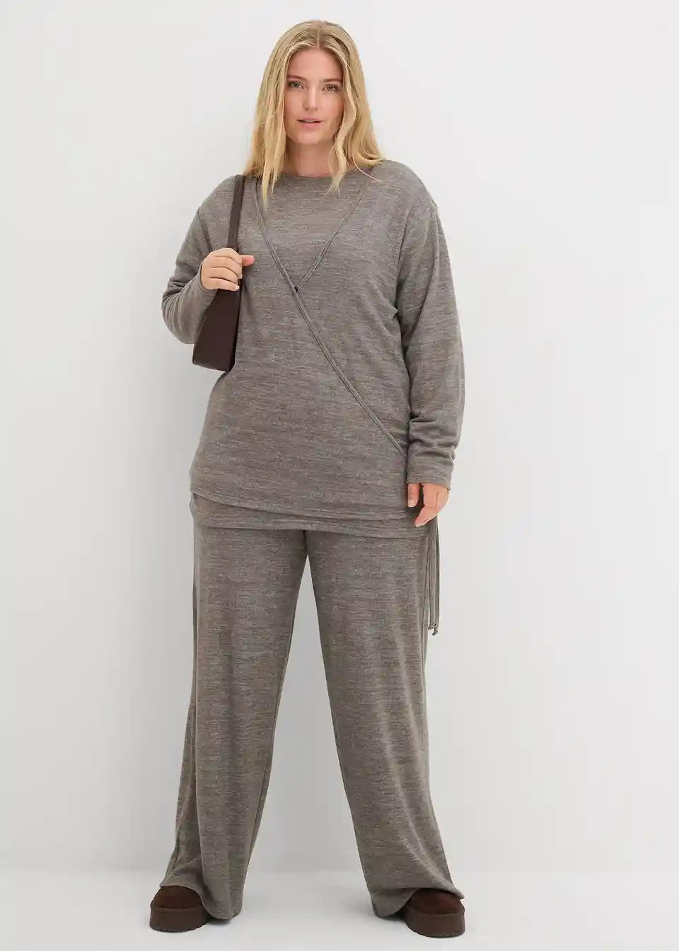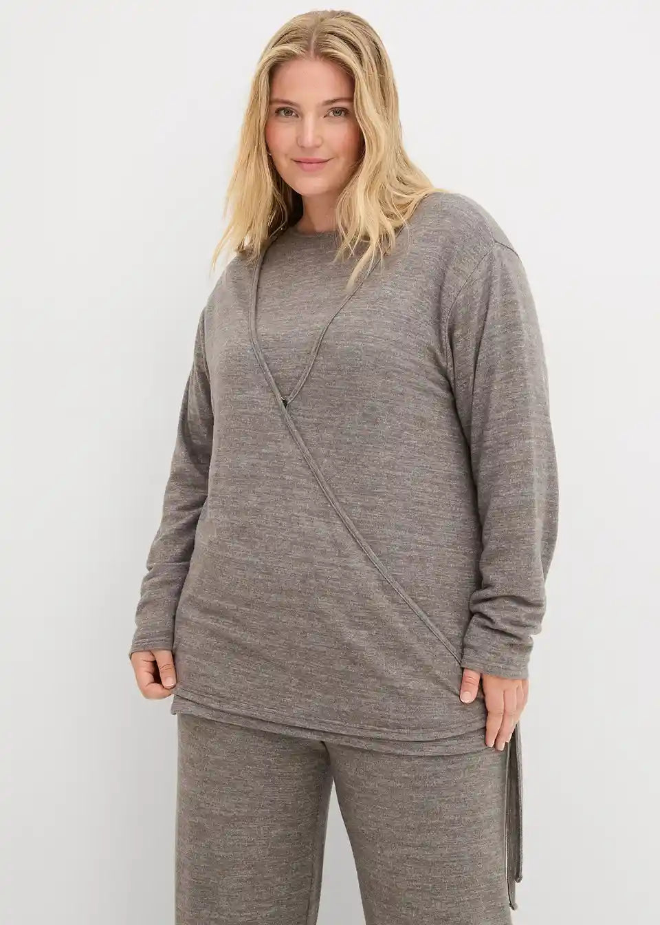 Ovita pletena jopa z dolgimi rokavi, vrvico na spodnjem robu in dodatnim detajlom gumba.