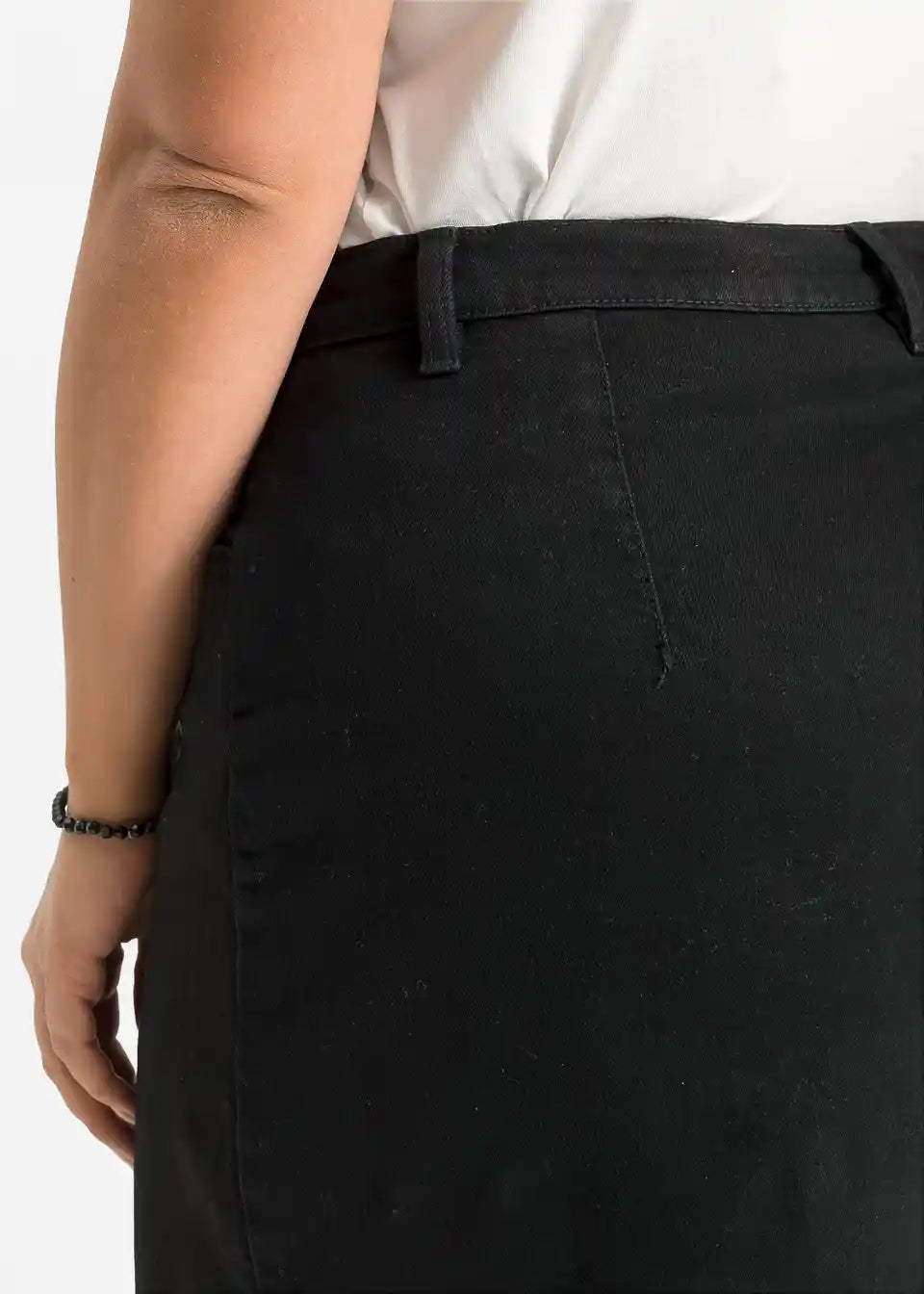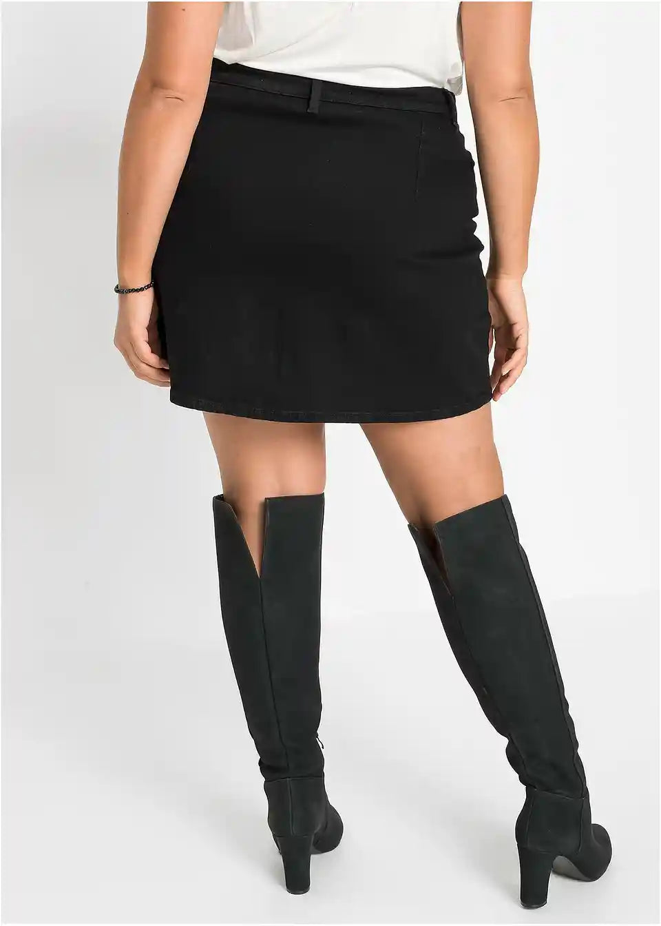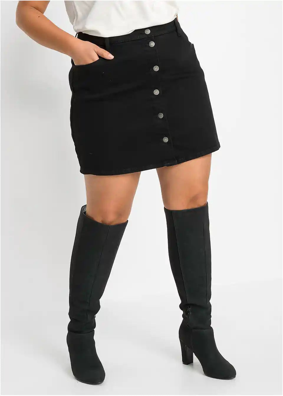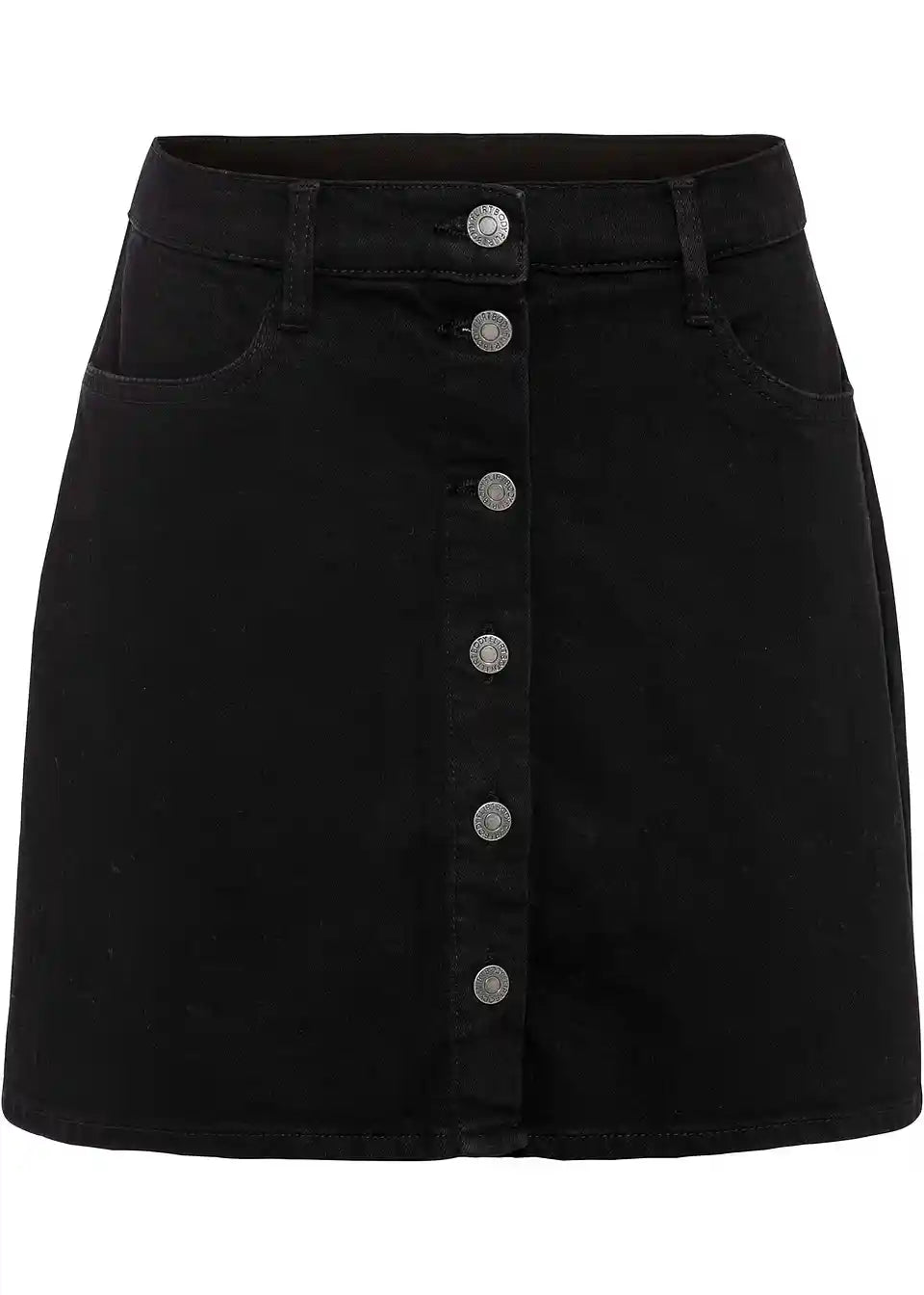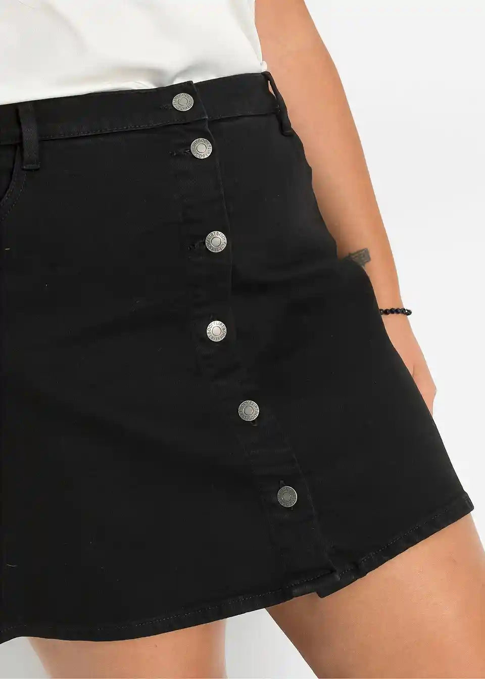 Privlačno raztegljivo jeans krilo v lahki A-liniji z zaporedjem gumbov.