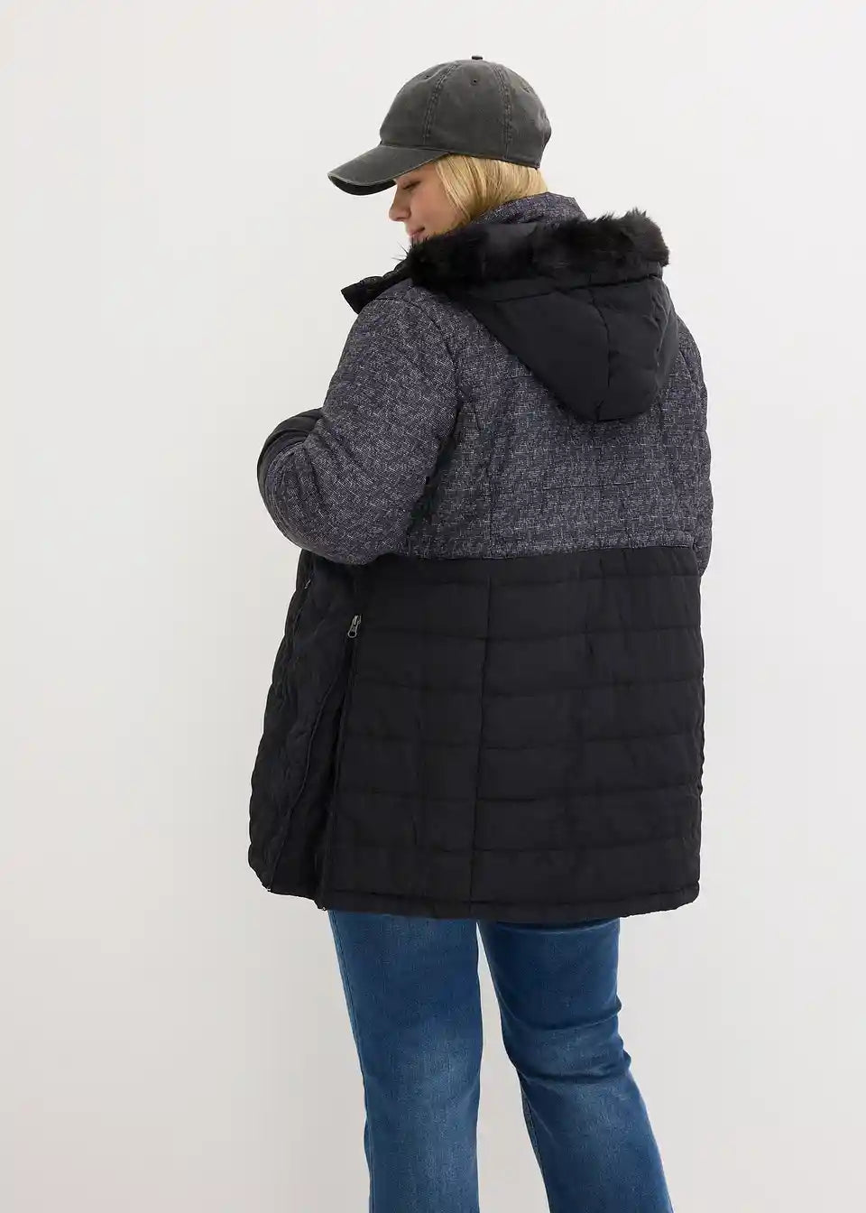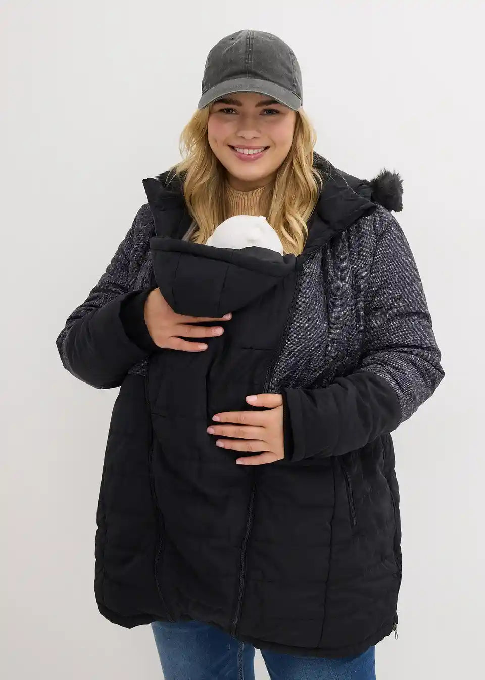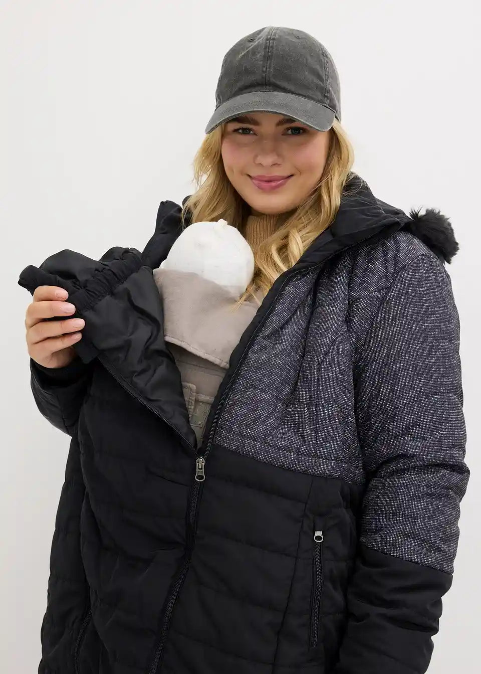 Dežju in vetru odporna prešita jakna z vložkom za nošenje dojenčka. S stranskimi zadrgami za prilagajanje širine, kar omogoča nošenje tako med nosečnostjo kot po njej. Mehki rebrasti zaključki na rokavih preprečujejo vdor mraza in vetra. S praktičnimi žepi z zadrgo spredaj. Kapuca je snemljiva in ima umetno krzno.