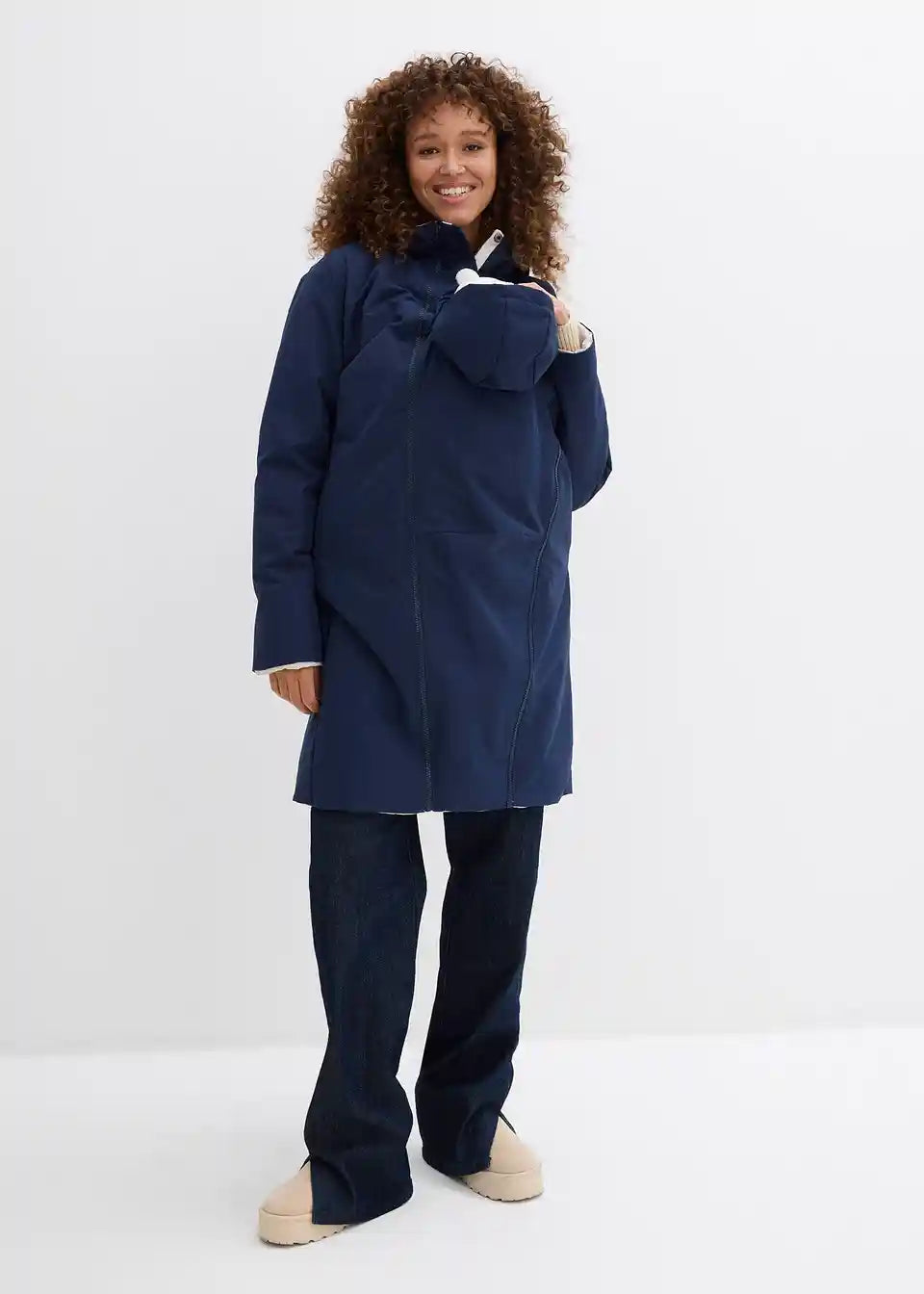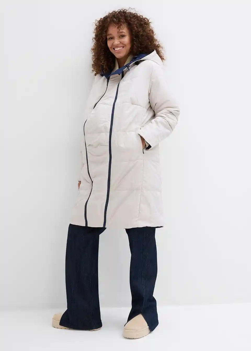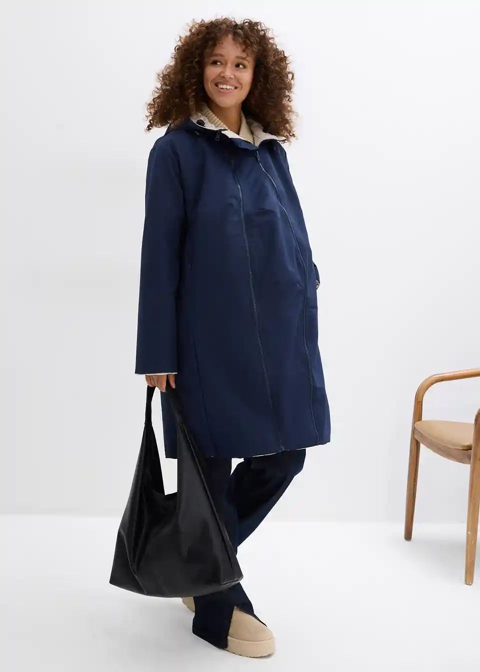 Ta vsestranski obojestranski plašč je popoln za nosečnost in obdobje po njej. Ena stran je iz vetro- in vodoodbojnega materiala, druga stran je prešita in rahlo podložena za prijetno toplino in prilagodljivost v vsakdanjem življenju. Plašč ima dva vložka: razširitveni vložek za nosečnost in vložek za nošenje dojenčka. Vložek za nošenje je oblikovan tako, da prijetno greje materin vrat, ima skrite pritiskače ter kapuco za dojenčka z nastavljivo vrvico. Velika kapuca za mamo nudi zanesljivo zaščito pred vetrom in vremenom. Obe strani imata praktična žepa z zadrgo.