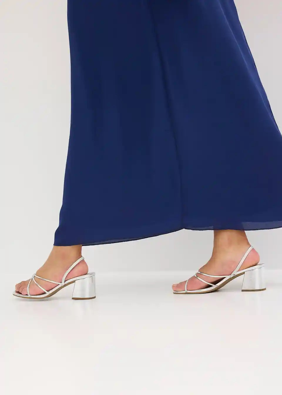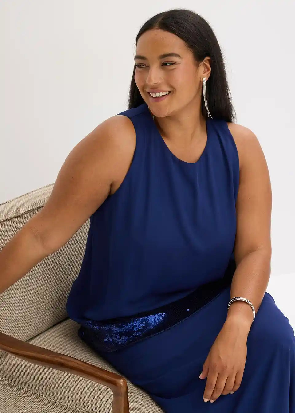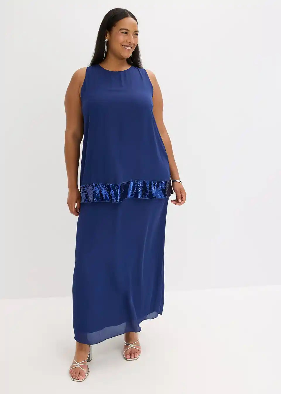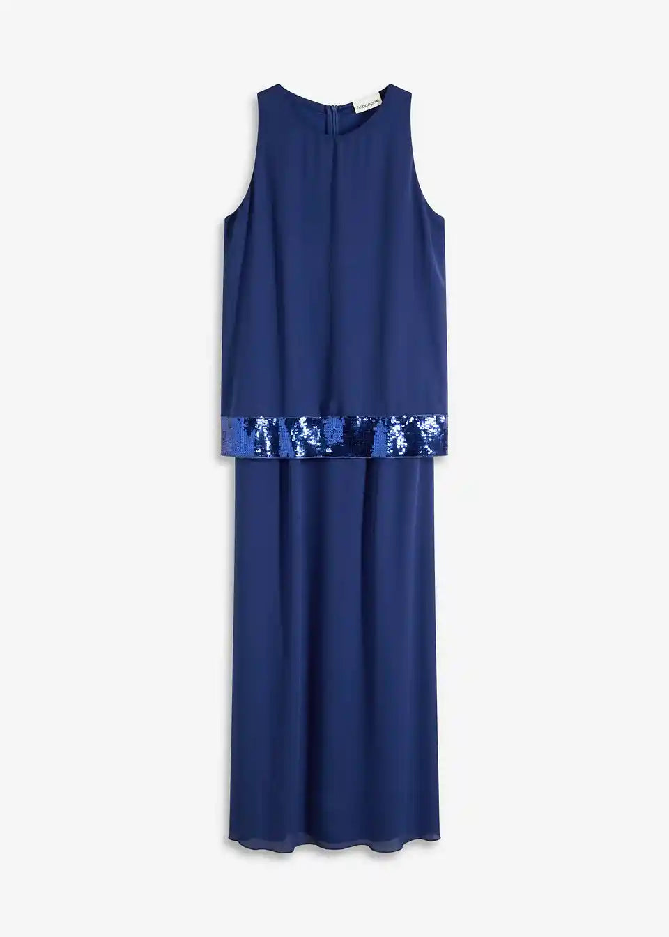 Moderna in ženstvena večerna obleka v dolgem kroju z ogrinjalom in našitkom z bleščicami