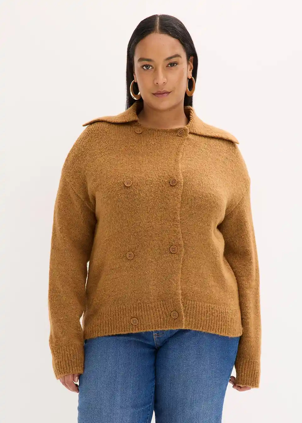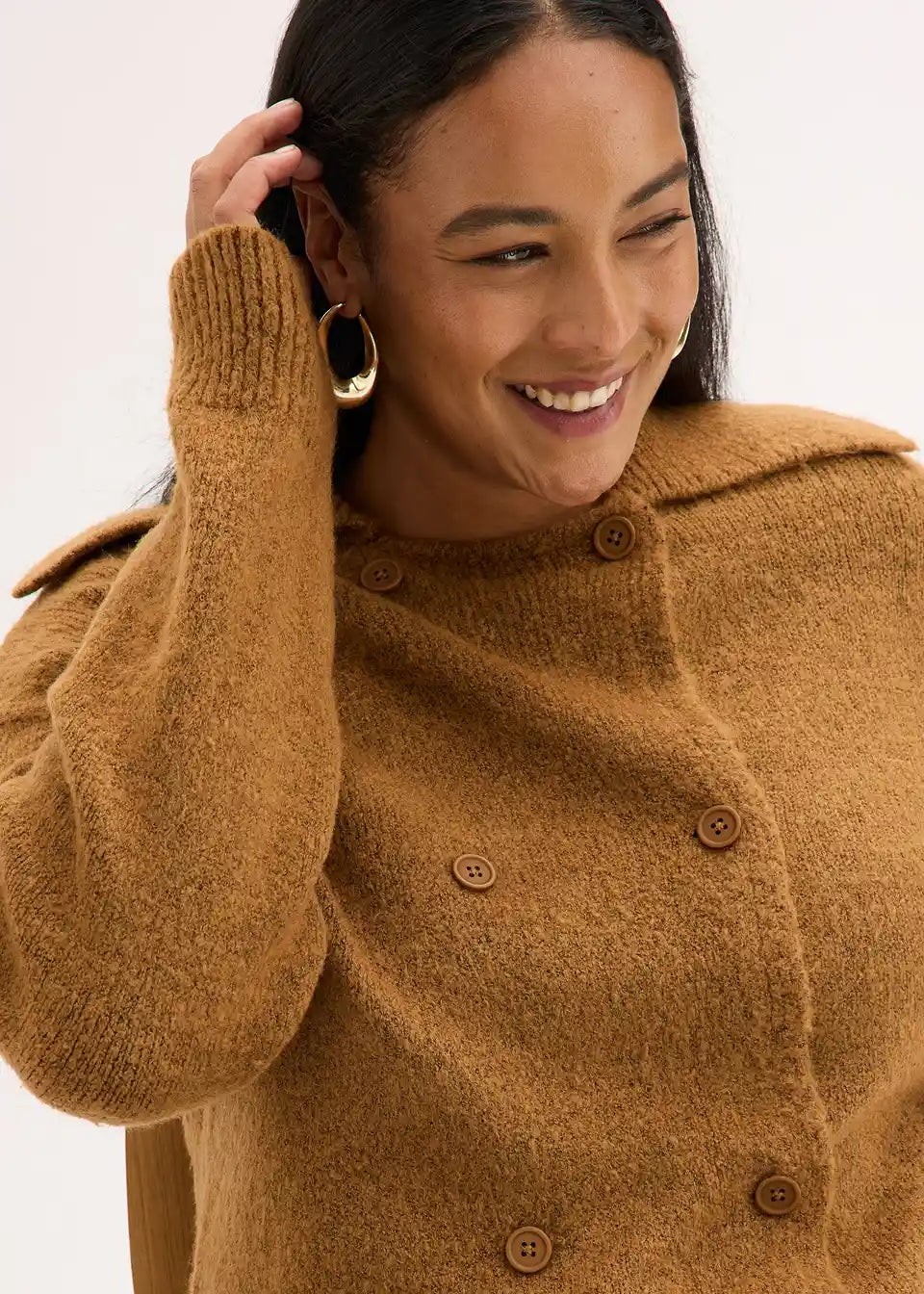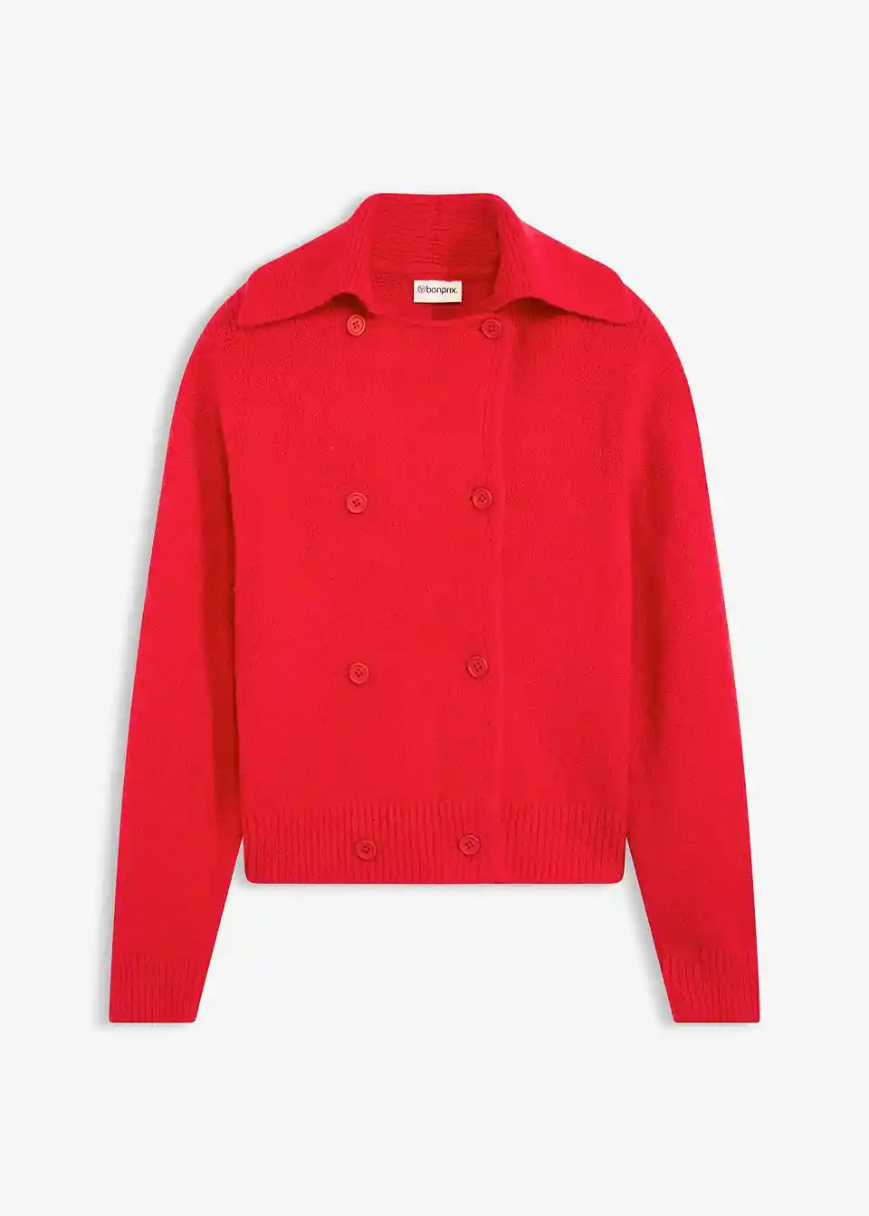 Moderna pletena jopa z dvoredno letvijo za zapenjanje z gumbi in ovratnikom