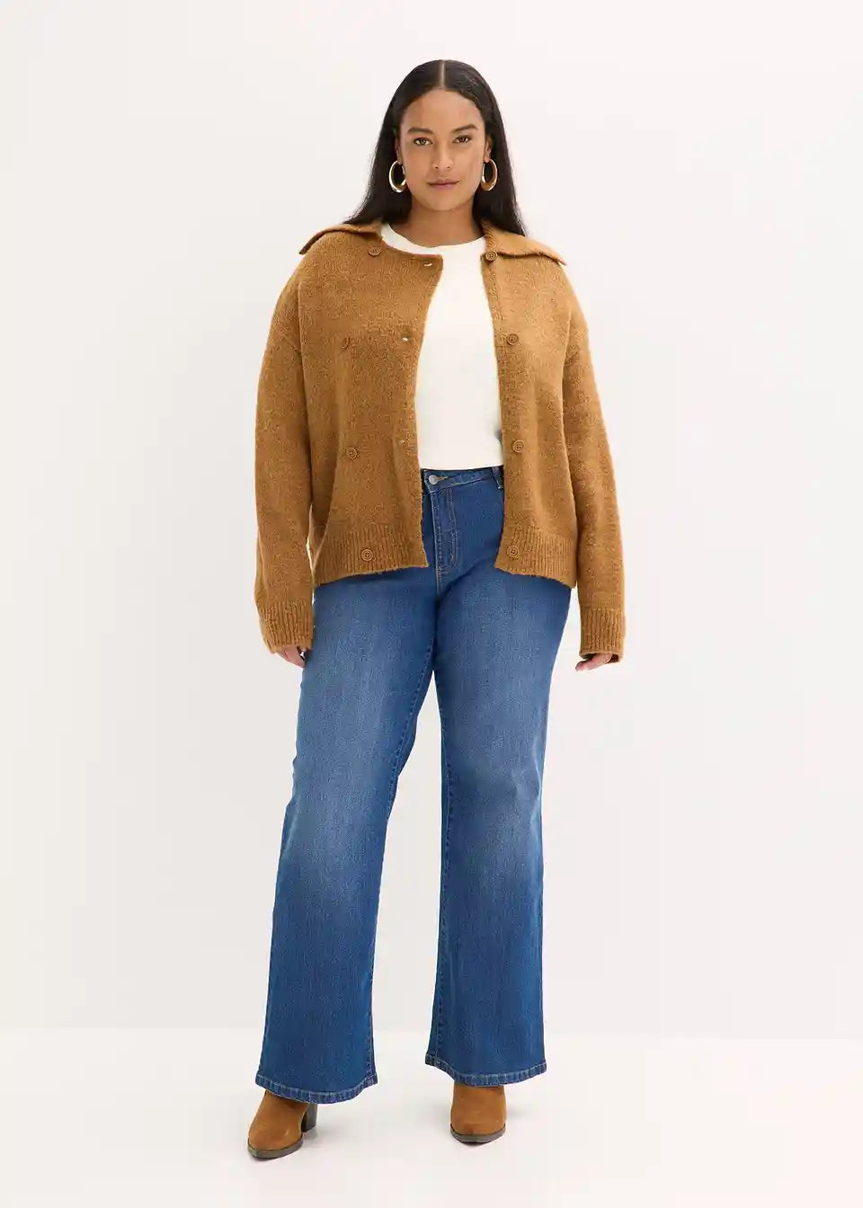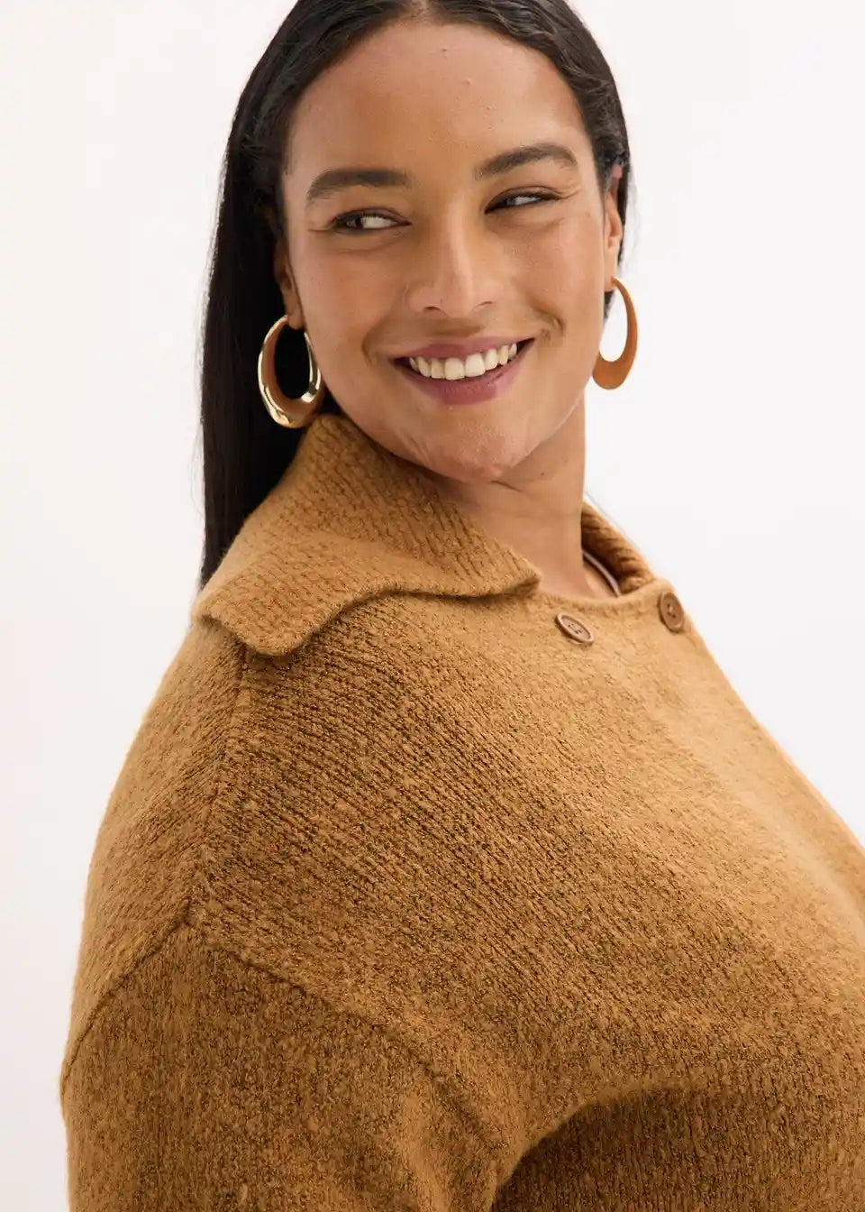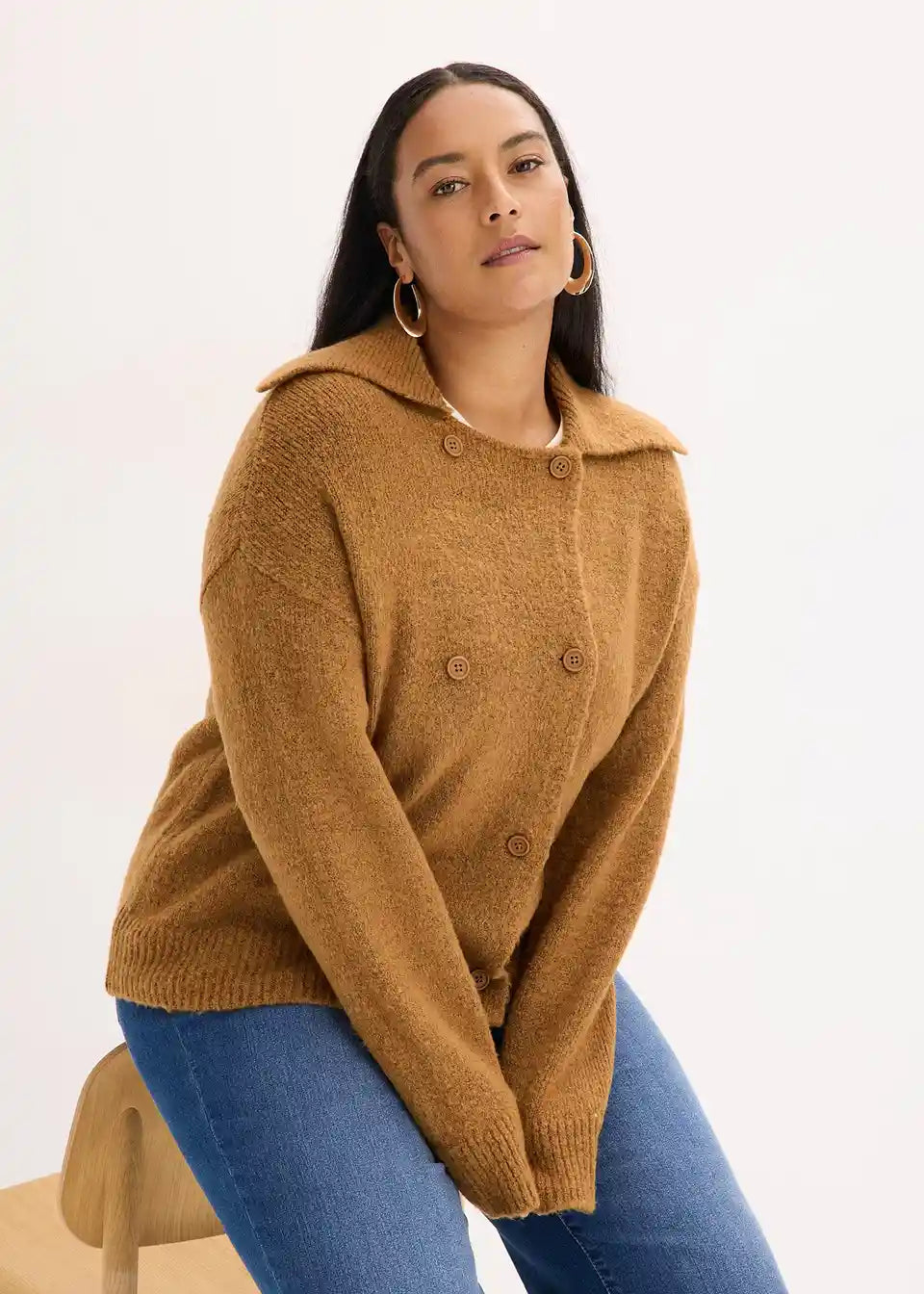 Moderna pletena jopa z dvoredno letvijo za zapenjanje z gumbi in ovratnikom