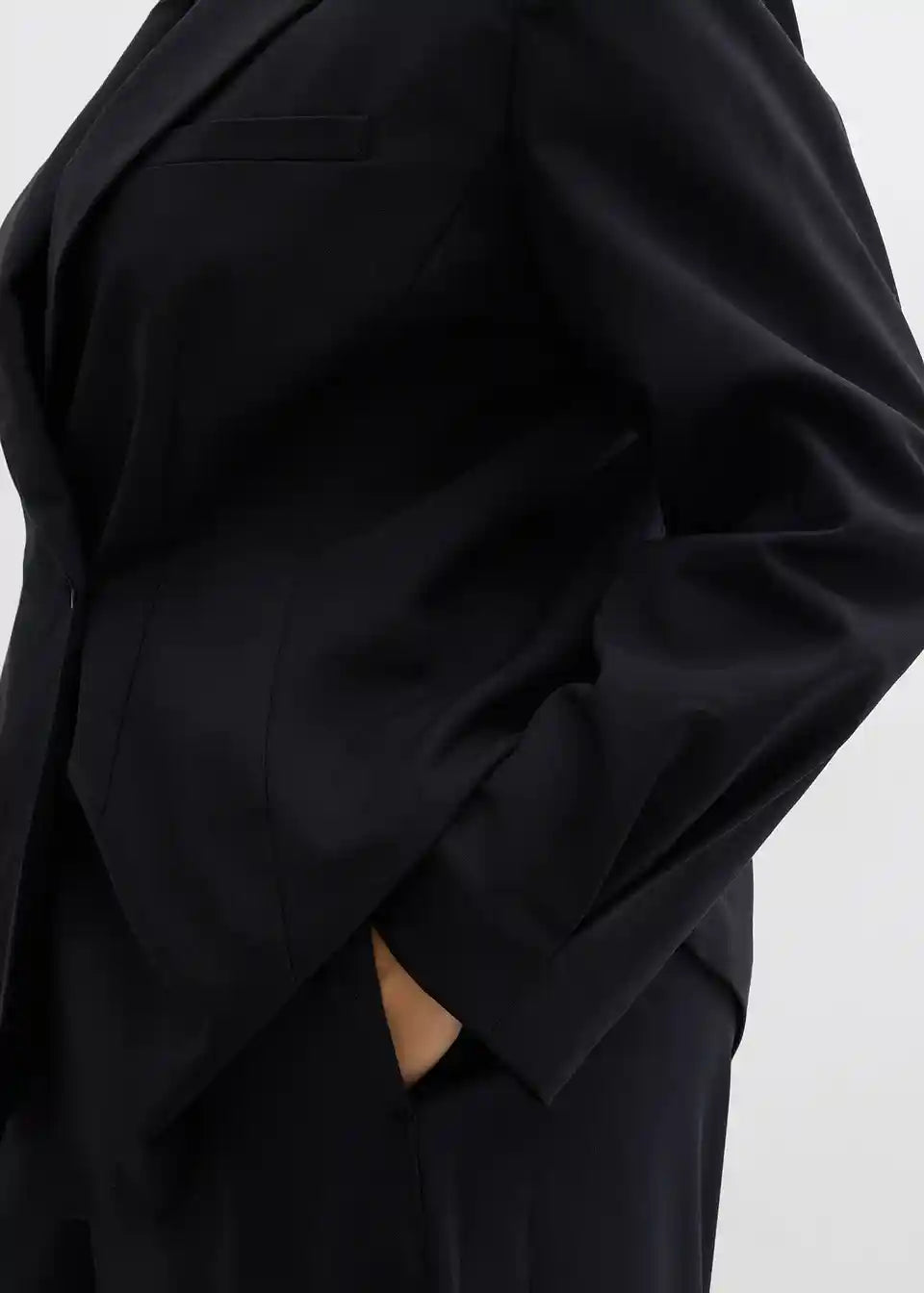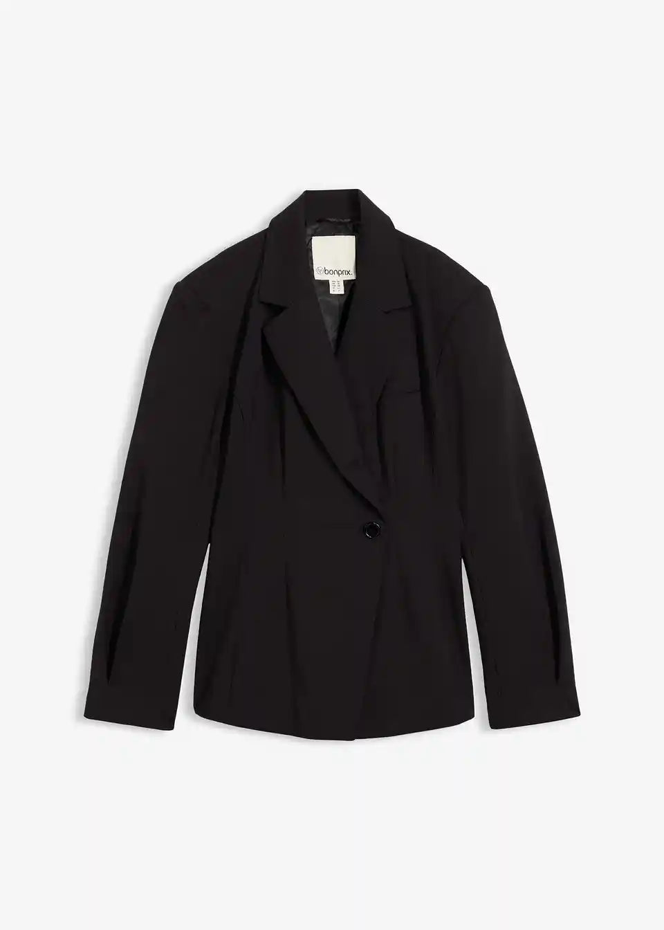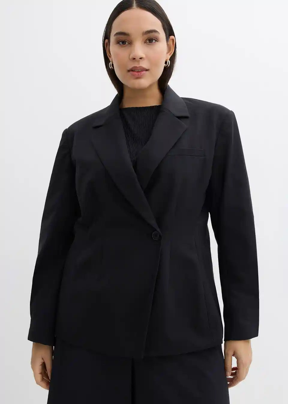Lepo tajliran blazer, ki ponazarja obliko peščene ure, z asimetričnim zapenjanjem z gumbi spredaj