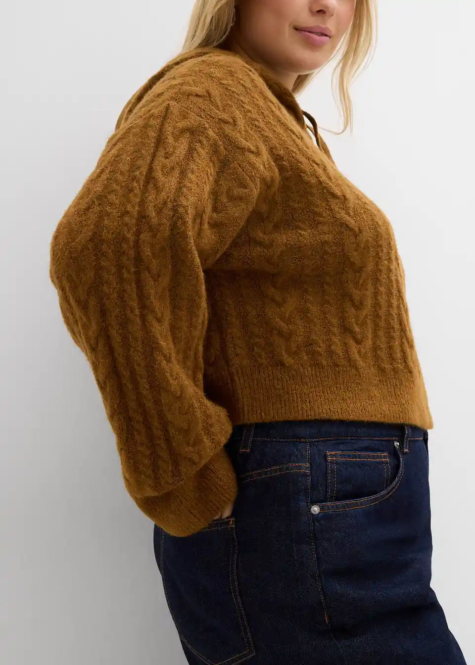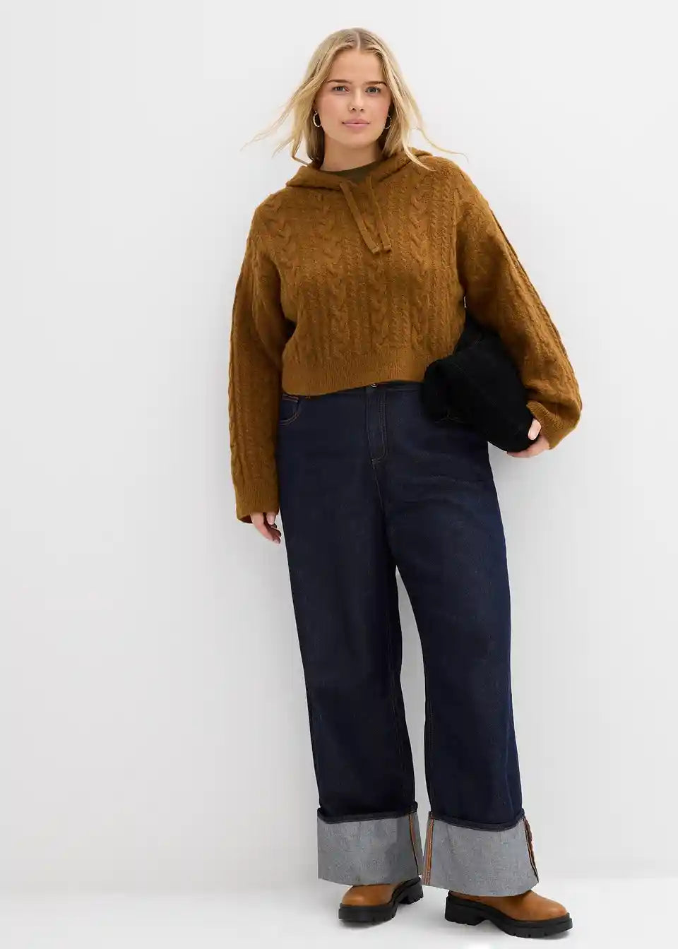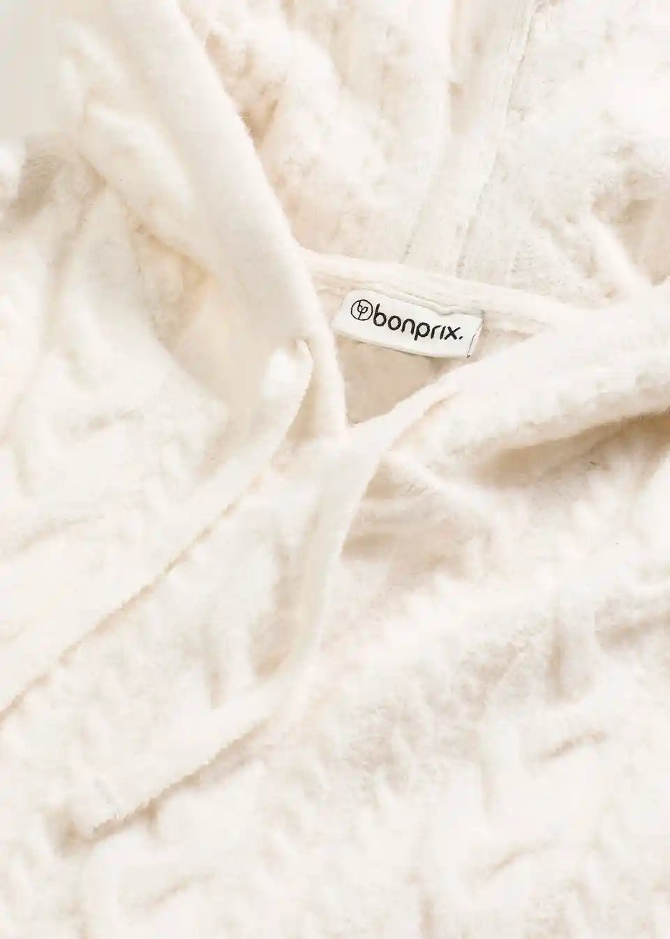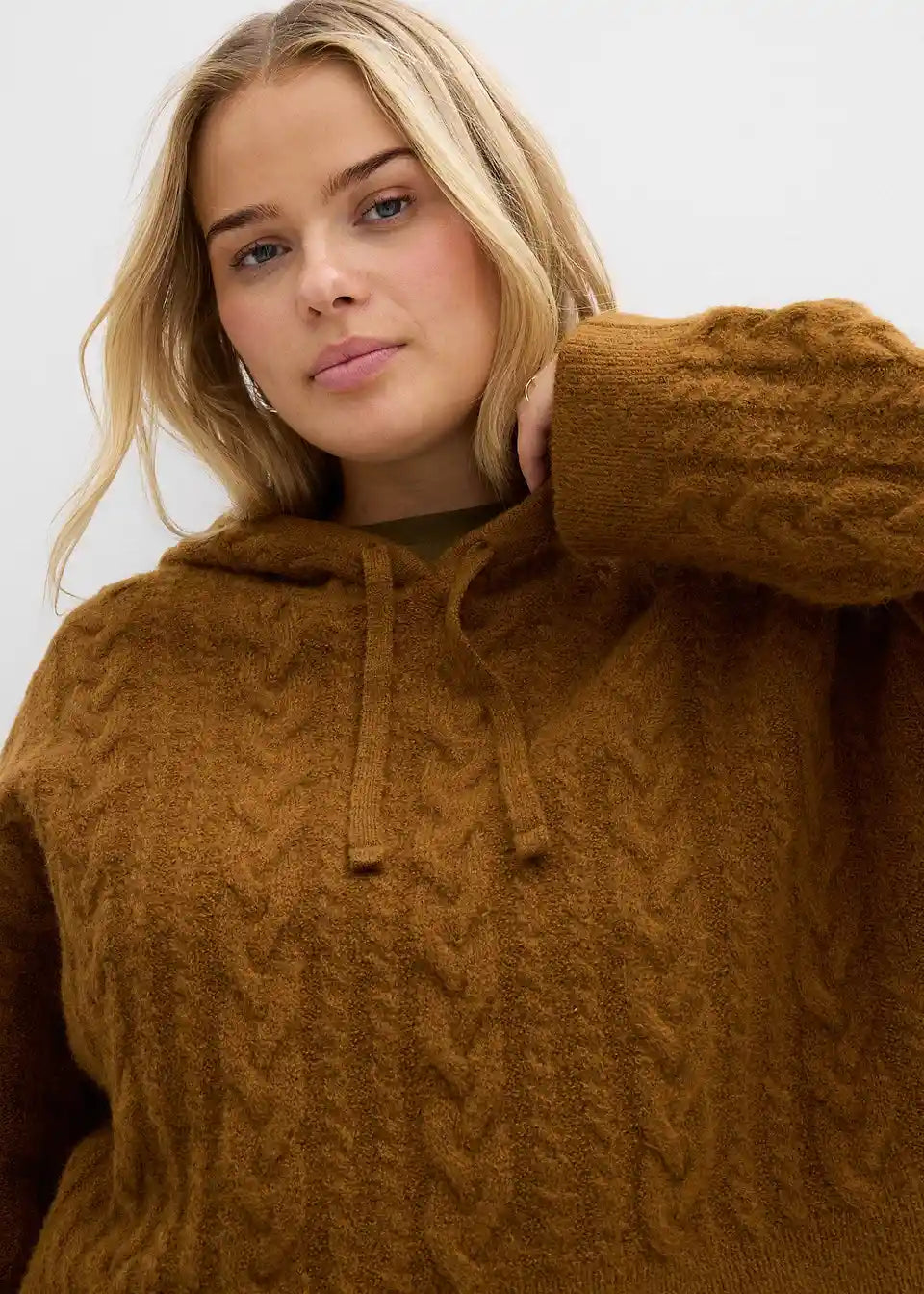 Modno grobo pleten pulover s kapuco in kitastim vzorcem