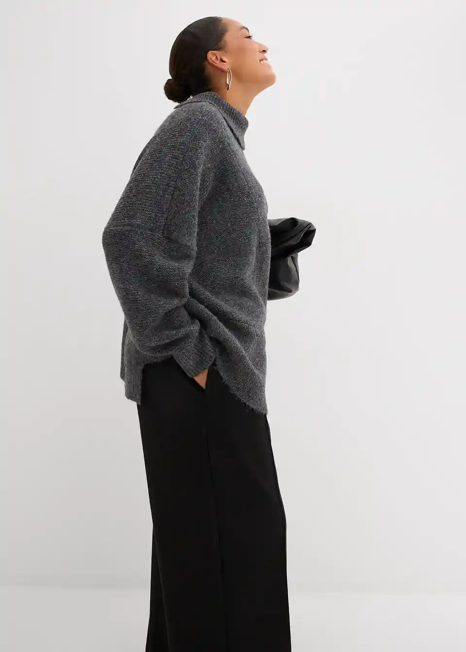 Pulover z asimetrično potekajočim spodnjim robom in deležem volne
