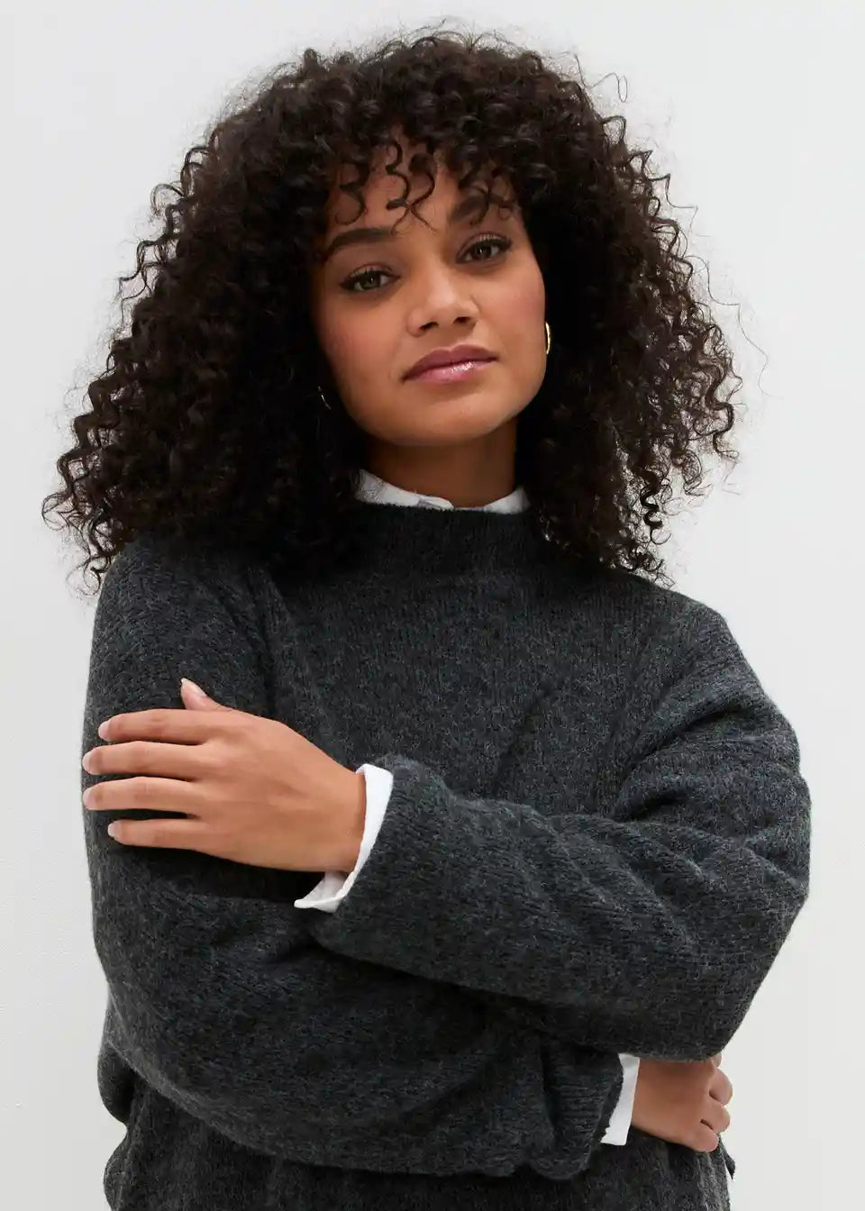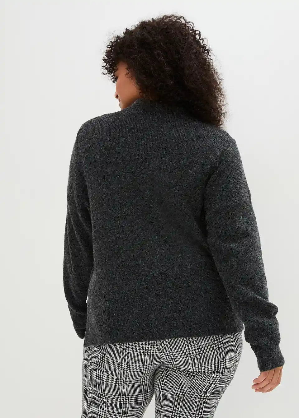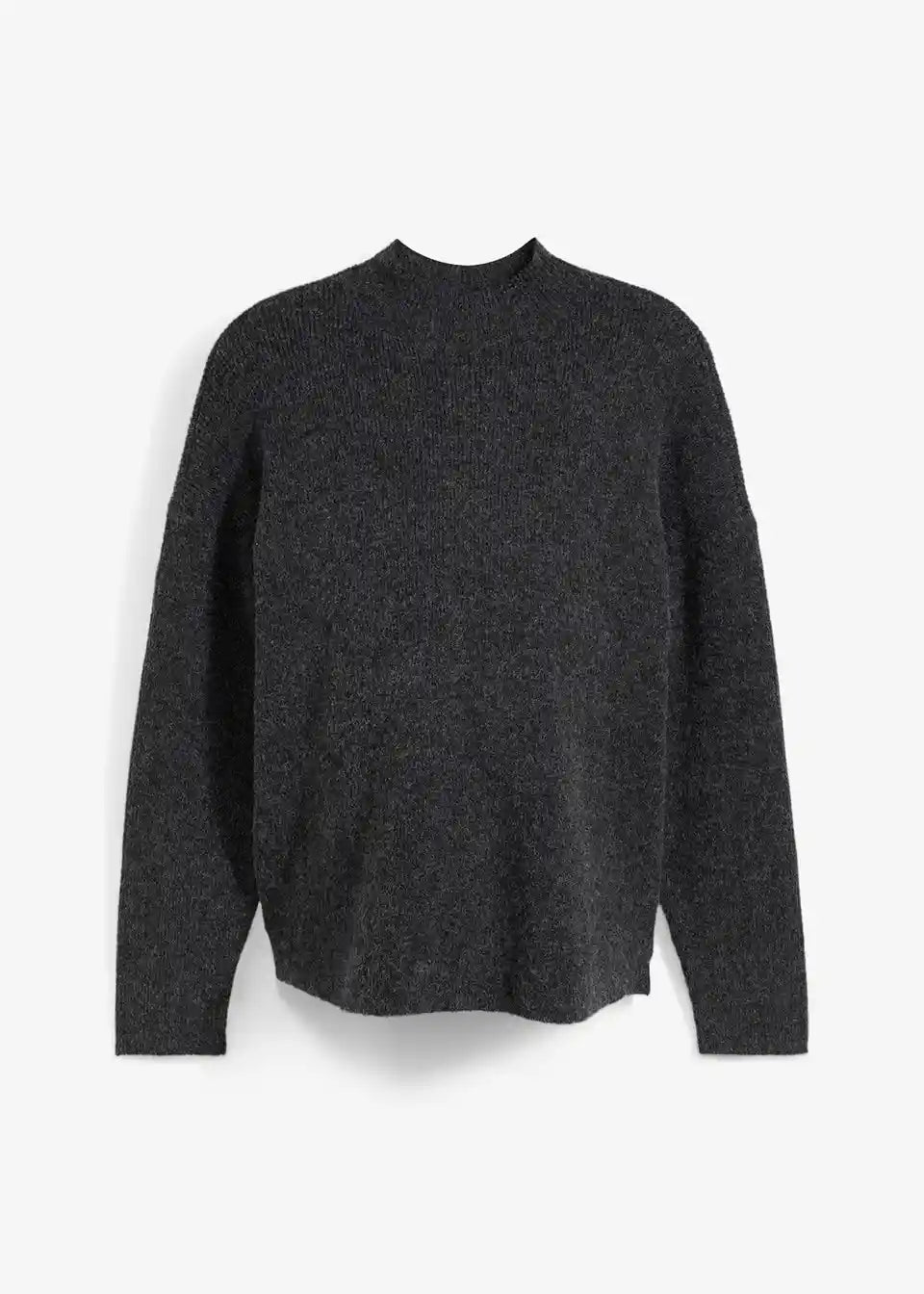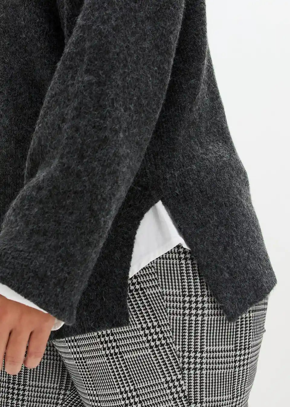 Pulover iz mehke fine pletenine s stranskim razporkom za dojenje, rebrastim okroglim izrezom ter v rokave podaljšanimi ramami.
