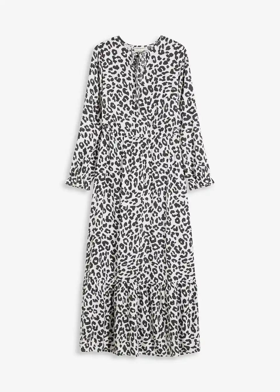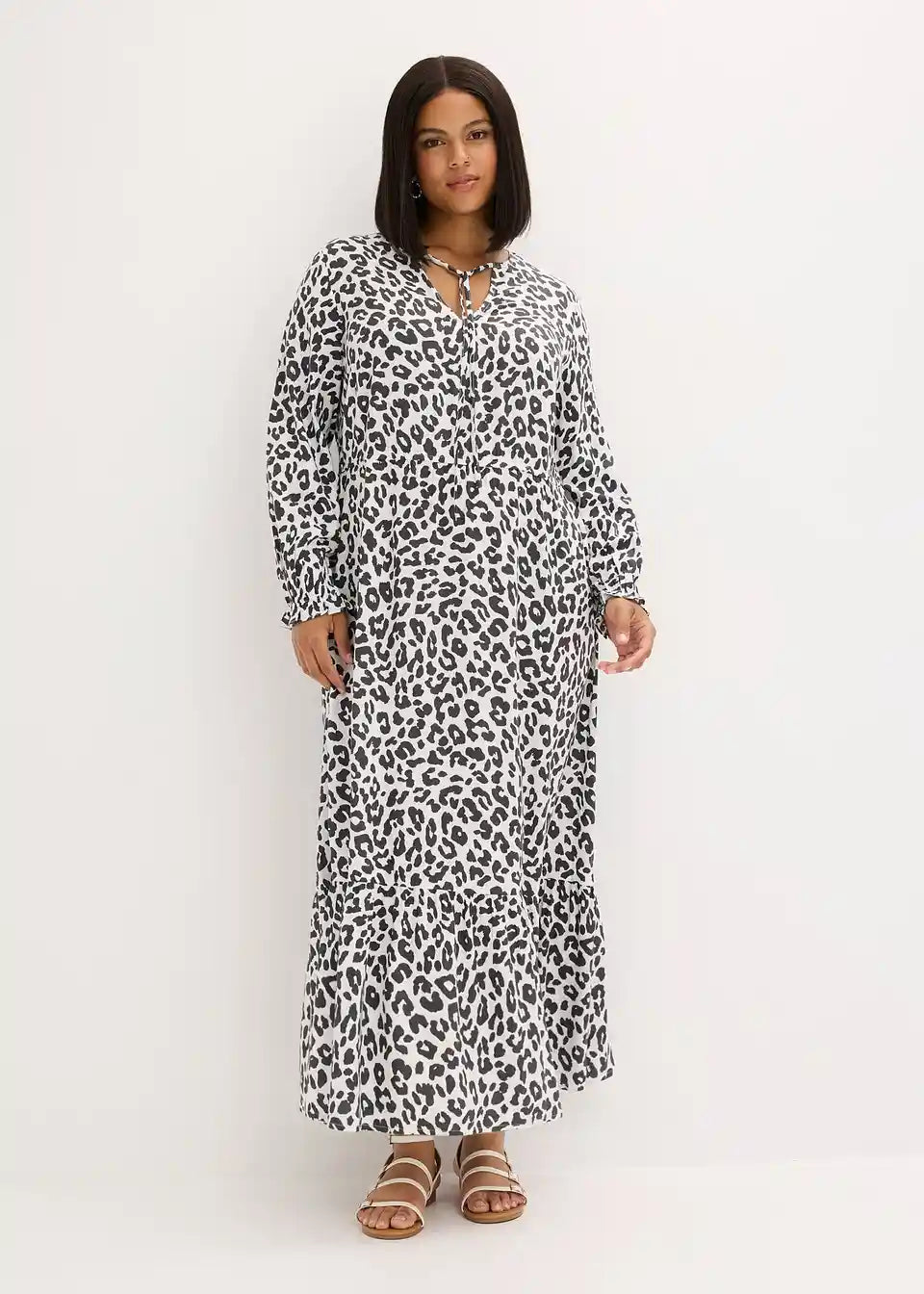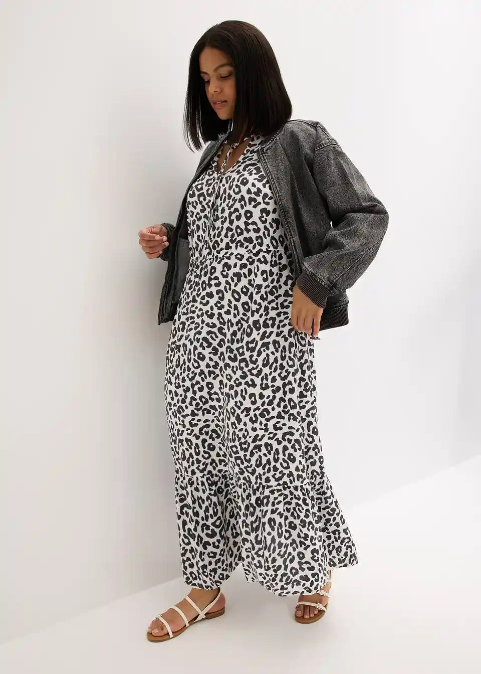 Dolga obleka z volani in trakom za zavezovanje na izrezu