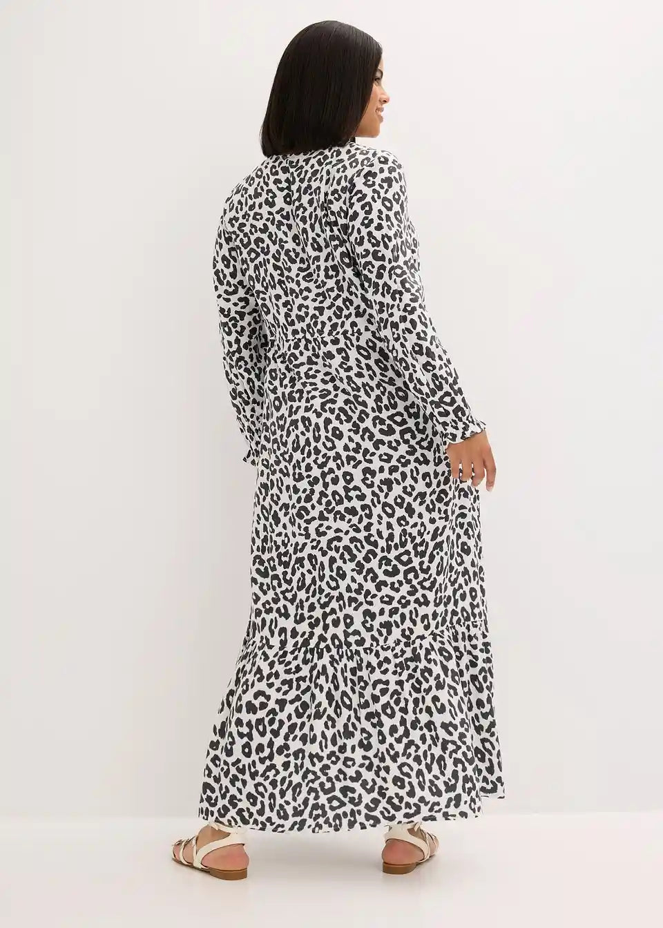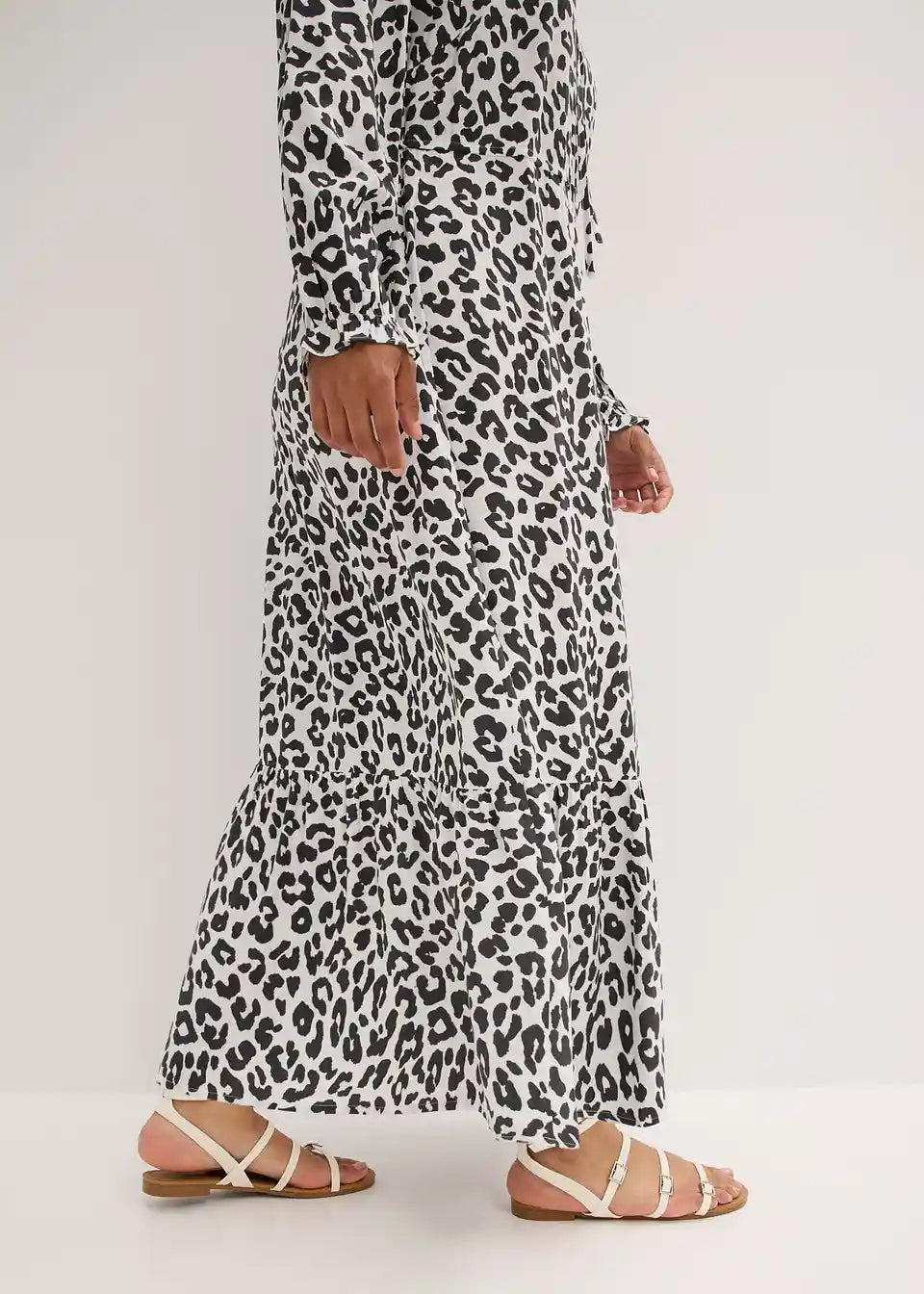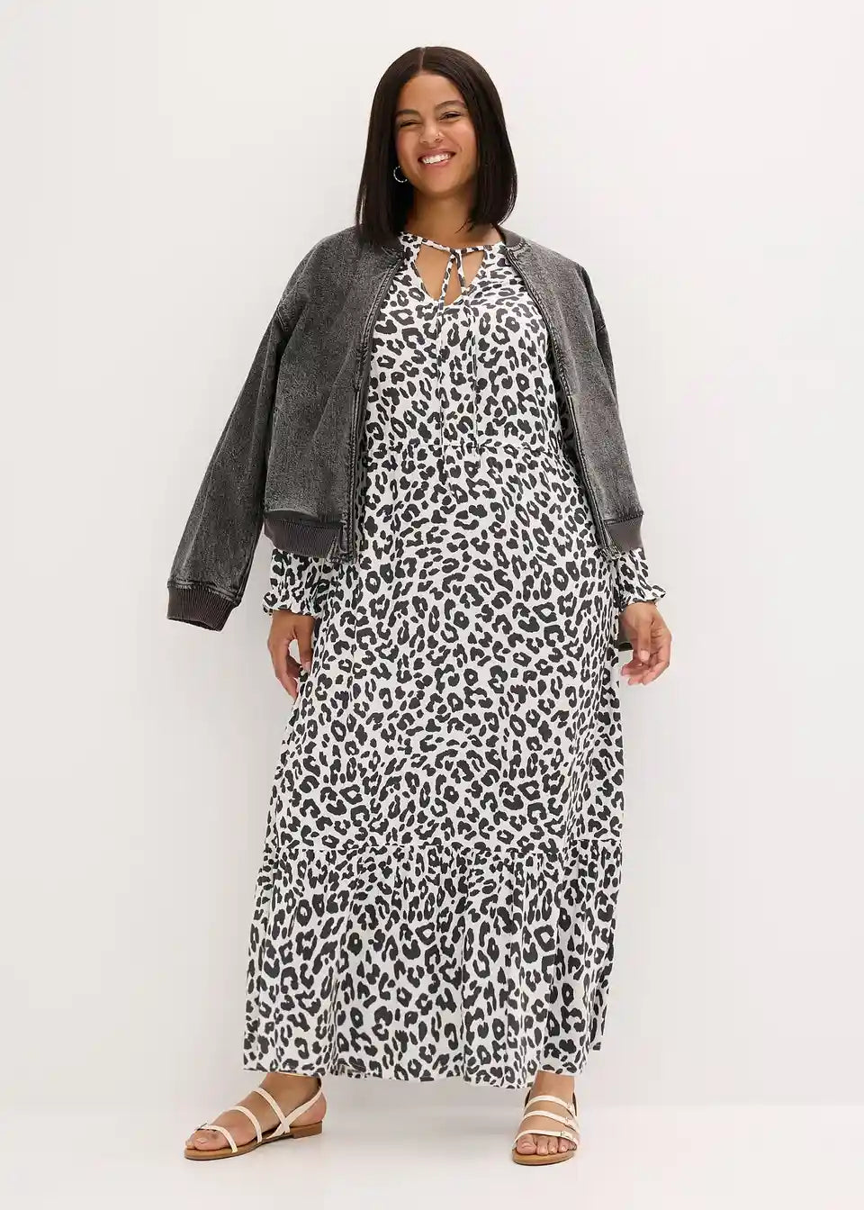 Dolga obleka z volani in trakom za zavezovanje na izrezu