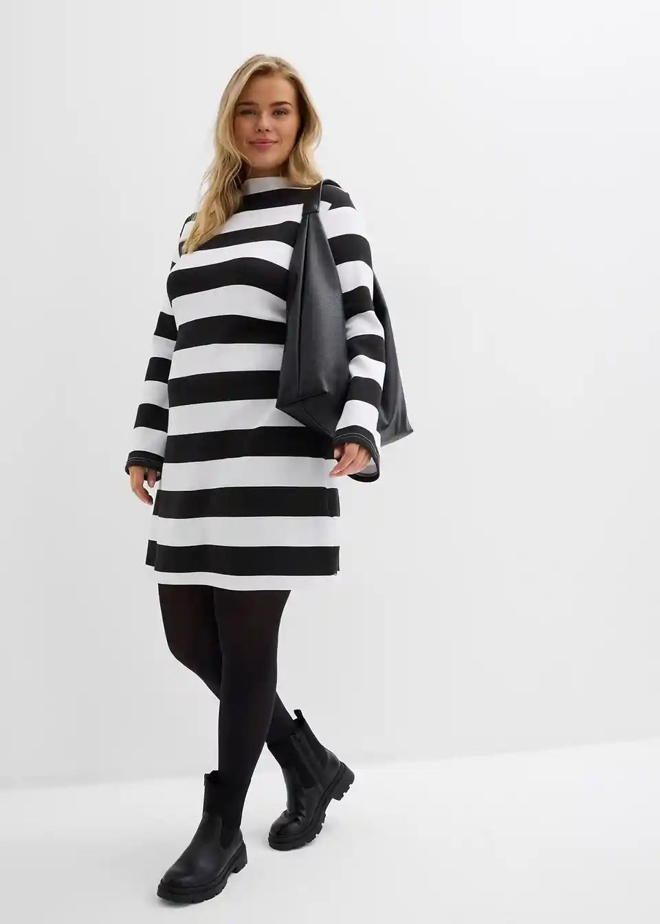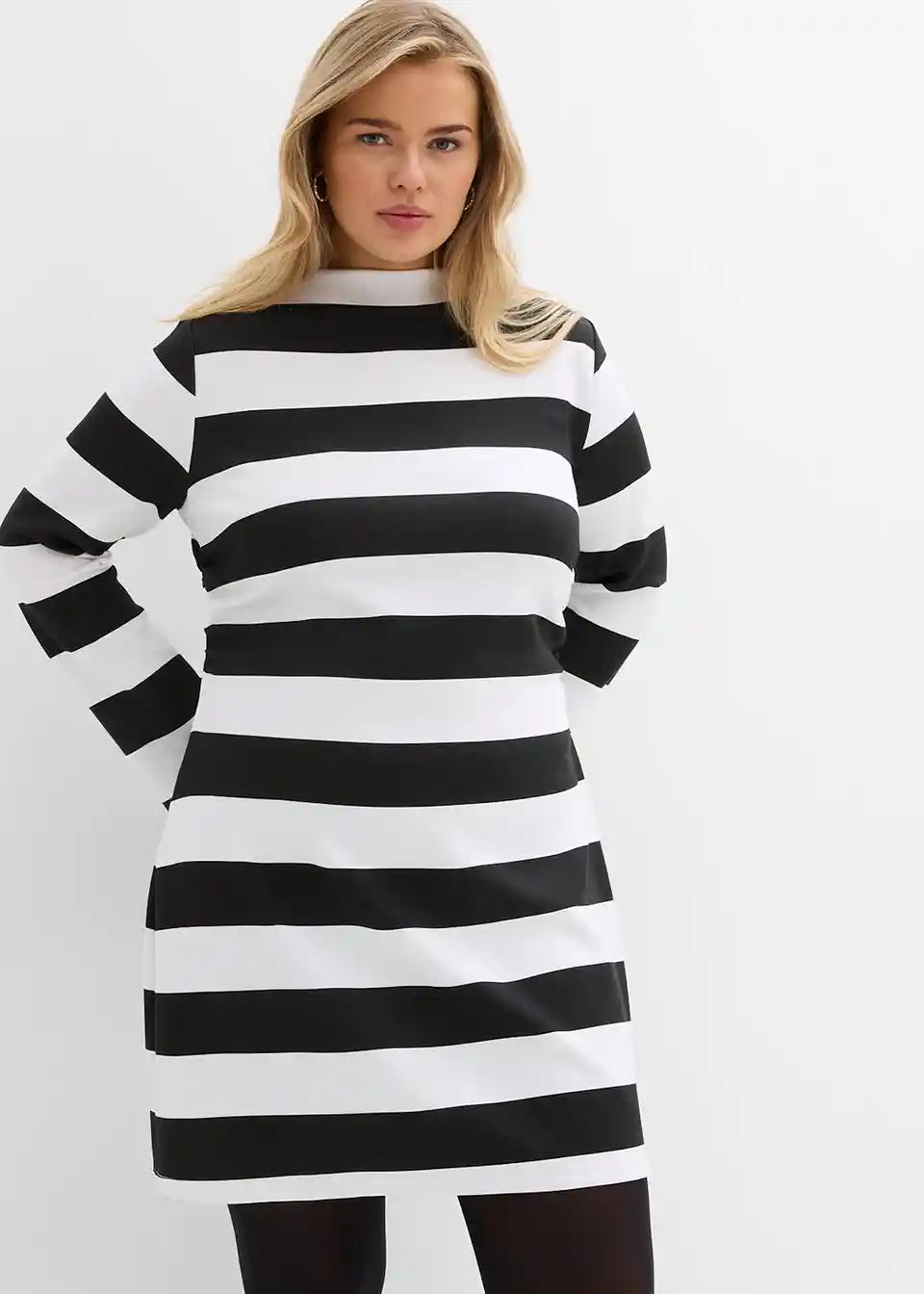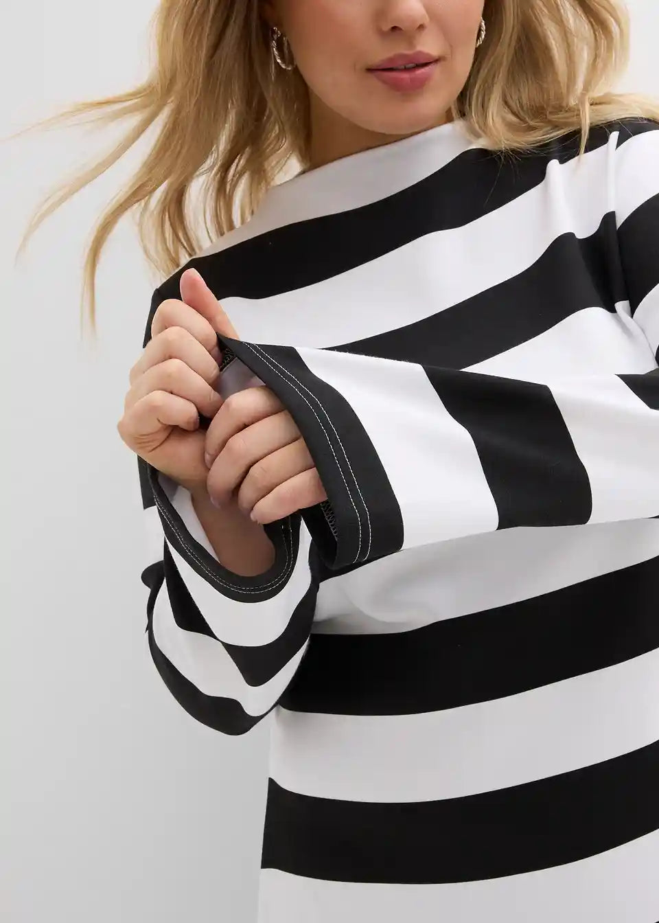 Moderna obleka iz jerseyja s pokončnim ovratnikom in stranskimi naborki