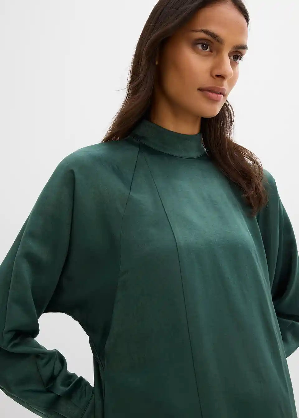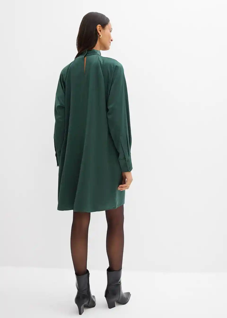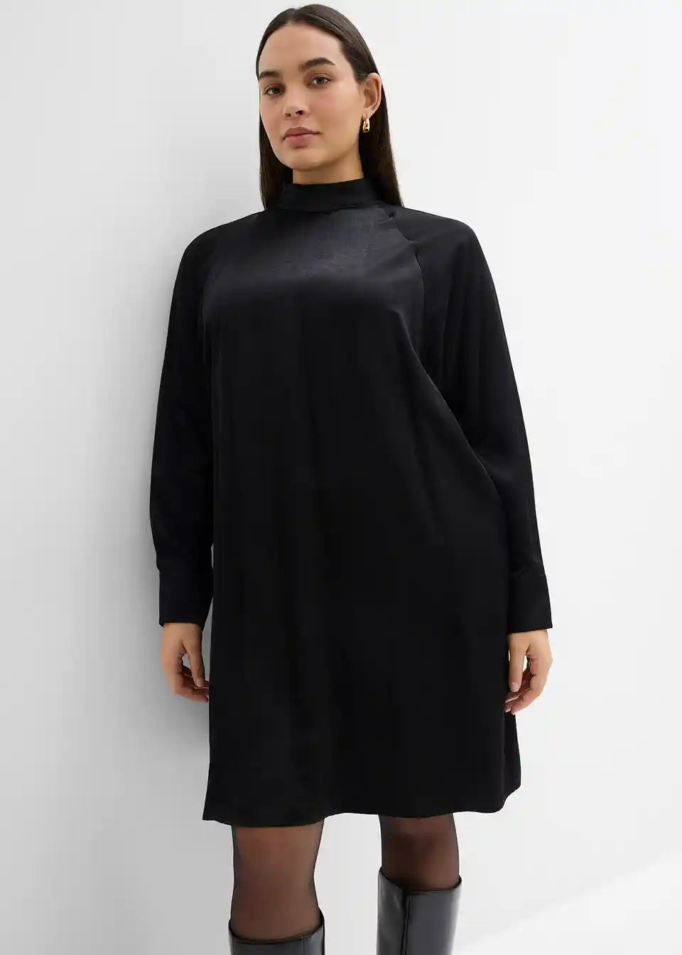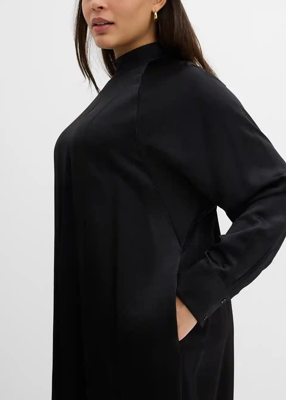 Mini obleka s pokončnim ovratnikom, z netopirskimi rokavi in stranskimi všitimi žepi