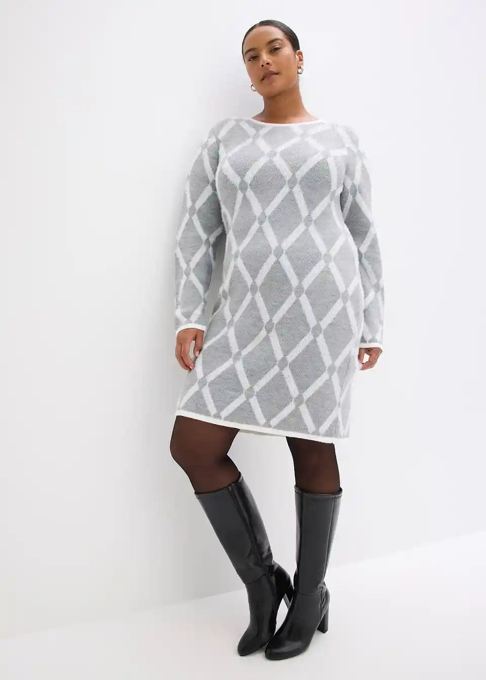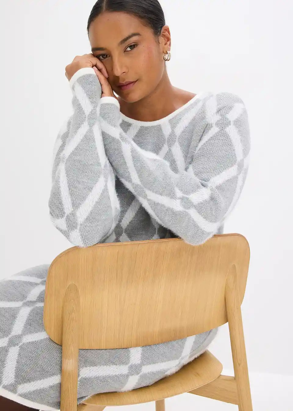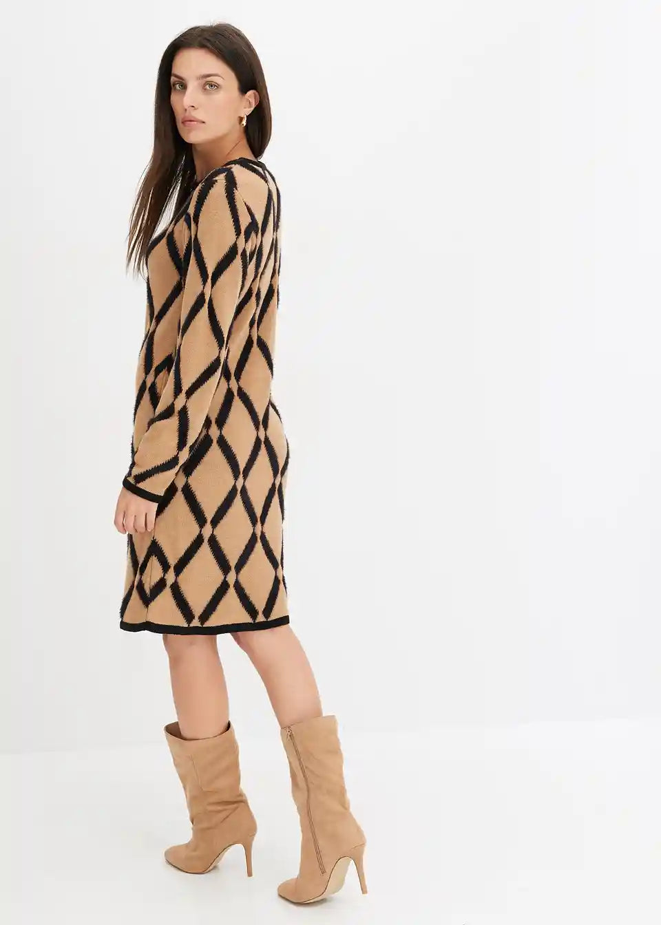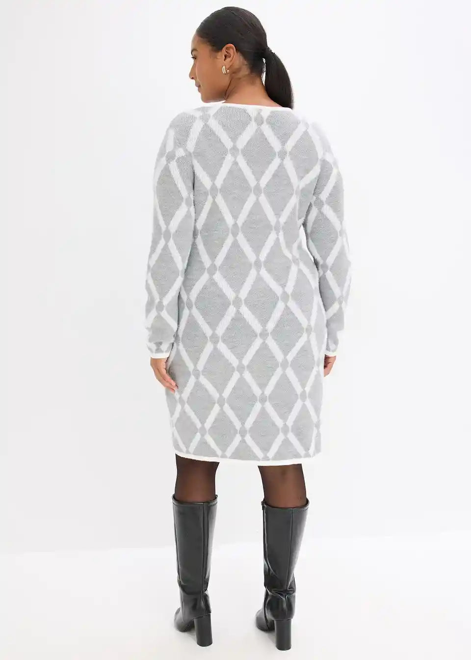Elegantna pletena obleka z rombastim vzorcem s puhastimi vlakni