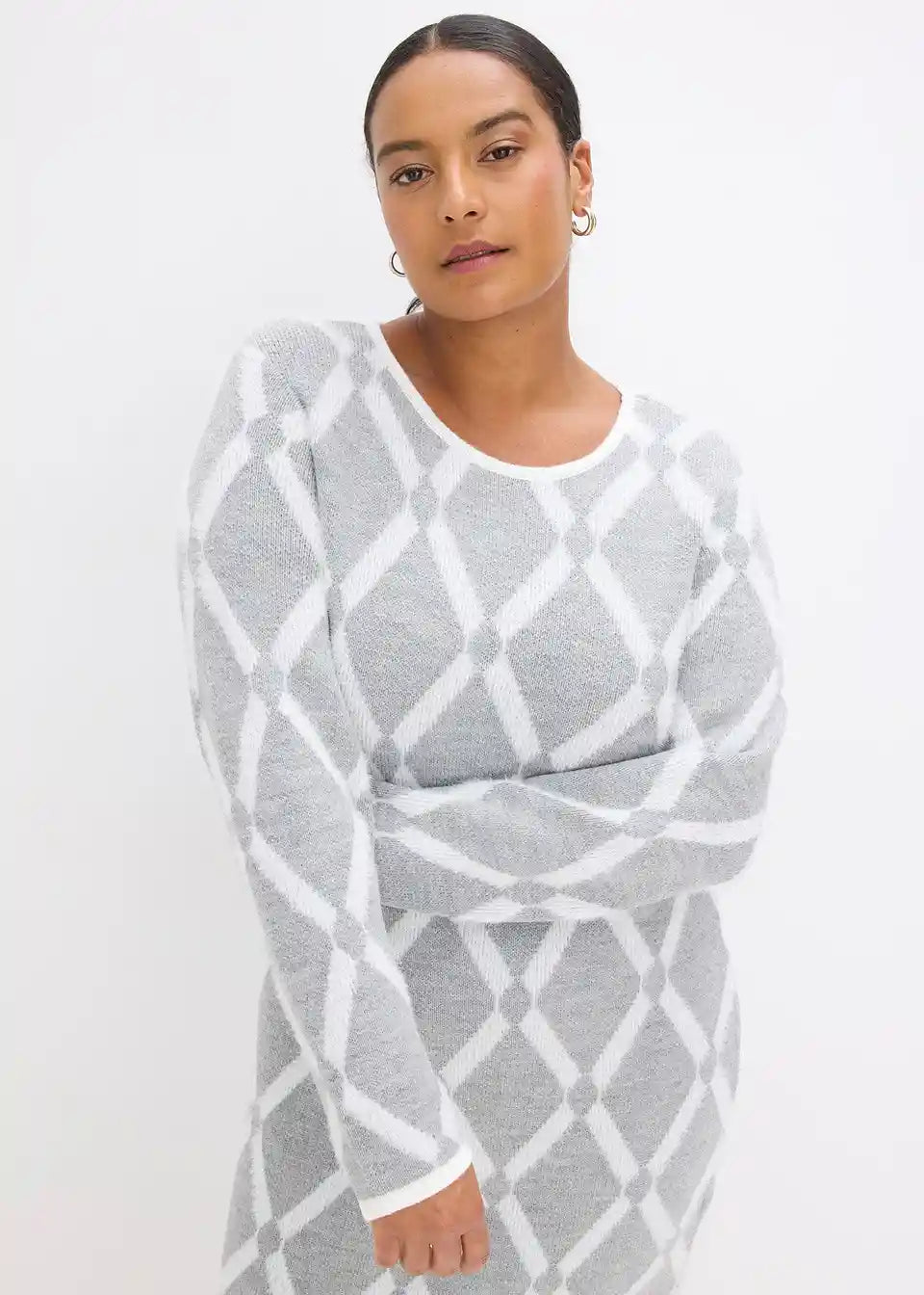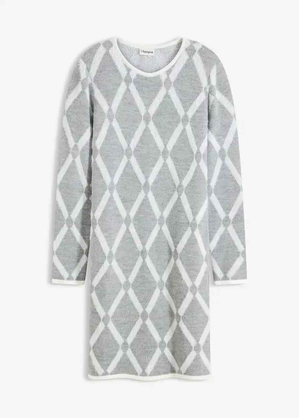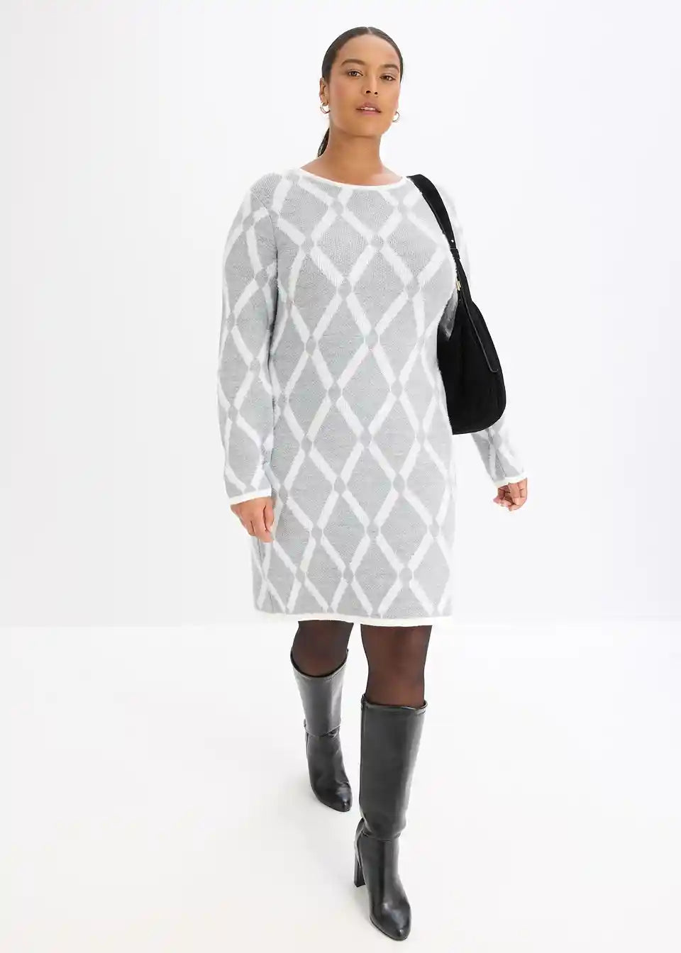 Pletena obleka z rombastim vzorcem in puhastimi vlakni
