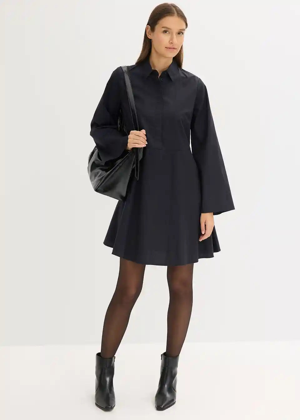 Kratka obleka z zakrito letvijo za zapenjanje z gumbi in rahlo razširjenimi rokavi