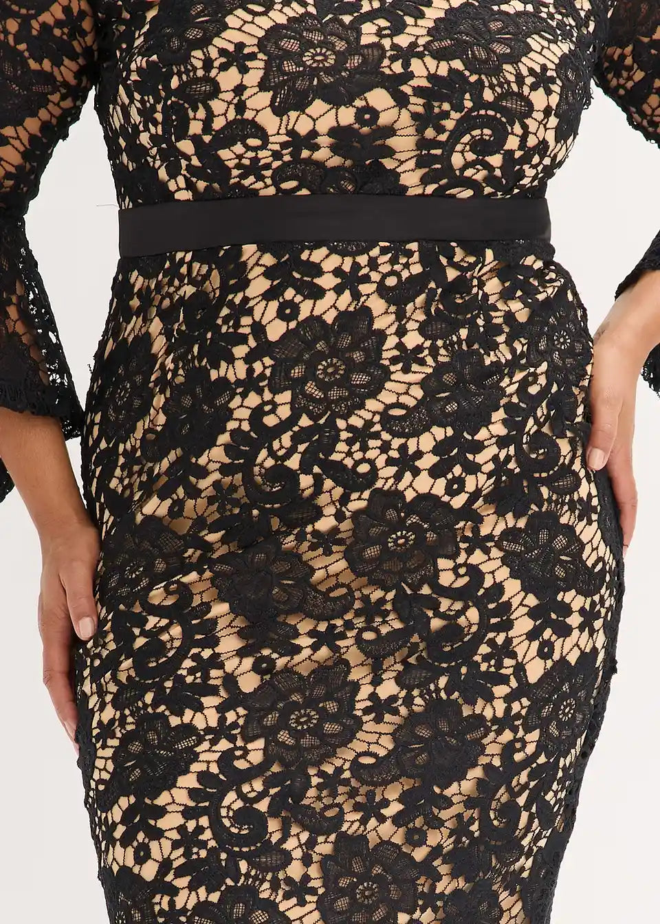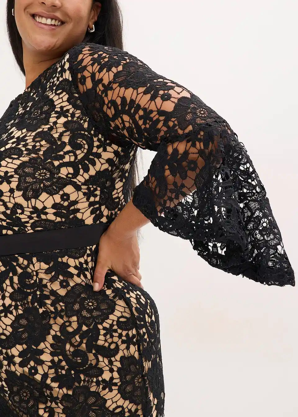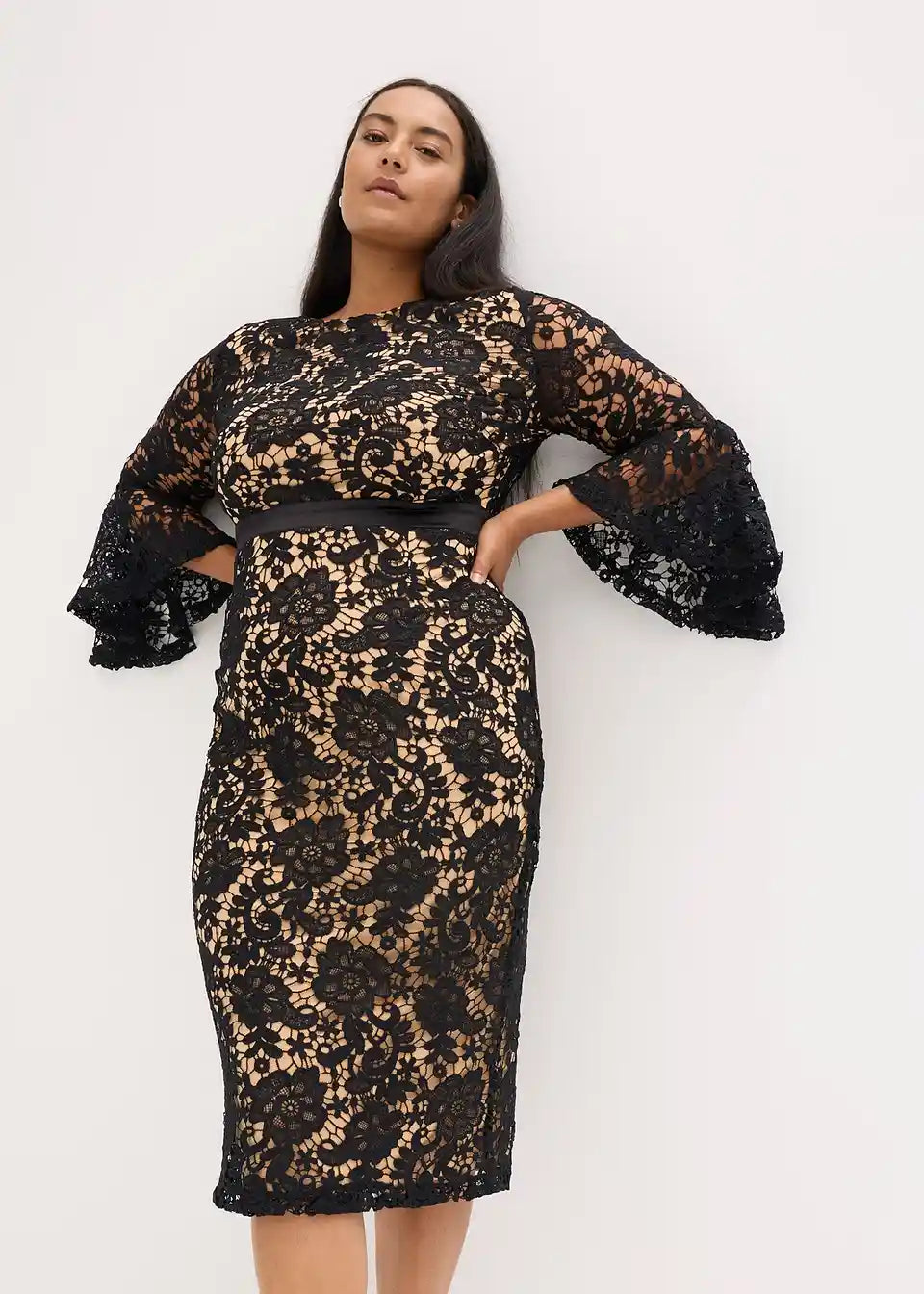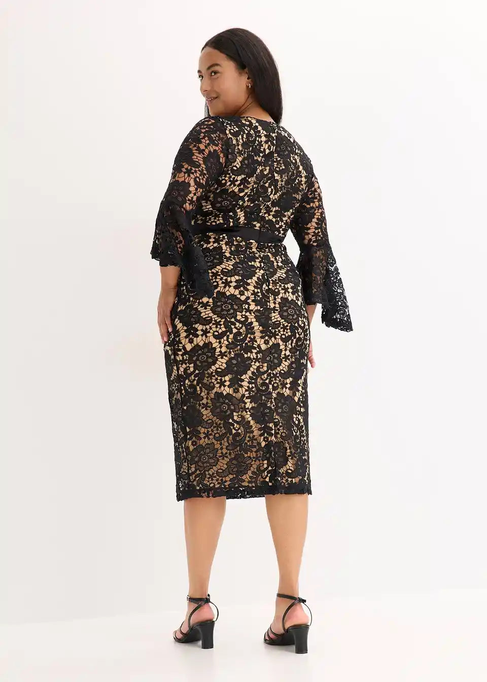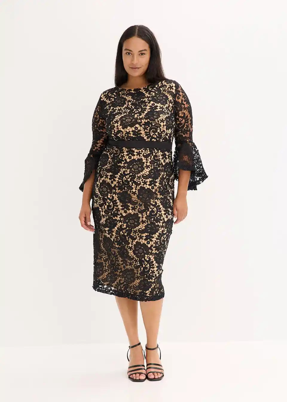 Moderna in ženstvena večerna obleka iz očarljive čipke v midi dolžini s satenastim všitkom v pasu in volani na rokavih