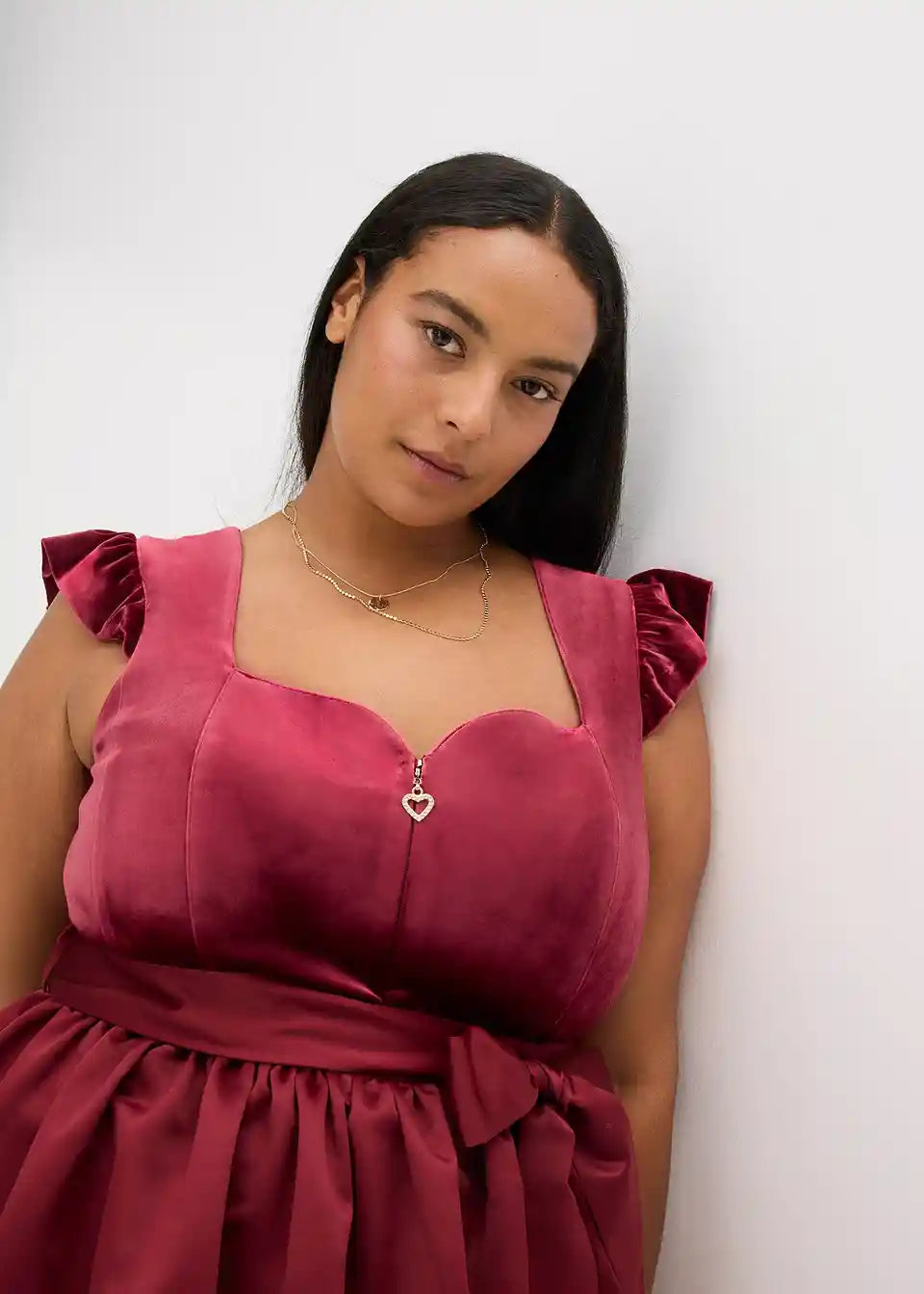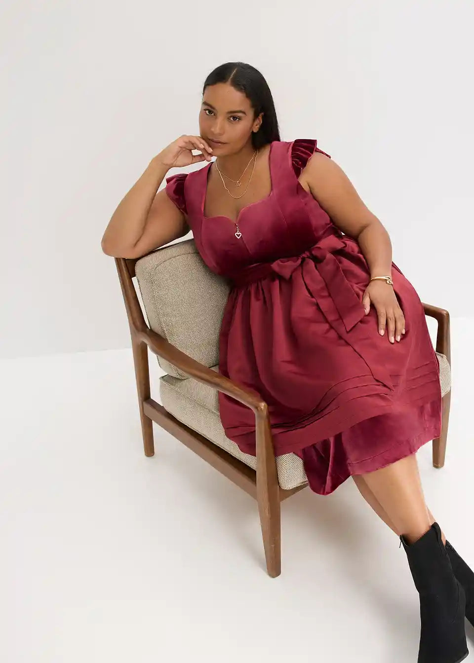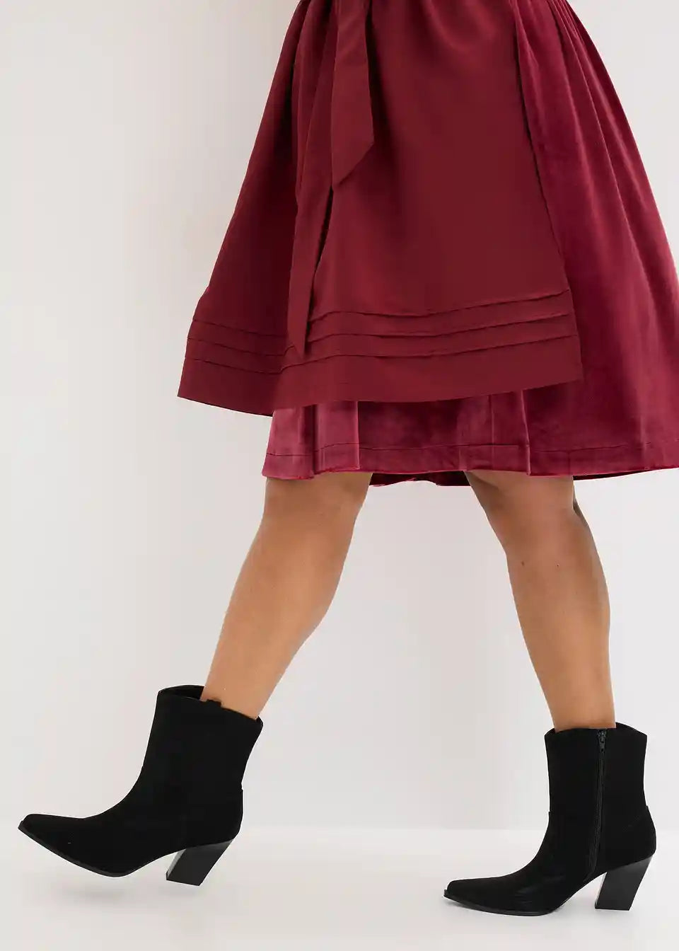 Moderno in ženstveno: dirndl iz žameta z v srce oblikovanim izrezom in naborki na rokavih ter predpasnikom iz sijočega satena