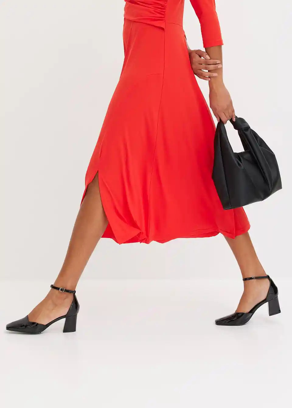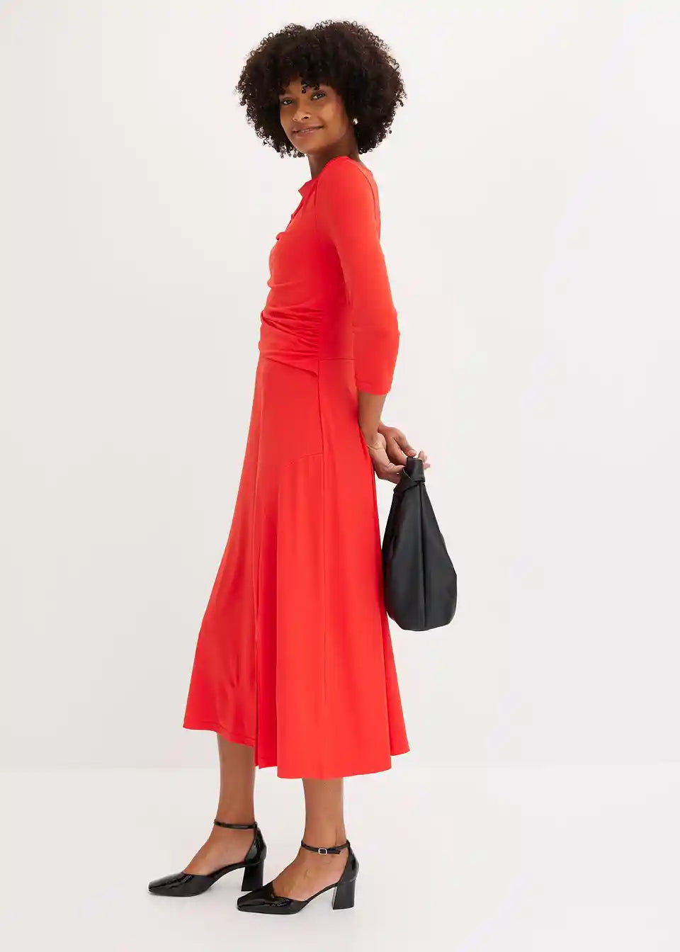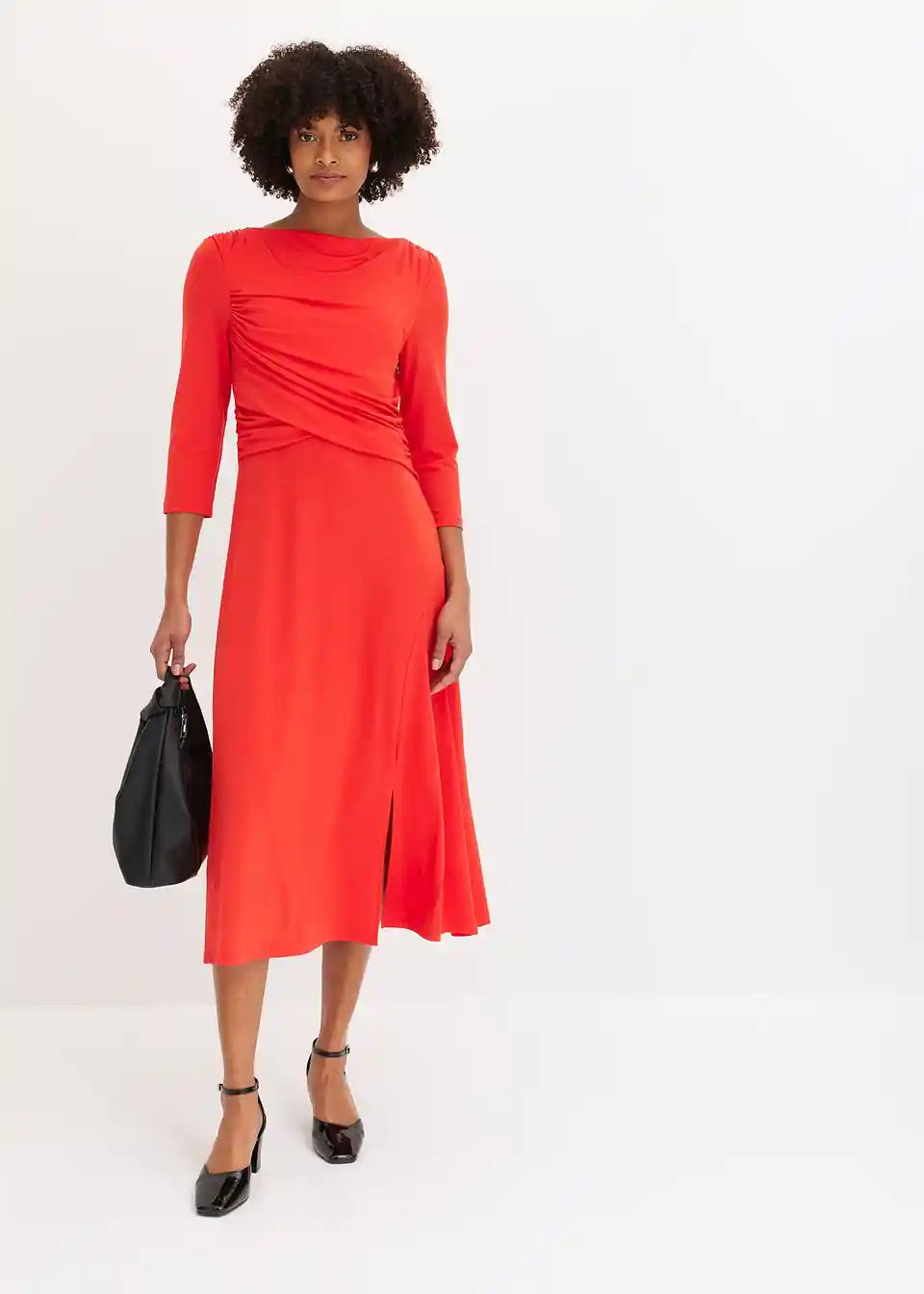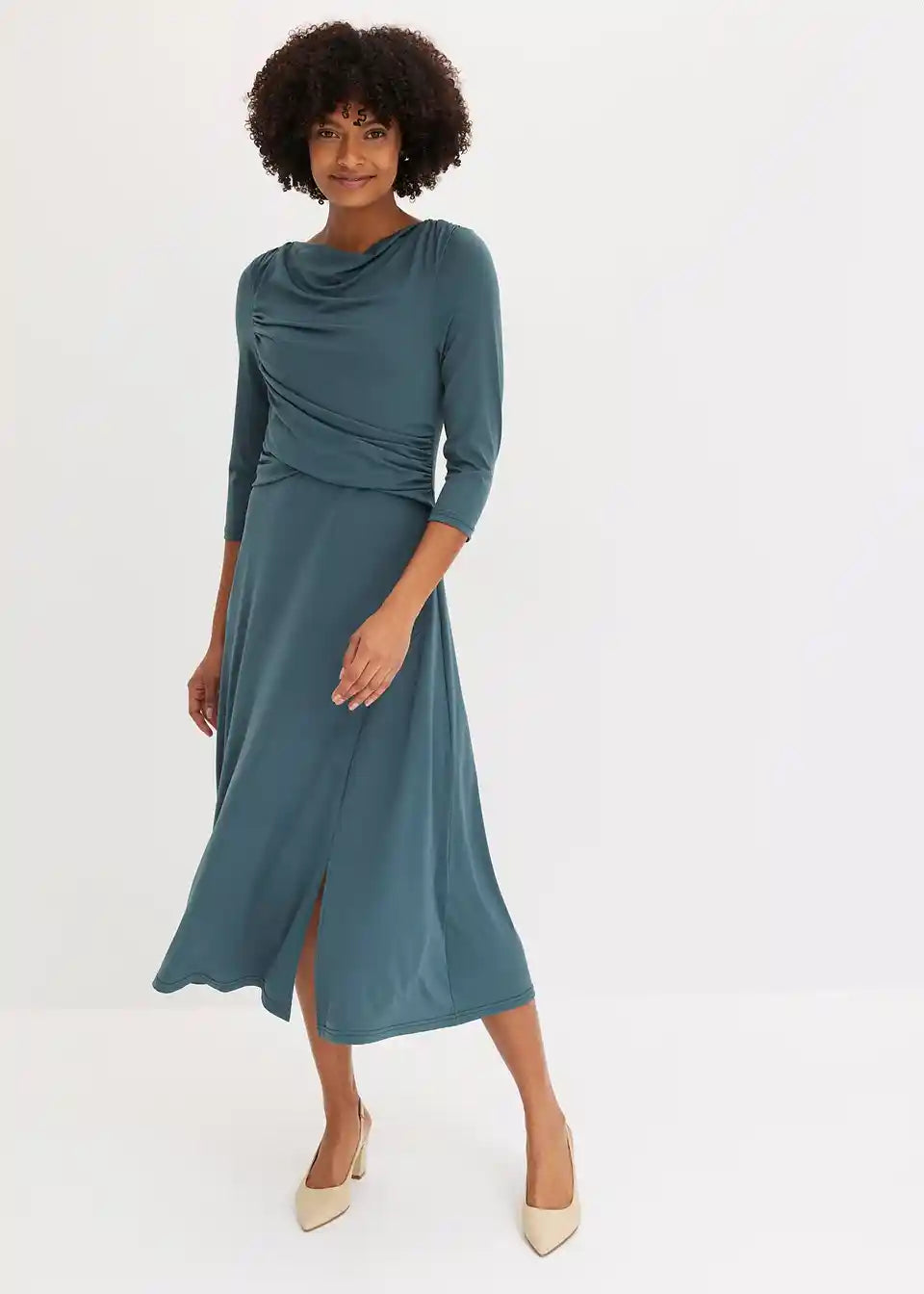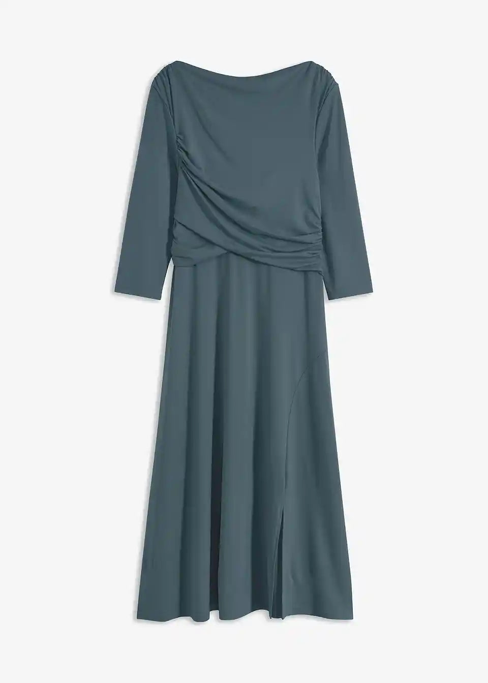 elegantna drapirana midi obleka z vodoravnim izrezom