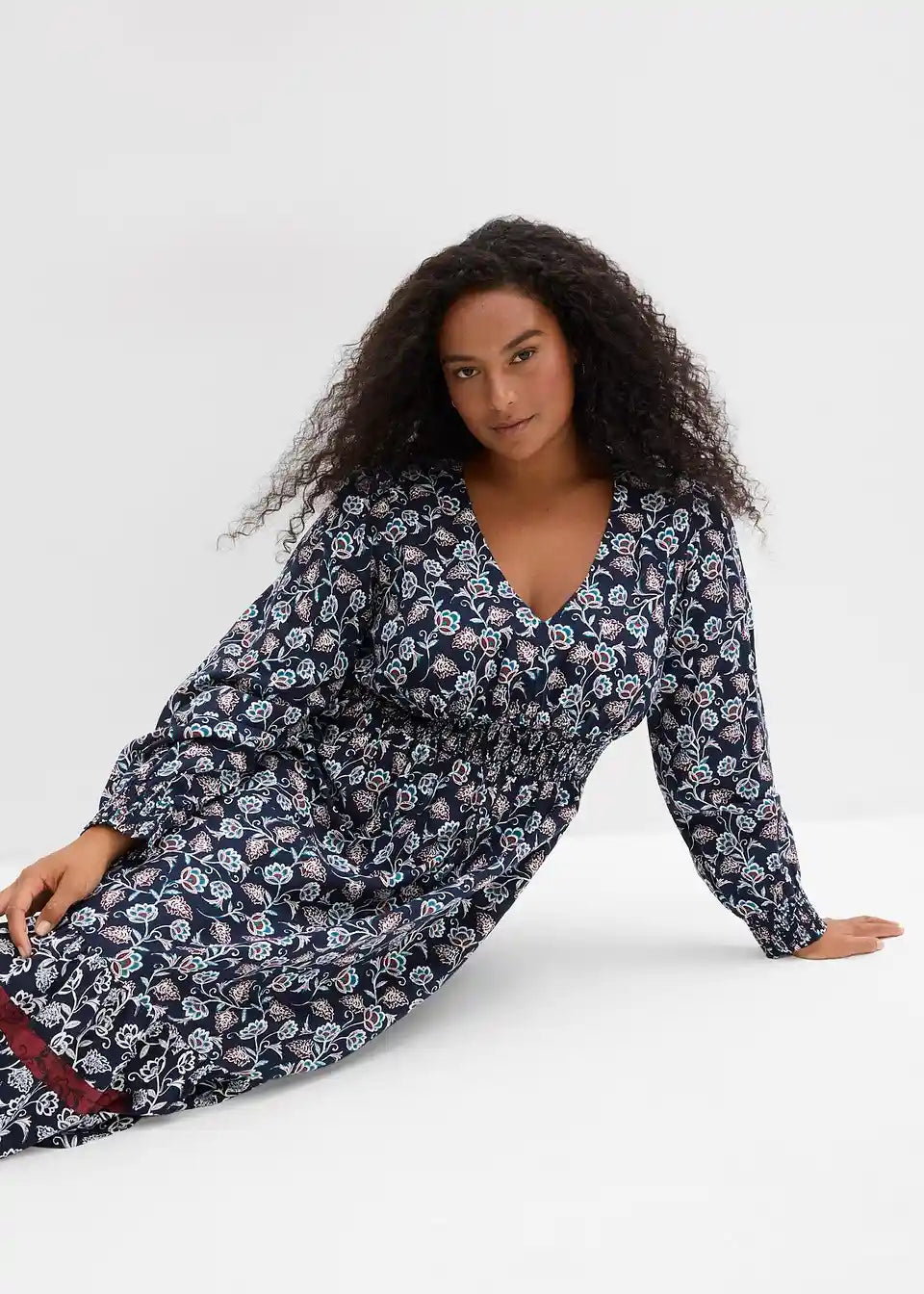 Široka obleka iz viskoze z globokim V-izrezom