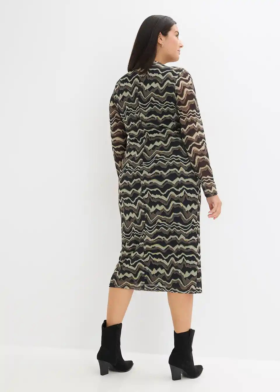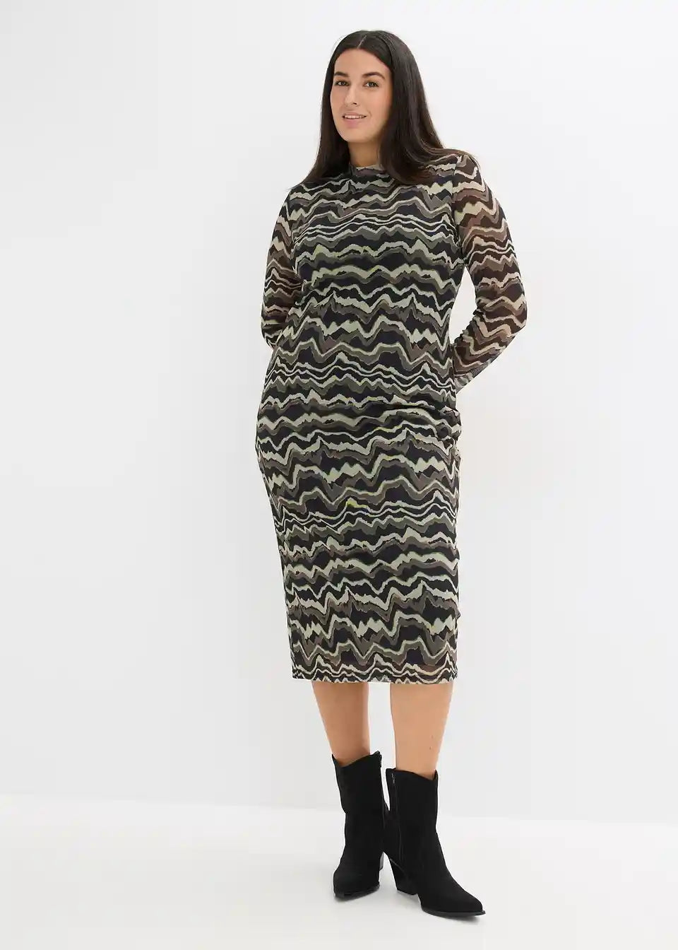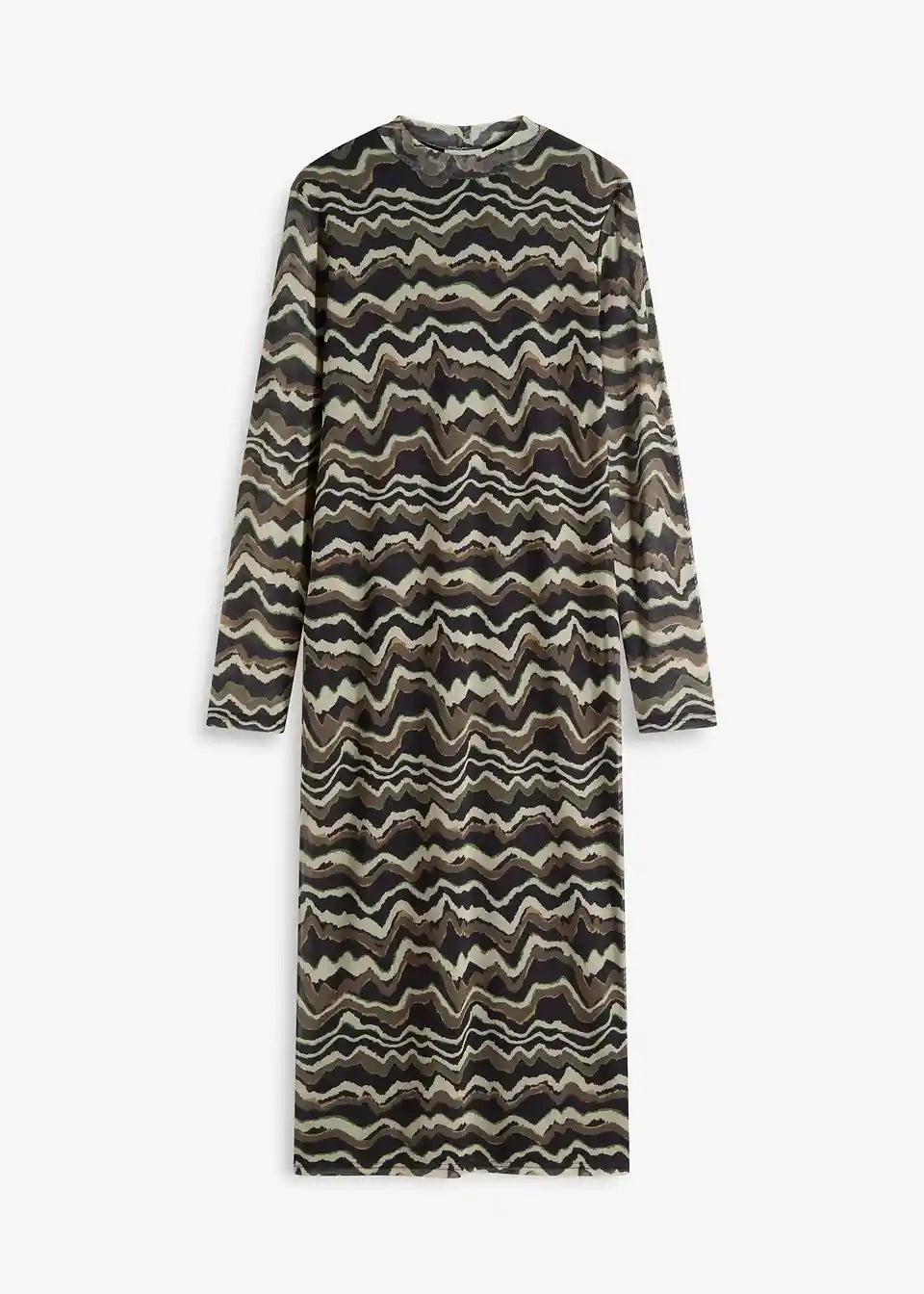 Modno potiskana midi obleka iz jerseyja iz mehke mreže s pokončnim ovratnikom