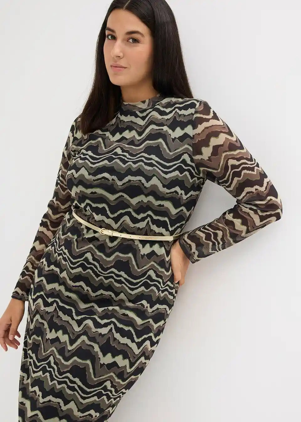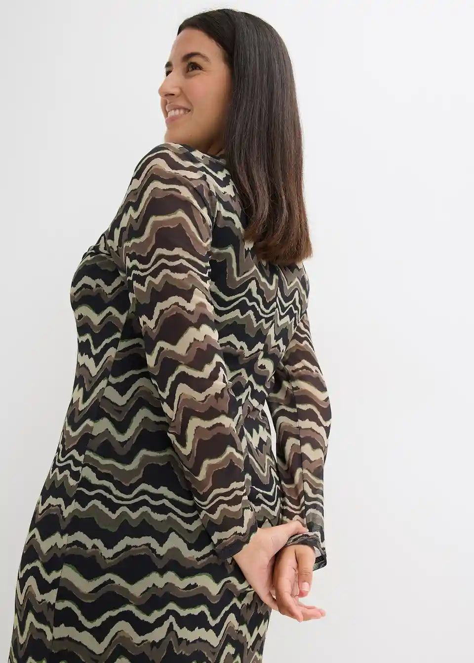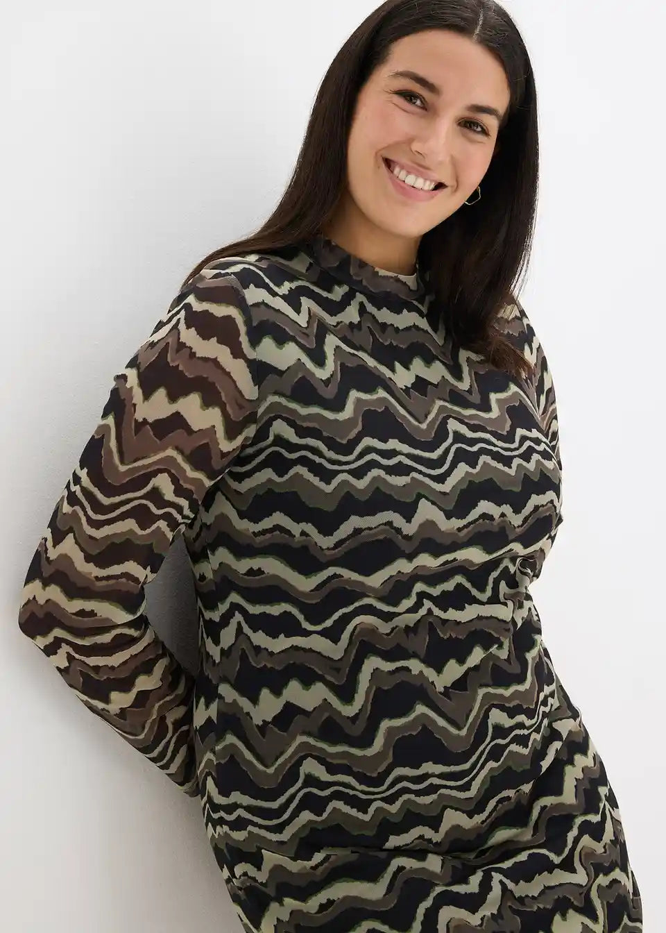 Modno potiskana midi obleka iz jerseyja iz mehke mreže s pokončnim ovratnikom