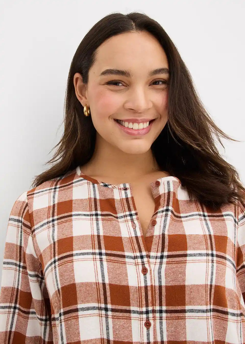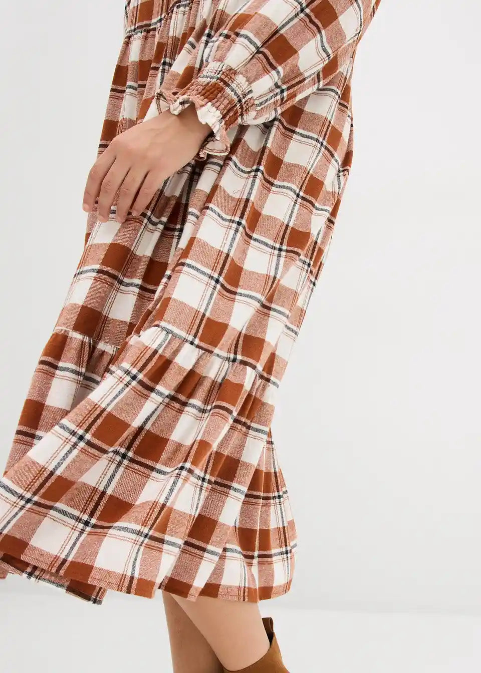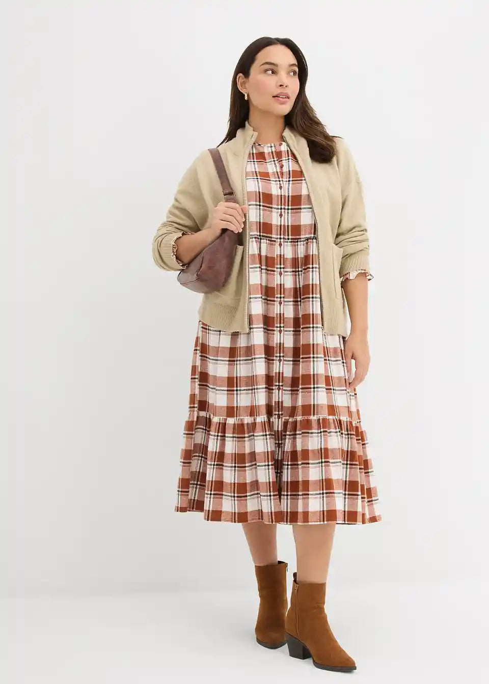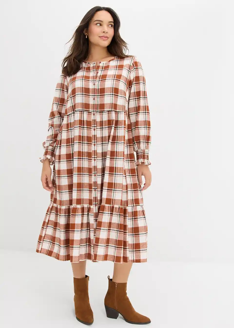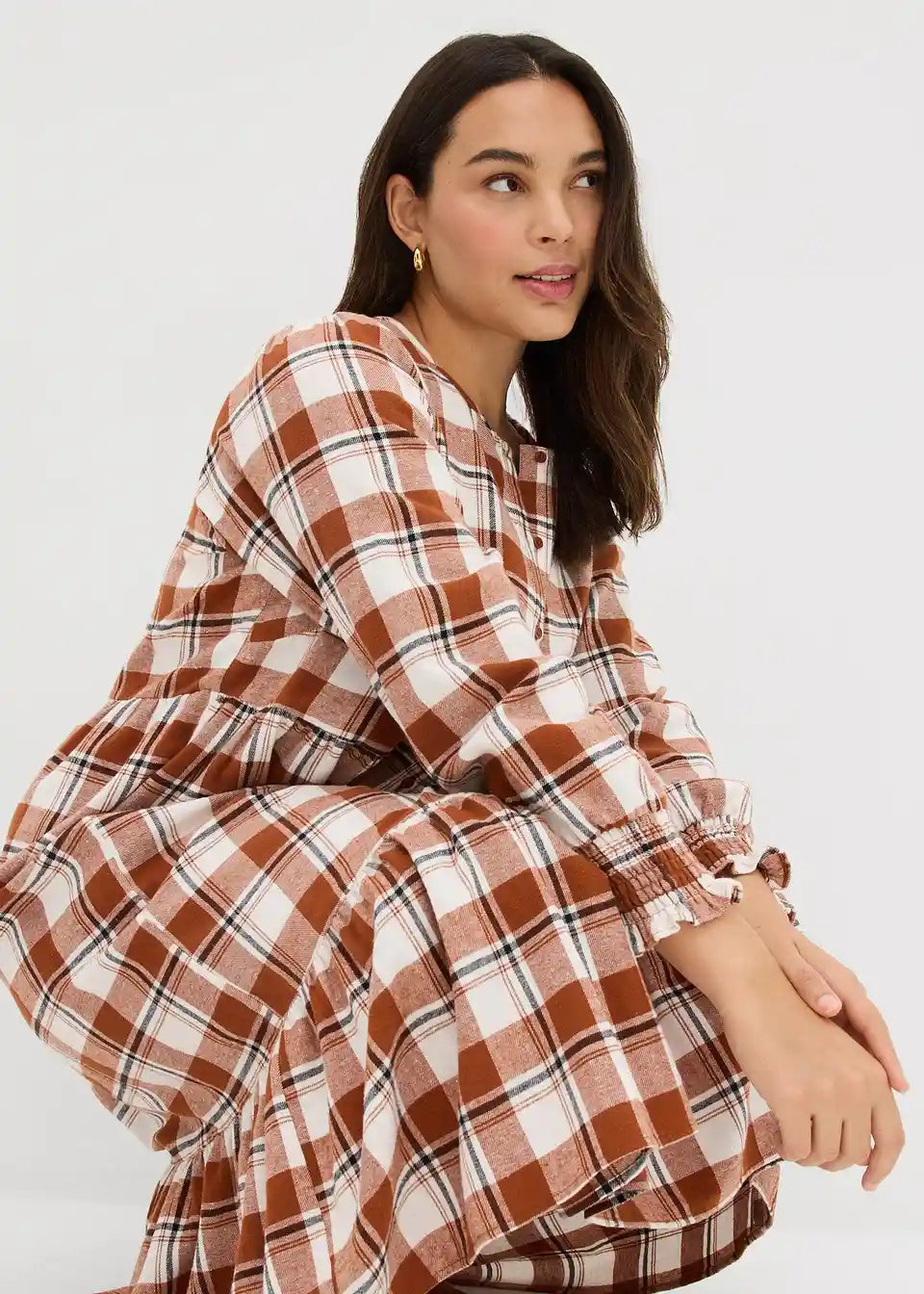 Midi obleka v A-kroju iz čistega bombaža s po vsej dolžini potekajočo letvijo za zapenjanje z gumbi spredaj in elastičnimi patentnimi obrobami na rokavih.