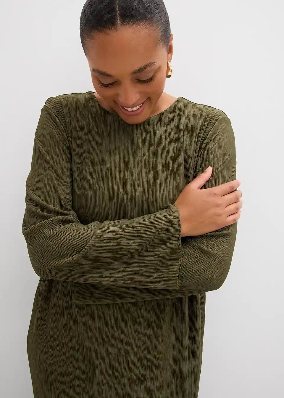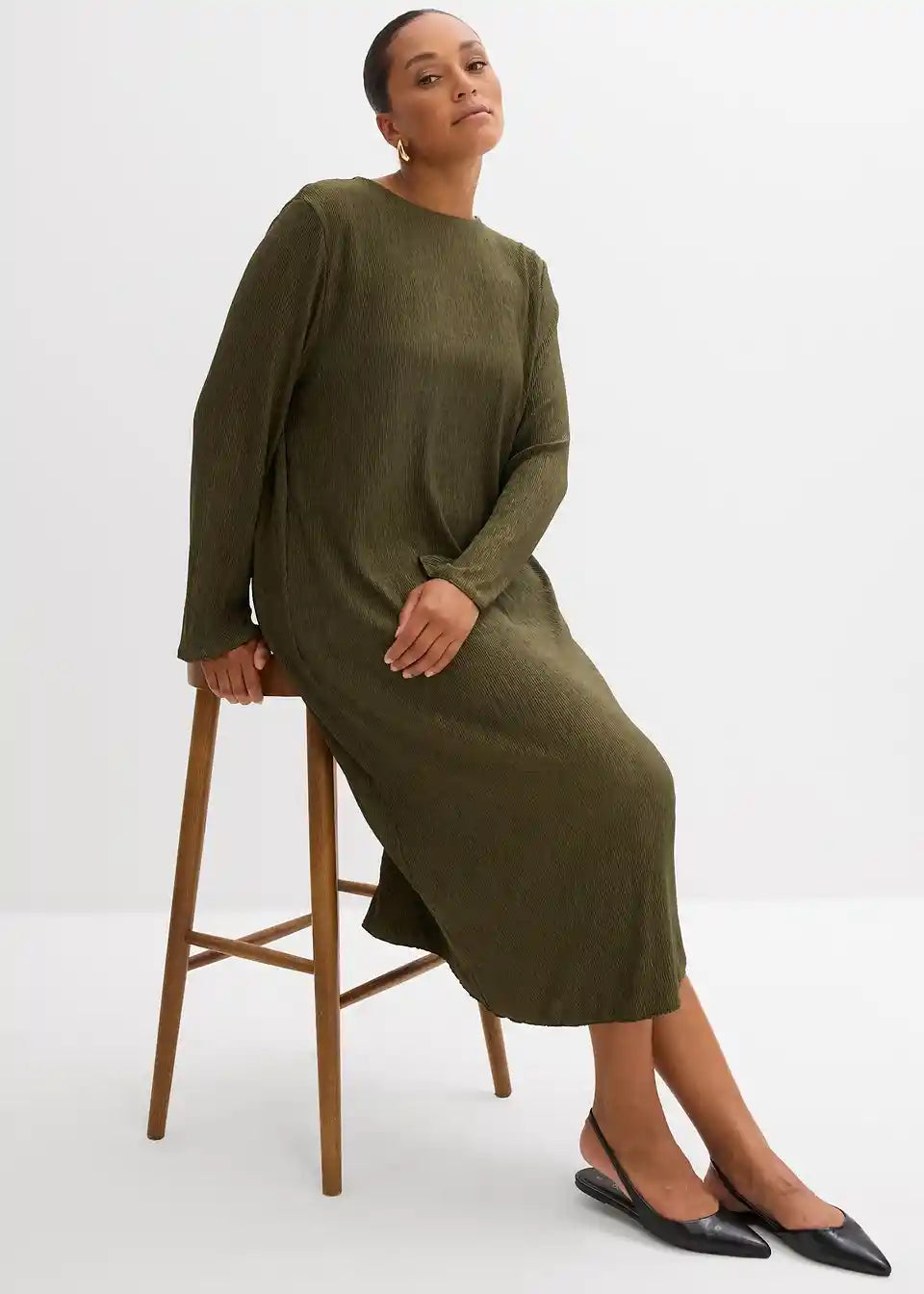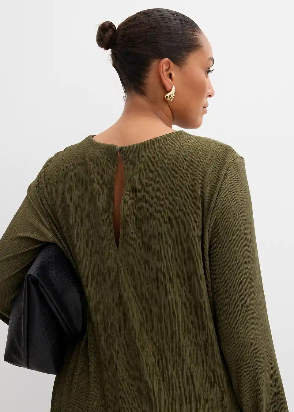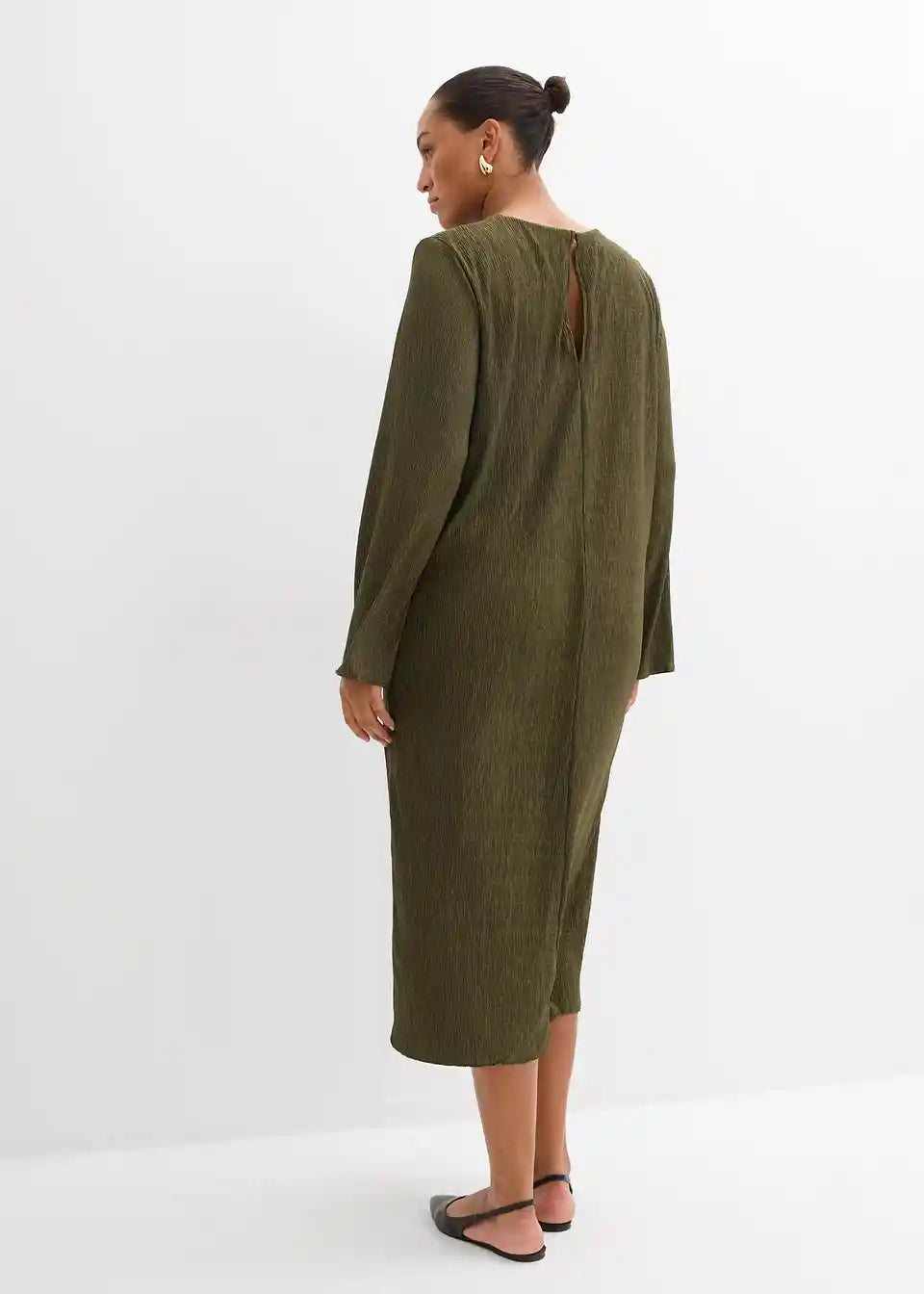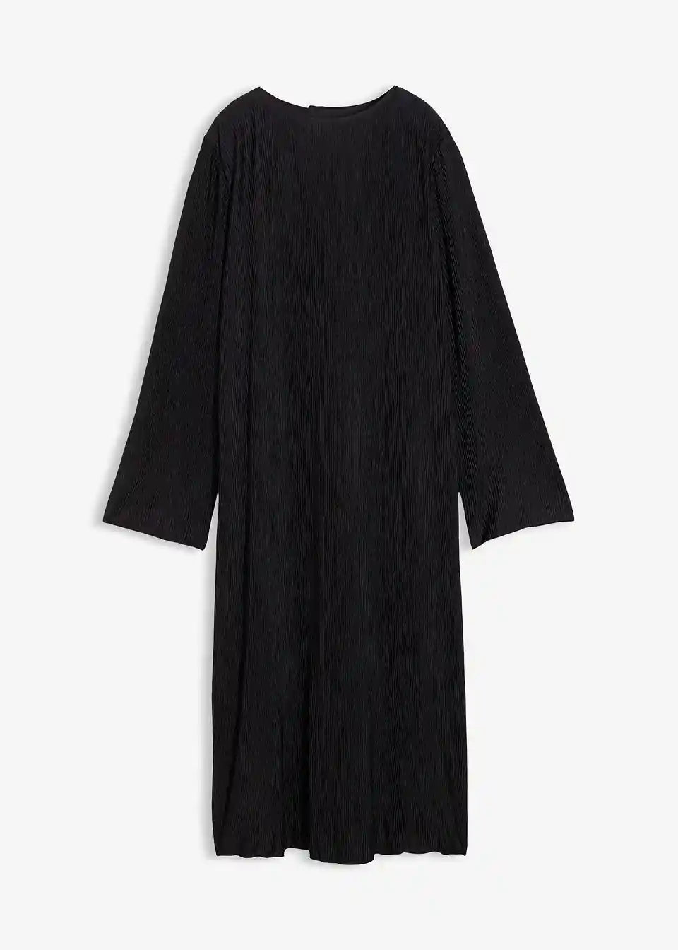 Ravno krojena obleka z dolgimi rokavi in odprtino v obliki kapljice za zapenjanje zadaj iz mečkanke