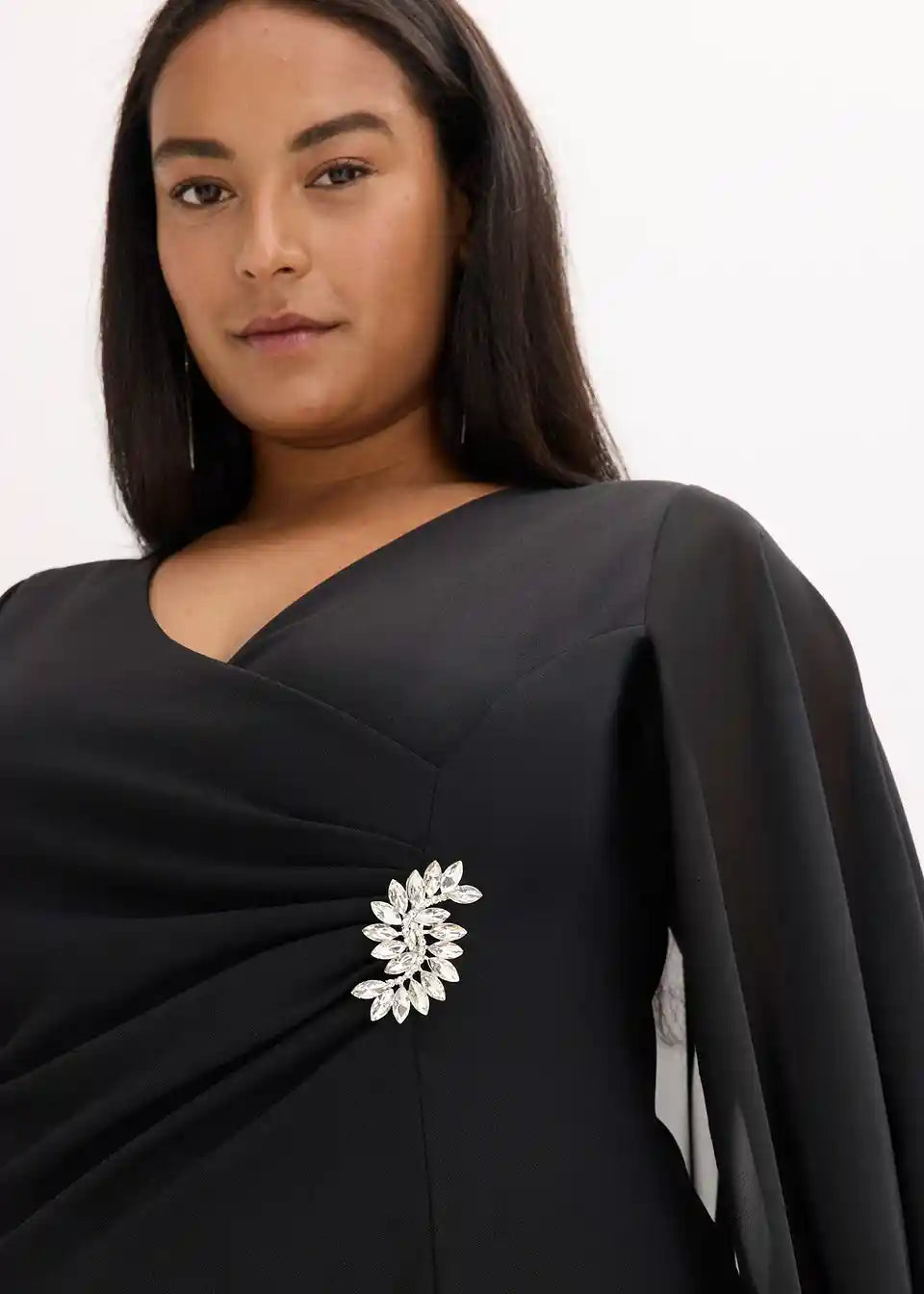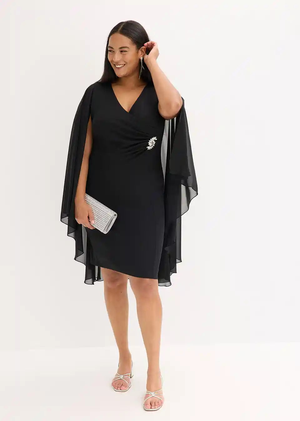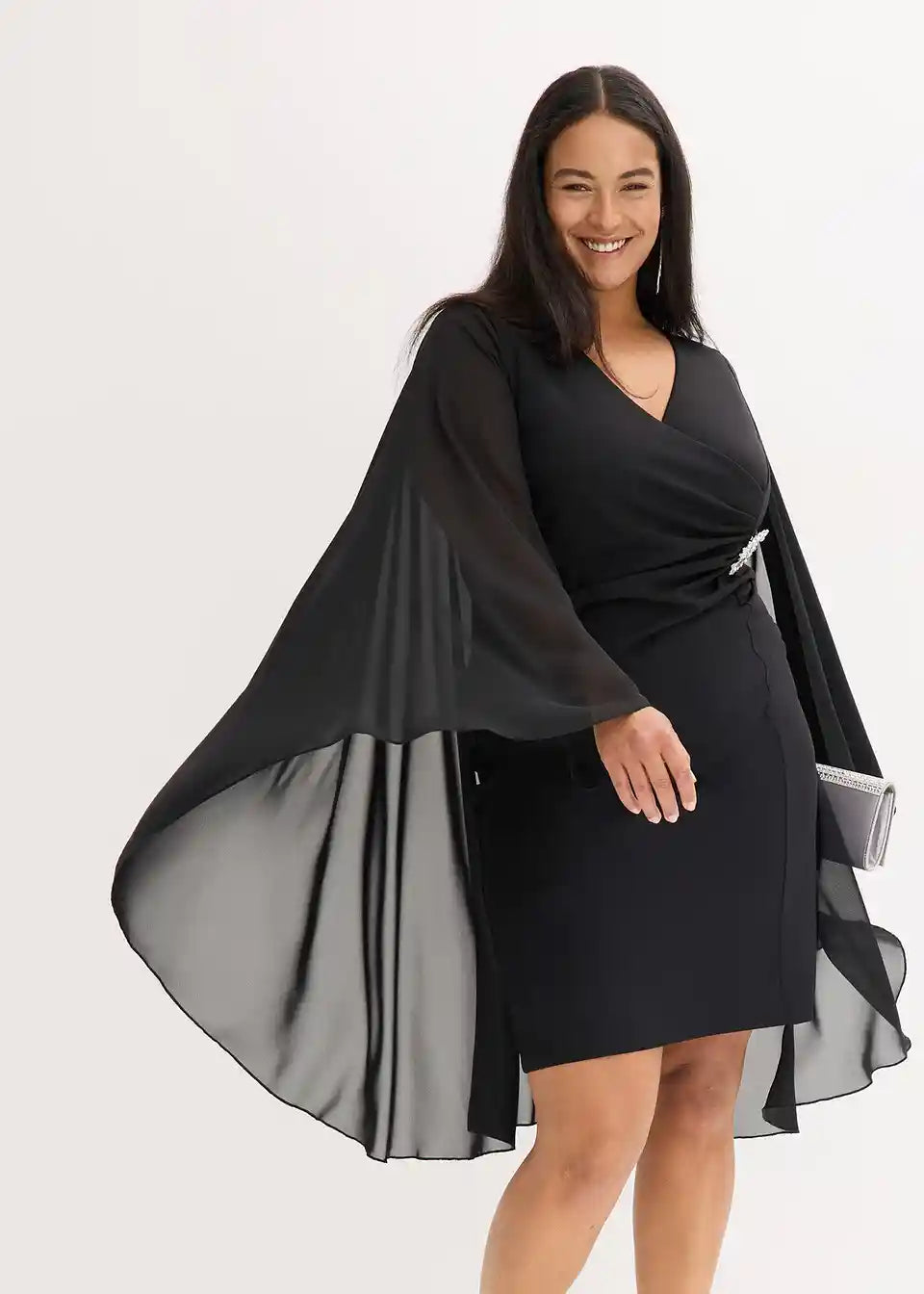 Moderno in ženstveno: mini obleka iz strukturiranega krepa s pončem iz finega šifona. Z drapiranjem in dodatkom v pasu je pravi magnet za poglede.