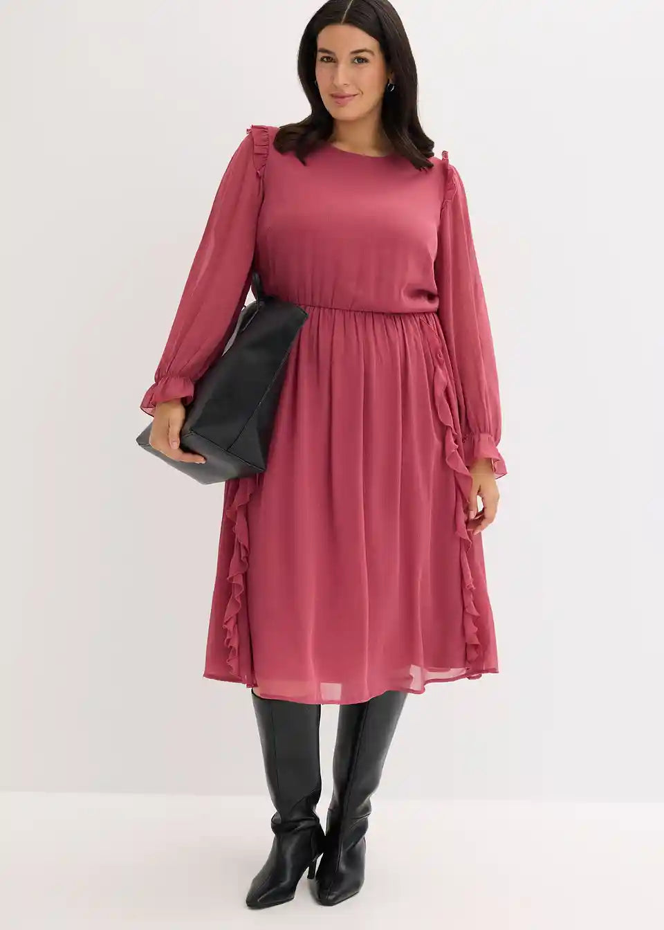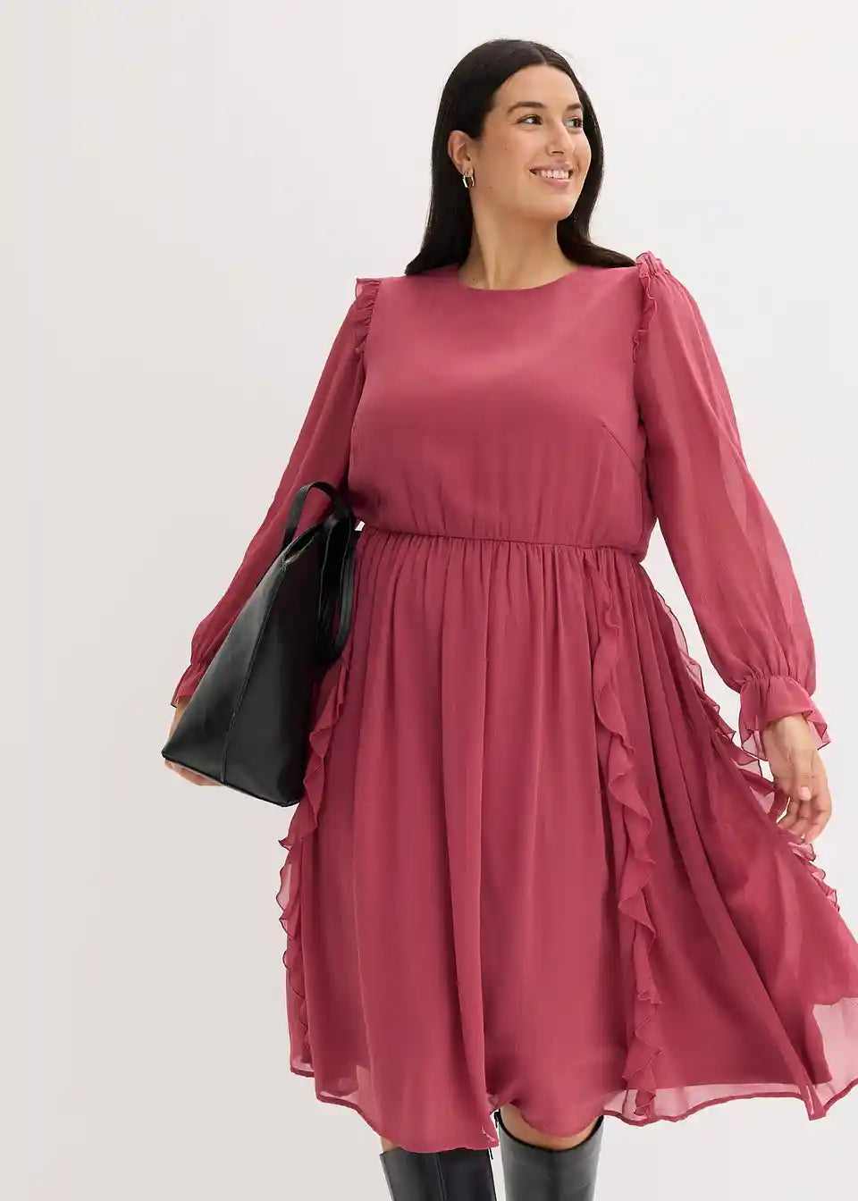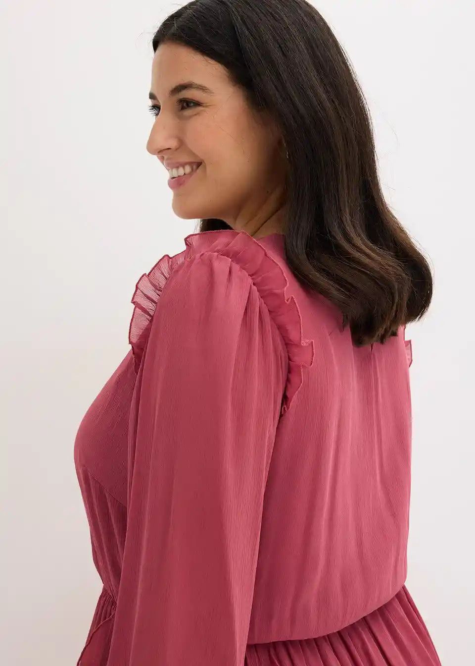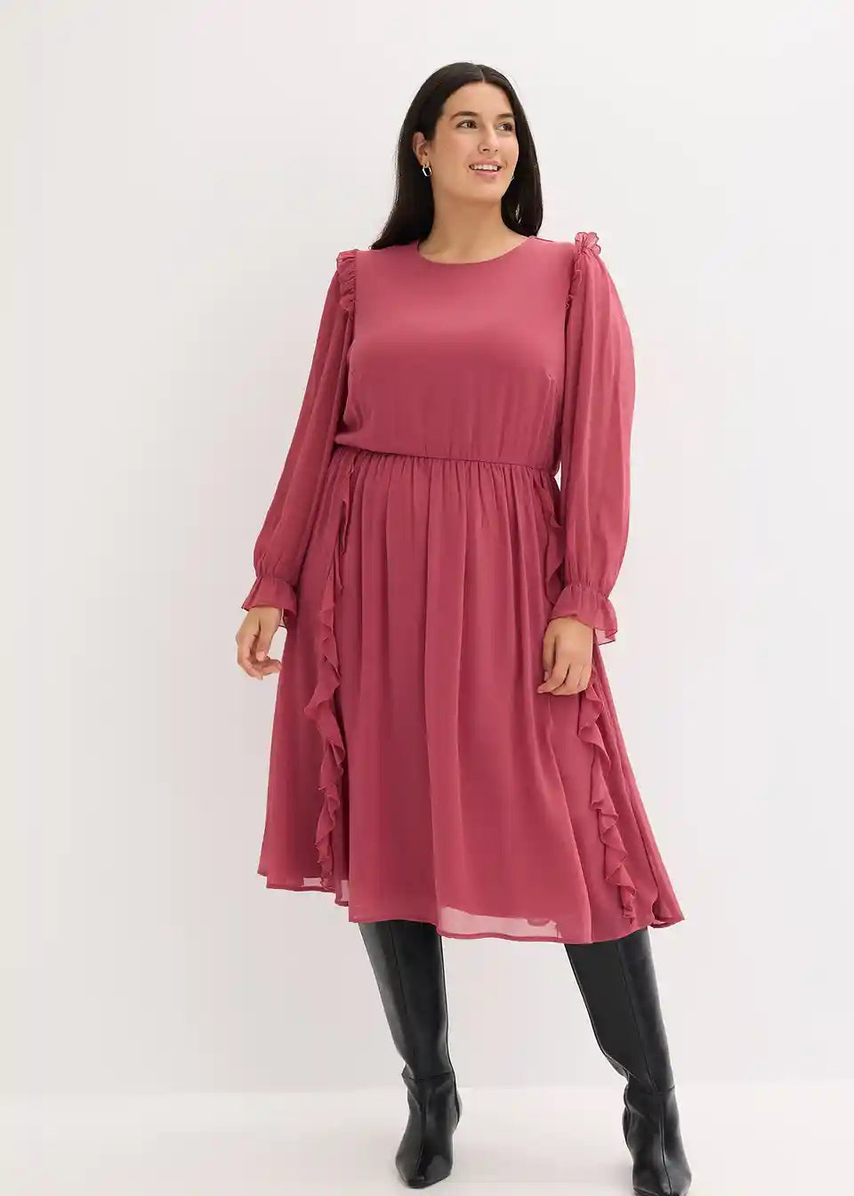 Ženstvena obleka iz šifona v midi dolžini z modnimi volani na ramah, na robu rokavov in na krilnem delu