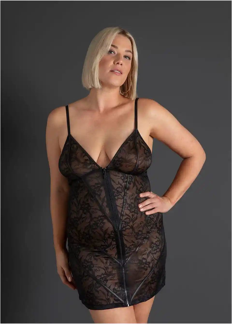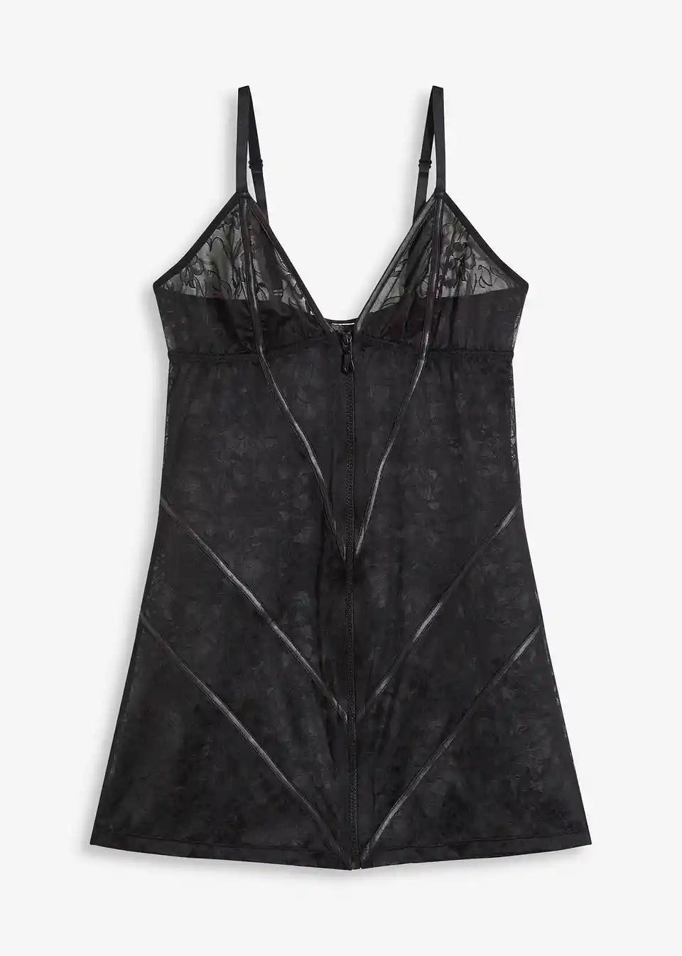 Obleka s čipko, zadrgo in okrasnimi šivi.