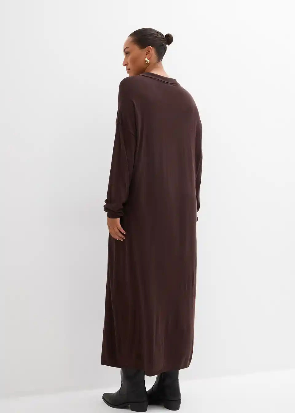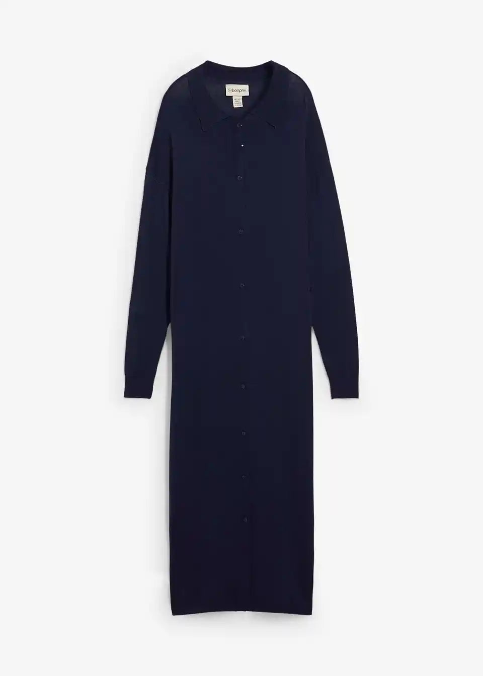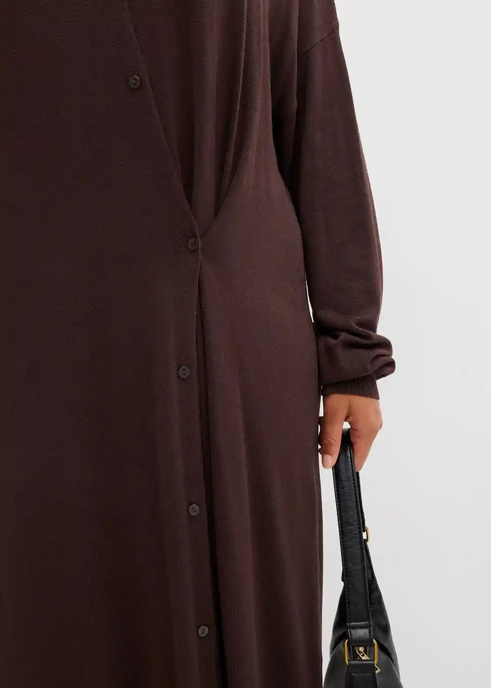 Fino pletena obleka z odprtim ovratnikom, z dolgimi rokavi in letvijo za zapenjanje spredaj