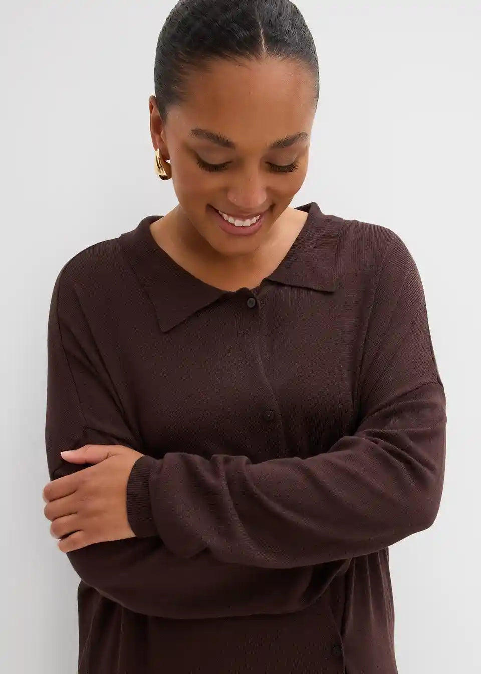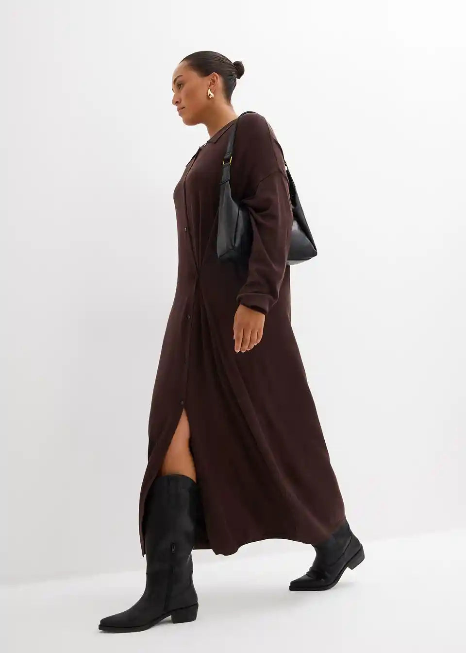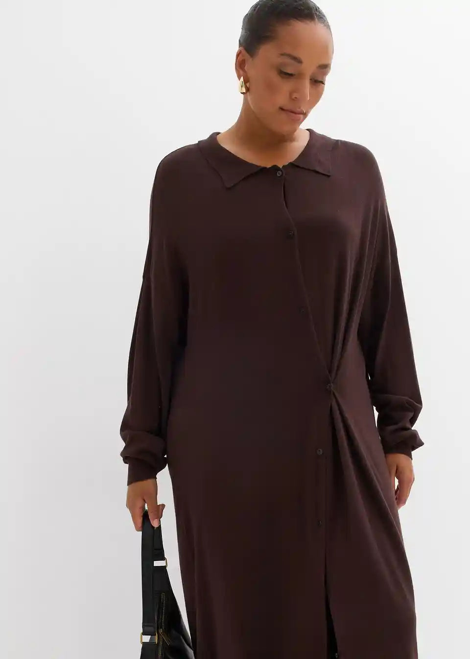 Fino pletena obleka z odprtim ovratnikom, z dolgimi rokavi in letvijo za zapenjanje spredaj