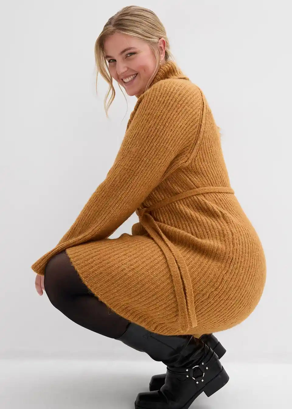 Kratka rebrasto pletena obleka s pokončnim ovratnikom