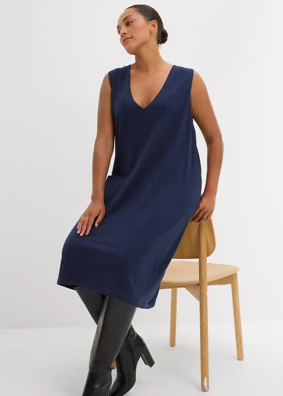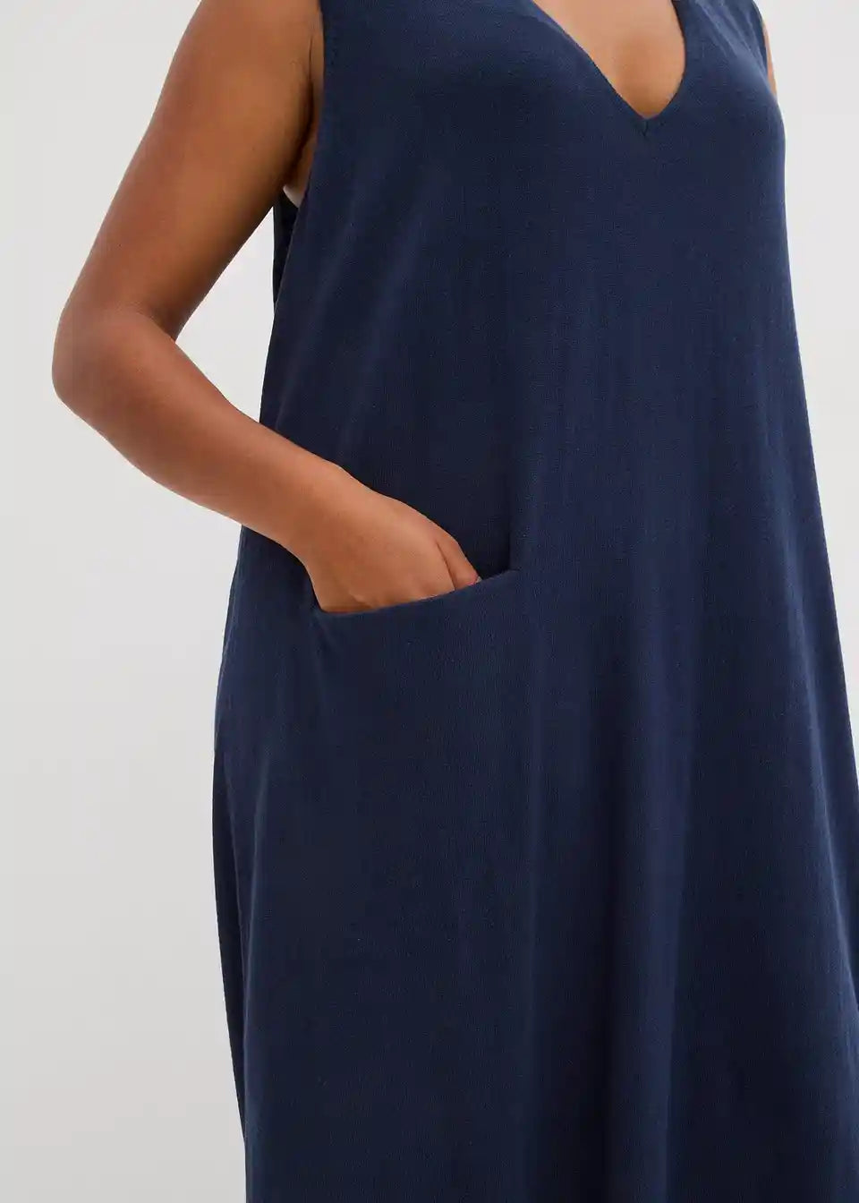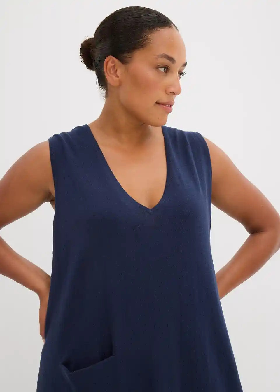 Dolga pletena obleka brez rokavov z V-izrezom iz čistega bombaža