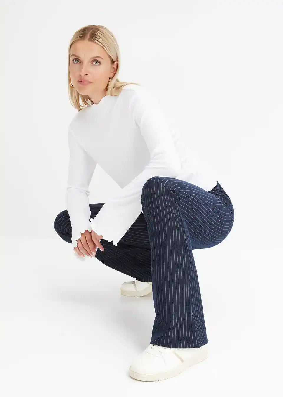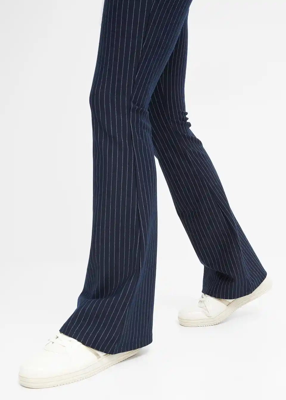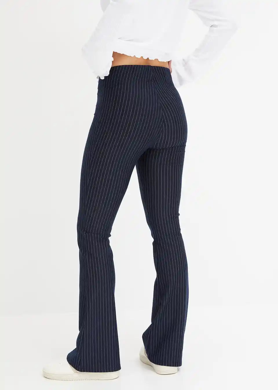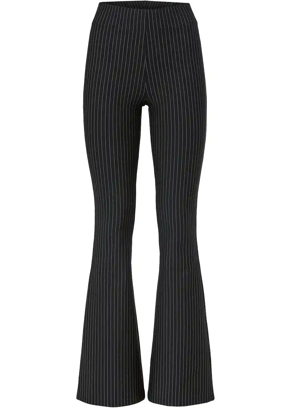 Hlače z razširjenim spodnjim robom brez zapenjanja s tankimi črtami