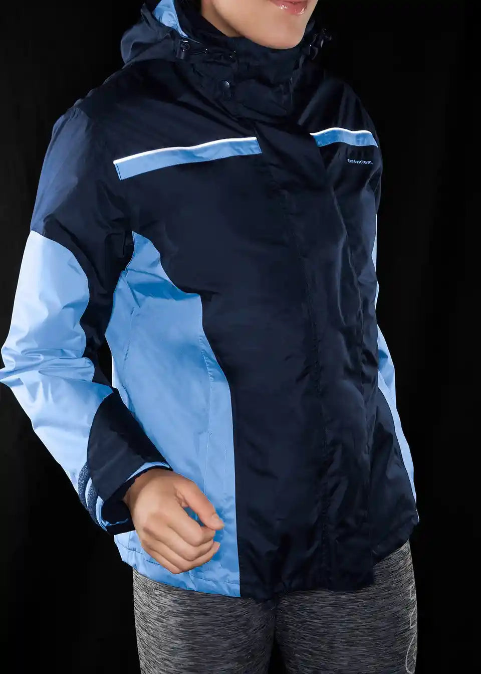 Praktična vremenska jakna 3v1 z zaprtimi žepi in šivi, ki poudarjajo postavo