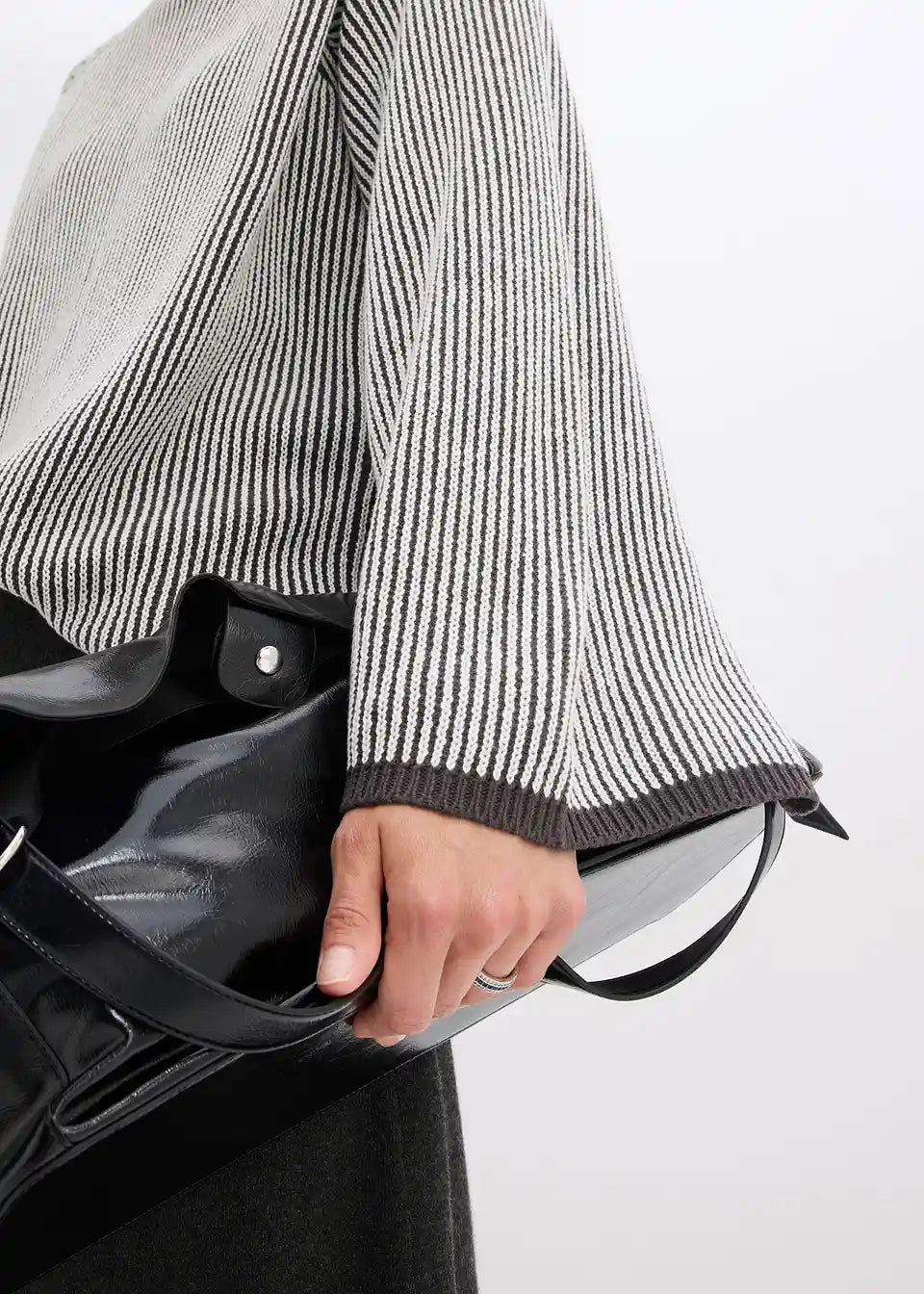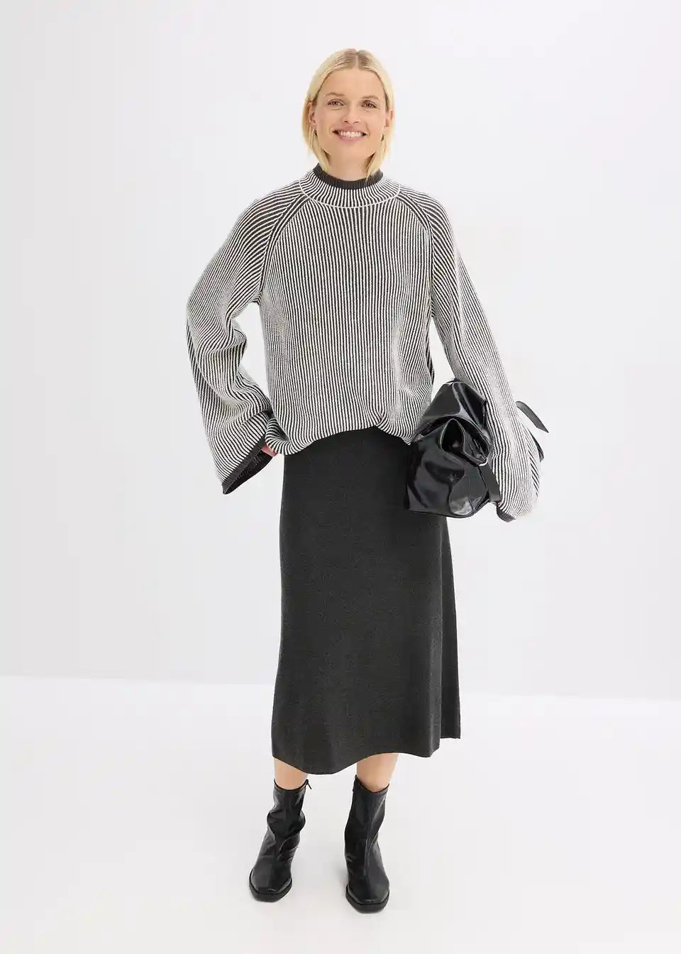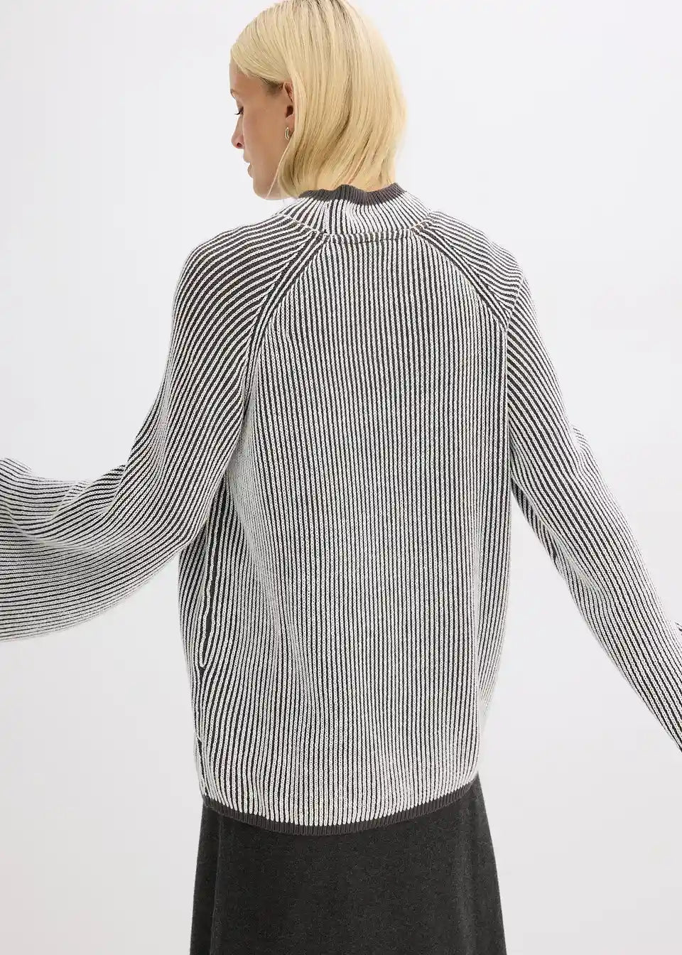 Ohlapen grobo pleten pulover s puli ovratnikom s črtastim vzorcem