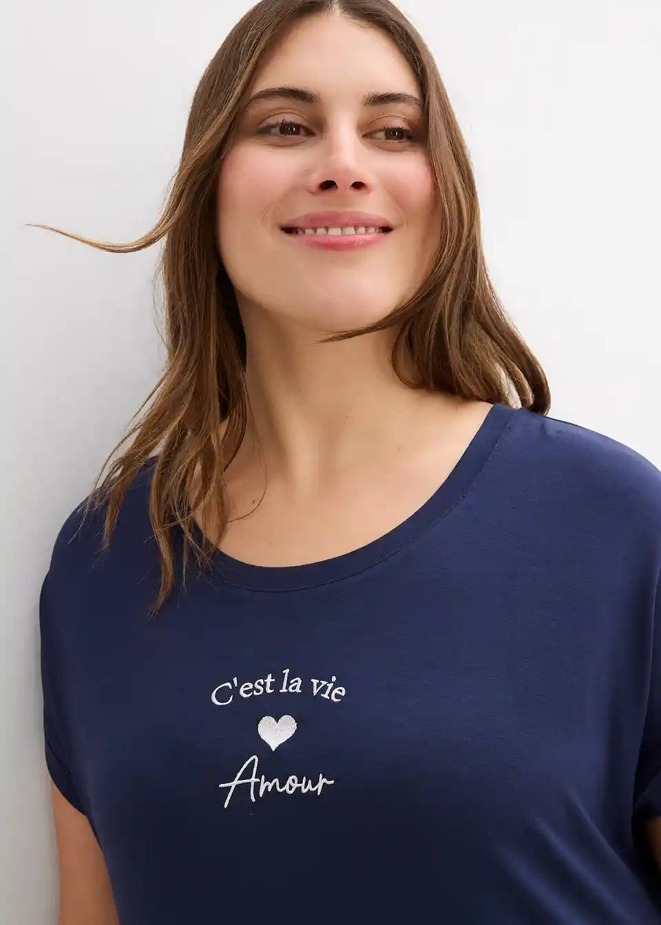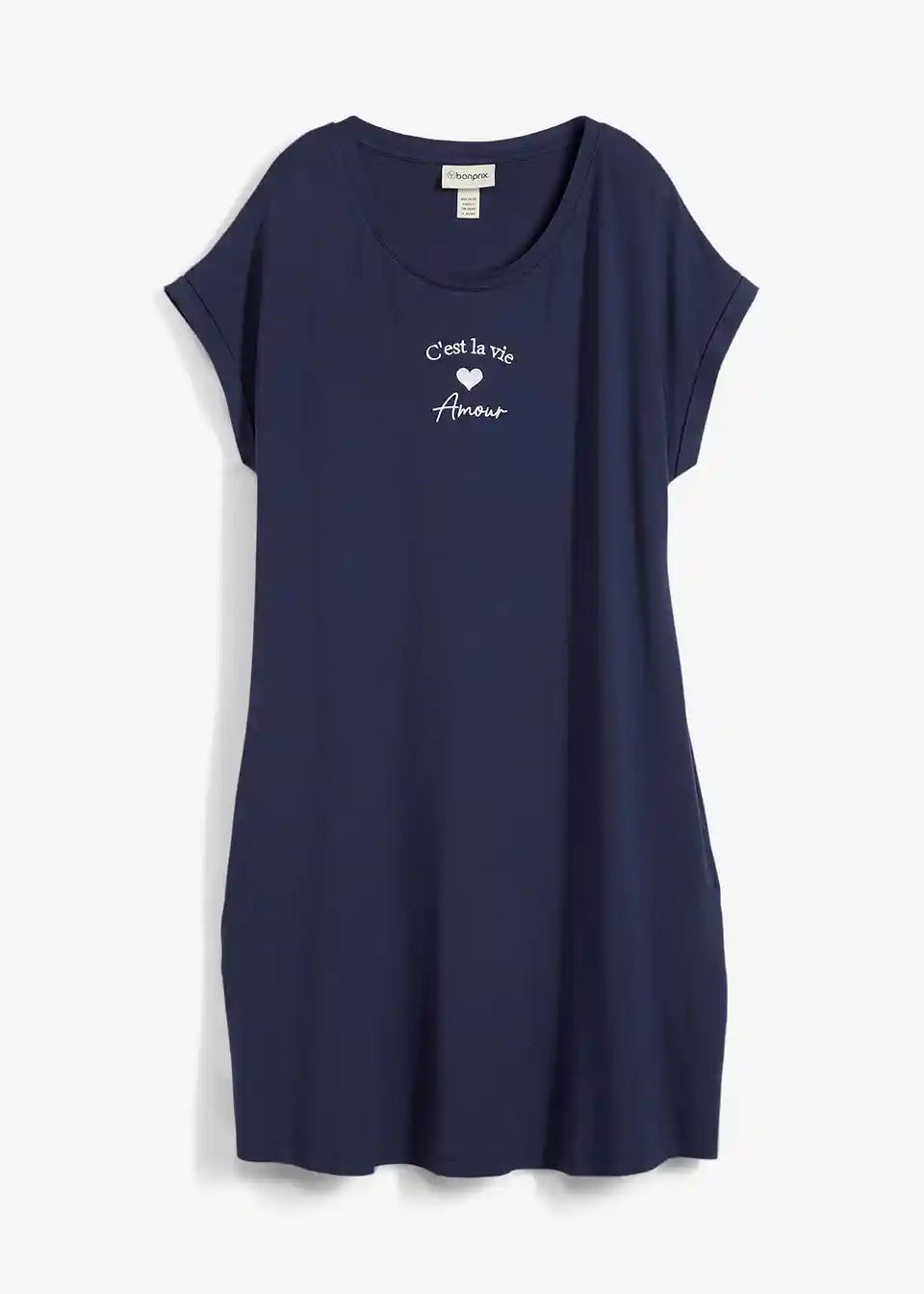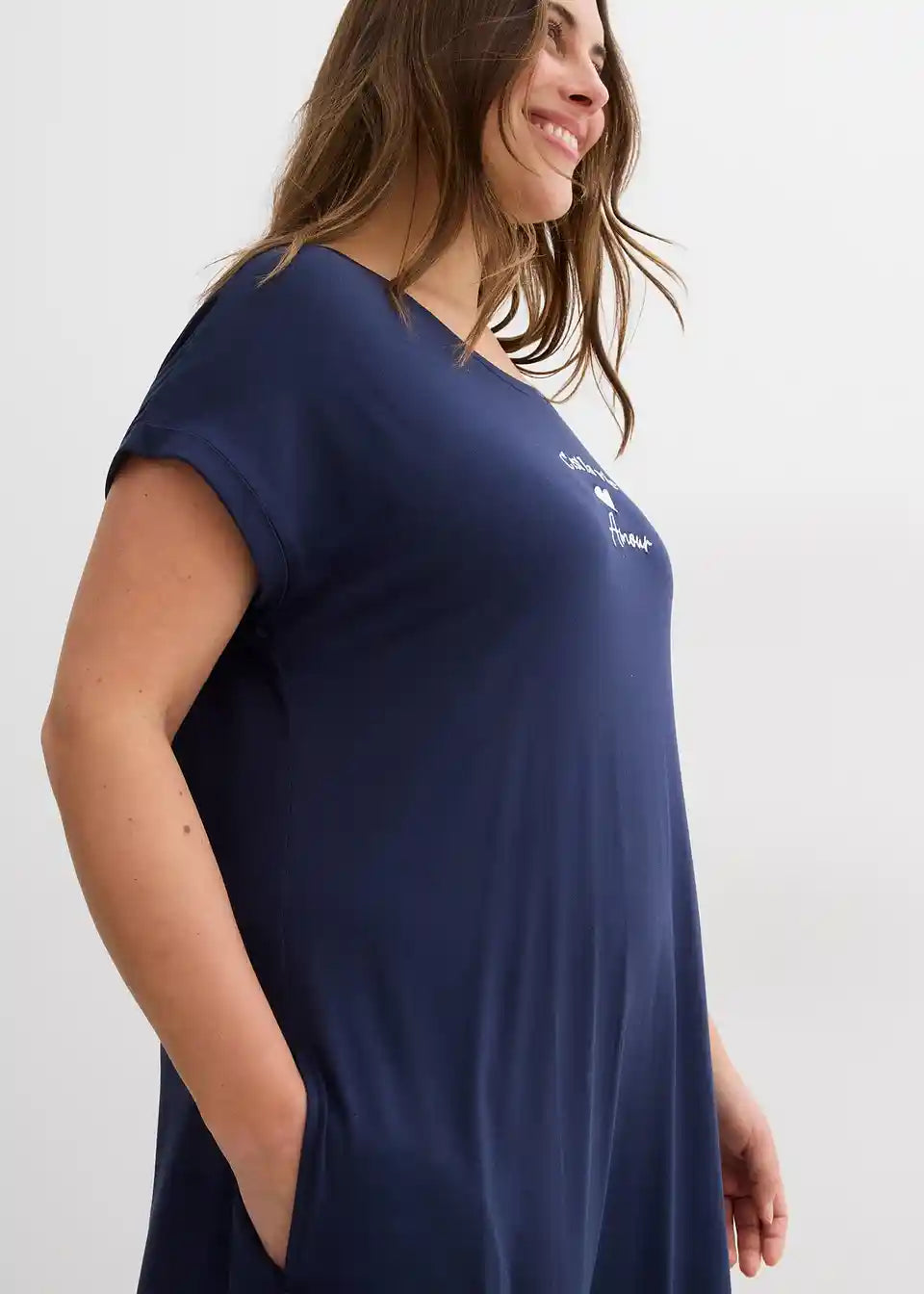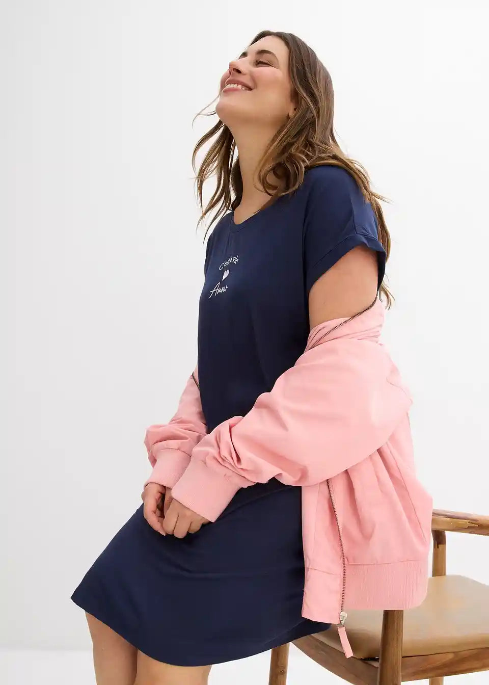 Obleka iz jerseyja z vezenino. Obleka z okroglim izrezom, v ohlapnem udobnem kroju z zaokroženim spodnjim robom