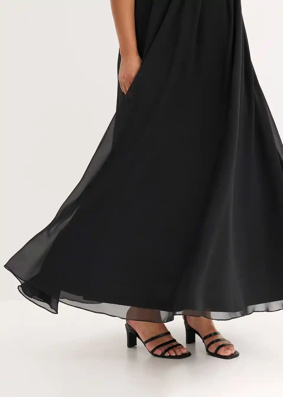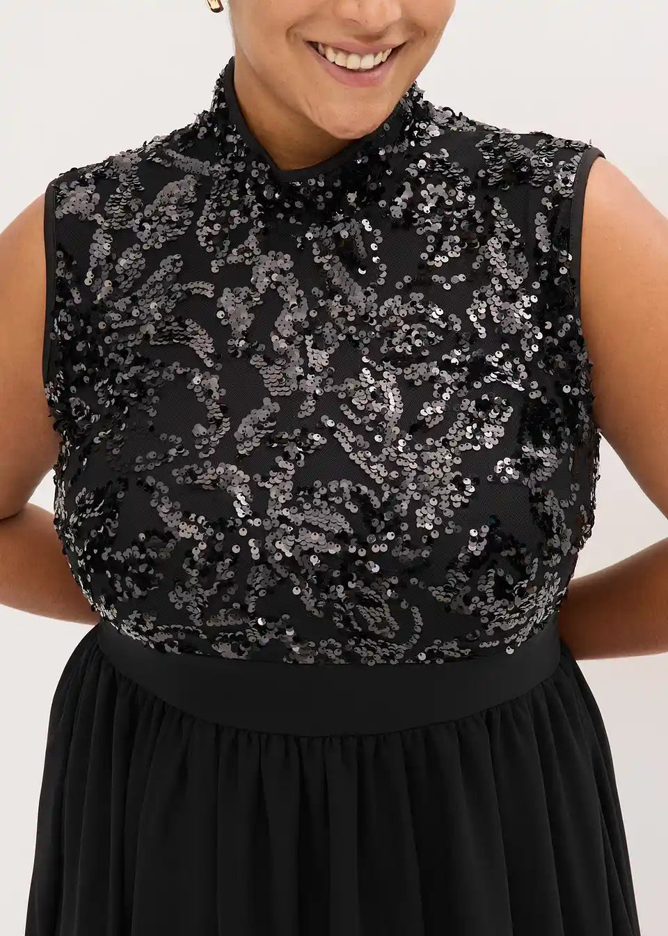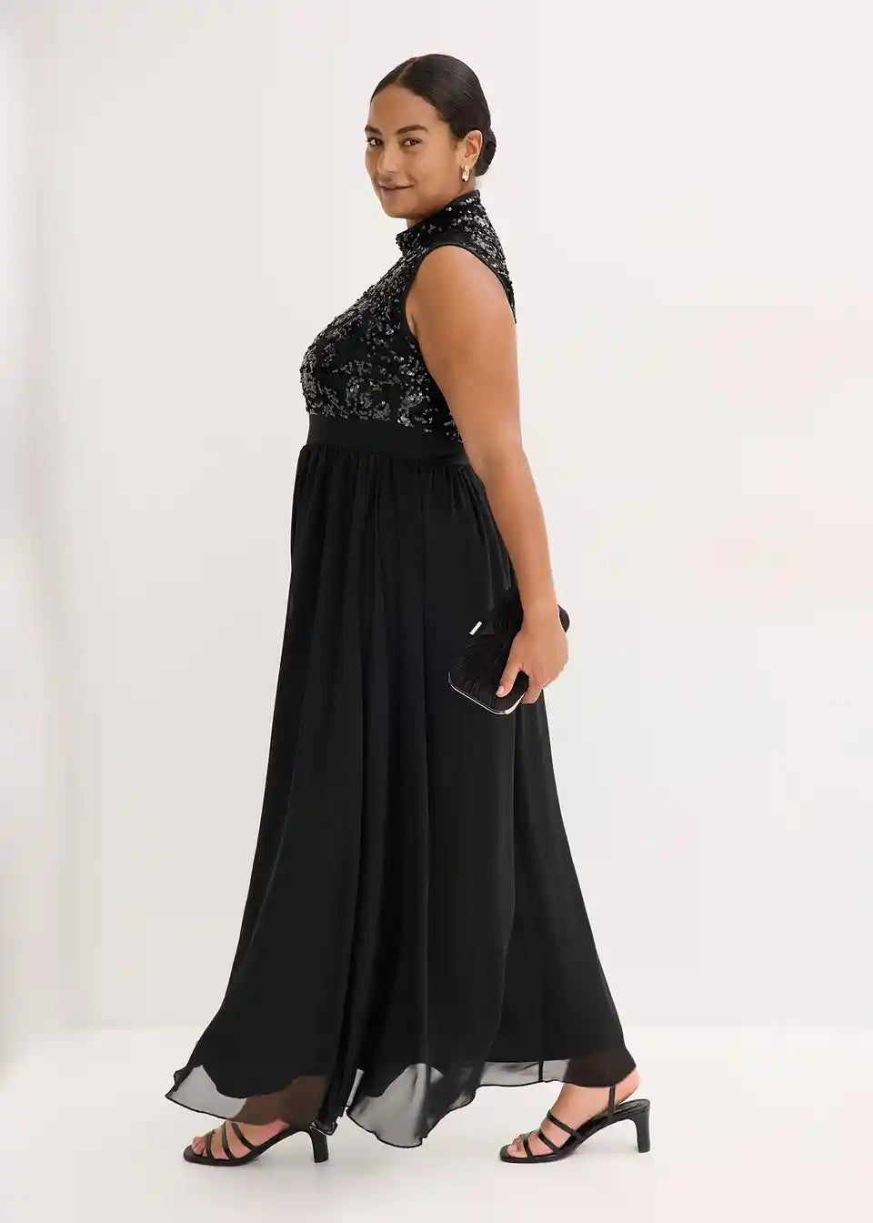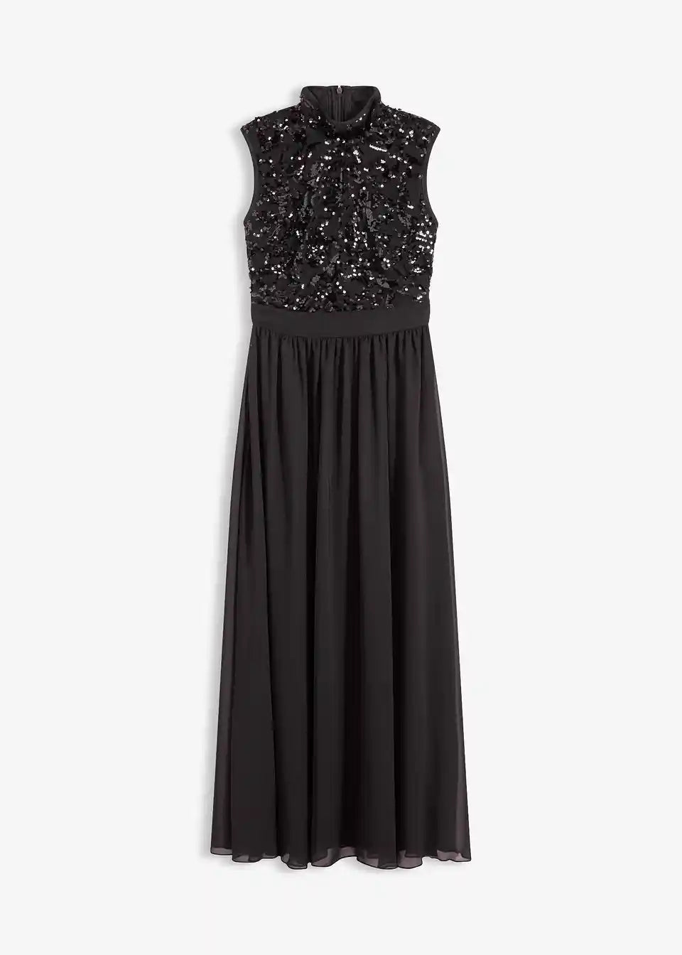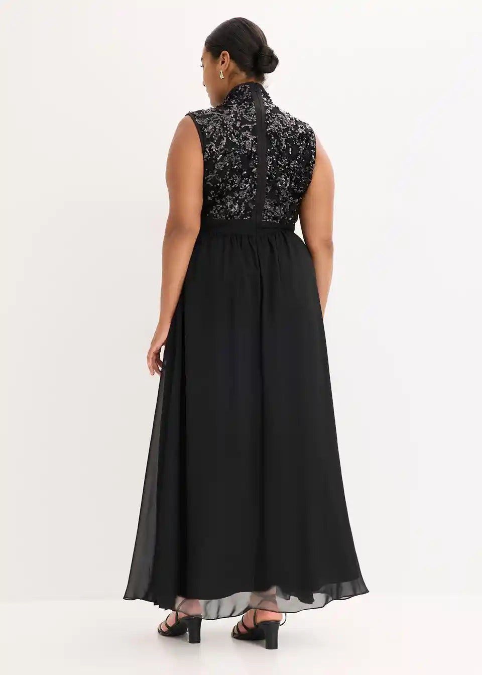 Moderna in ženstvena večerna obleka iz nežnega tila s pokončnim ovratnikom in vezenino iz bleščic v zgornjem delu